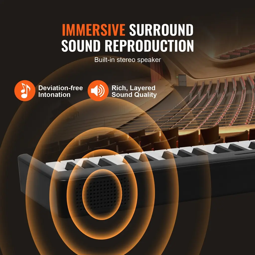 Ultra-Slim and Foldable Design: Our 88-key / 61-key portable piano keyboard features an ultra-thin body and a 180° foldable, lightweight design, making it incredibly easy to store and carry. With a built-in rechargeable lithium battery, it supports long-lasting usage, perfect for taking along wherever you go. 128 Standard Tones, Easy Teaching: Unlock the world of music with our foldable keyboard piano's capability to produce 128 different tones and international standard rhythms, along with 21 demo songs. From classical to contemporary, and everything in between, you can play various instrument sounds right from the keyboard. Perfect for exploring different musical genres and styles! Immersive Surround Sound: Our folding piano keyboard features dual-channel stereo speakers, providing rich and layered tones that faithfully reproduce the full spectrum of musical nuances. Experience true-to-life sound quality with accurate highs and deep lows. Adjustable Stand, Stable Support (for 88 Key option): Experience enhanced stability with our evenly balanced stand, designed to minimize the risk of your portable keyboard piano shaking or tipping. Adjustable from 21.3 to 31.5 inches (540-800 mm), it's tailored to fit different heights, ensuring a secure setup for your comfort and peace of mind. Illuminated Piano Keys (for 61 Key options): Discover our foldable piano featuring pressure-sensitive keys with captivating illuminated effects. It delivers an authentic piano-like finger touch and key depth, complemented by piano stickers for enhanced finger practice sessions. MIDI Functionality &Bluetooth 5.0 Connectivity: Effortlessly connect to your devices for seamless music editing. Utilize Bluetooth 5.0 to wirelessly connect with apps like Pop Piano and GarageBand, enhancing your learning and creative experience. Note: You can connect to a computer via the power cable and to a phone via Bluetooth. Package Content 1 x Portable Piano 1 x Piano Stand (only for 88 Key option) 1 x User Manual