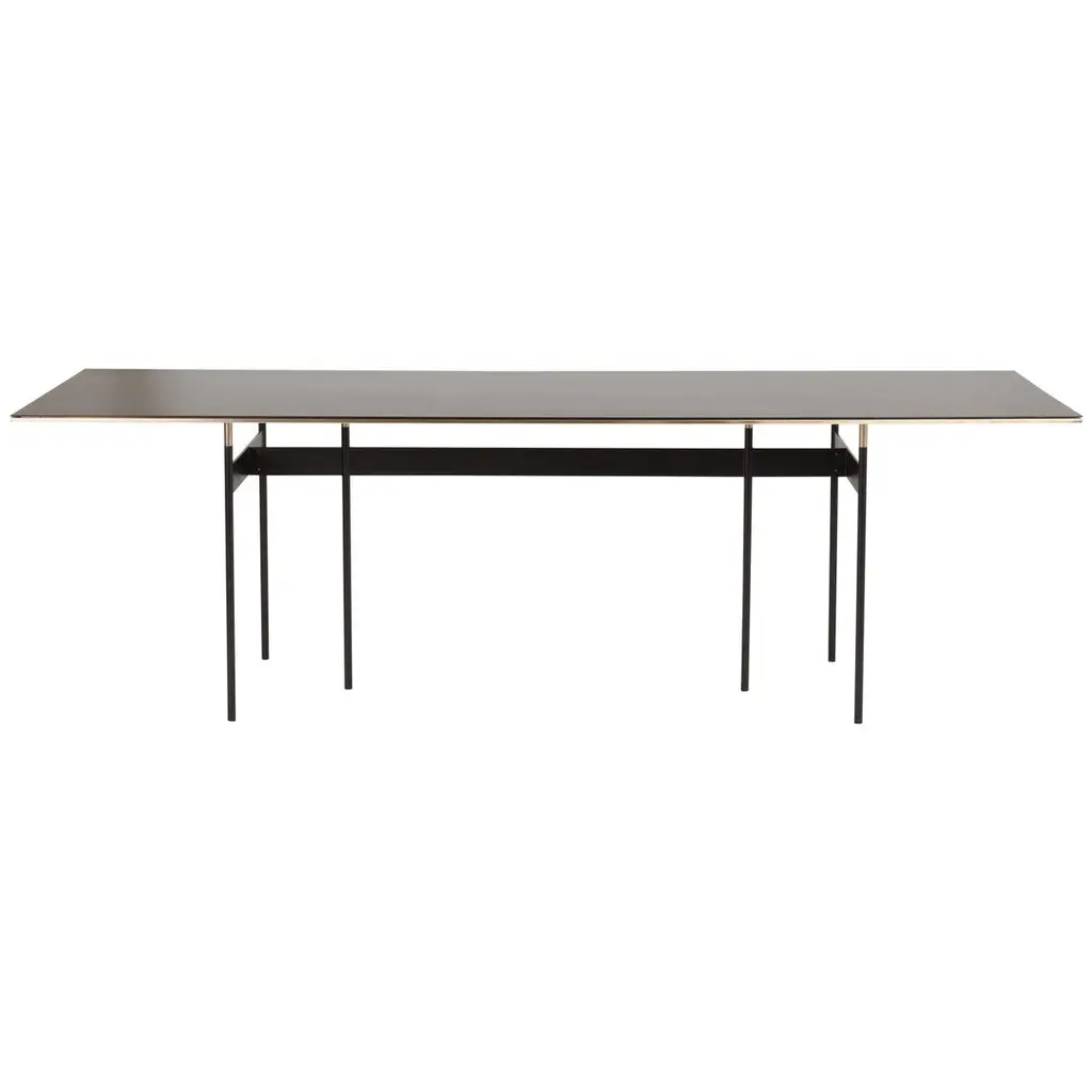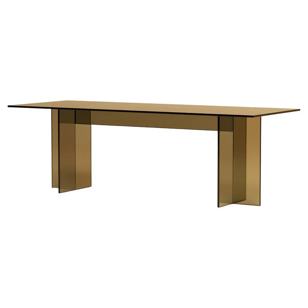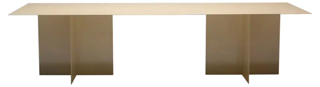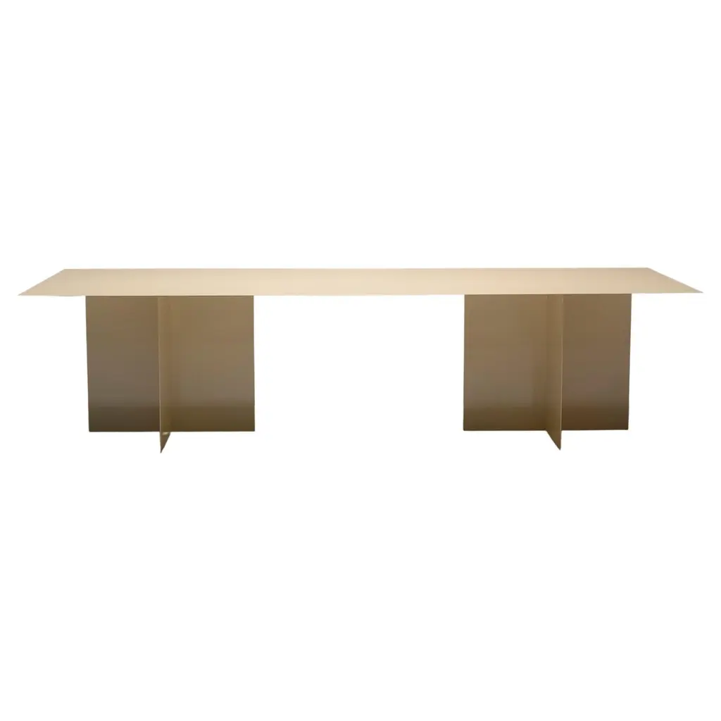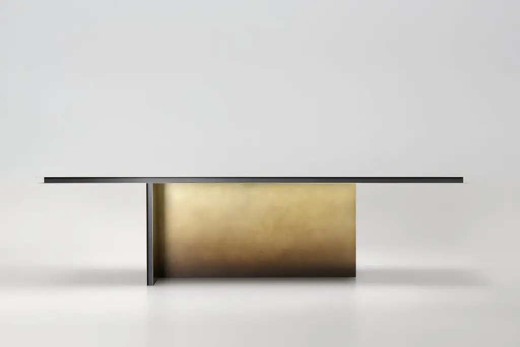 Folio Table by De CastelliDimensions: W 298 x D 110 x H 75 cmMaterials: Brushed BrassOther dimensions and versions are available. Please contact us for any request.The Folio table is a pure, precise shape characterised by perpendicular planes of brushed brass sheet metal. A rational sculpture that, thanks to the strength of its aesthetics, exalts the material in perfectly reflective surfaces. A scenic presence, as simple as it is bold, defines this table, made with thick brass sheets placed on parallel levels, an exclusive design choice that defines both the base and the large rectangular top. The equidistant sheets of metal punctuate the shape of Folio, giving rise to an interesting interplay of deep shadows, in contrast to the light reflected upon the horizontal plane.DE CASTELLI“HARD COUTURE”Faithful to its decision to reinstate the special role of metal in design and experimentation, De Castelli infuses artisan ideas and workmanship into industrial processes, leading to entirely original results. The encounter with design inspires an approach to materials founded upon respect for their potential, be it hidden or obvious, which emerges slowly in a collection of pieces that, despite being part of a series, remain unique.Unique not only for the hand that has created them, but also for the singular cultural path that focuses on the aesthetic (and not just practical) value of the primordial material with which De Castelli shapes living spaces.A BESPOKE APPROACHEach object, even in the repetition of form, is a creative act in and of itself, one that incorporates a heritage of constantly-evolving expertise and research. The equation that relegates ‘cold’ metals to the margins of furnishing projects is thus overturned, bringing iron, brass and copper, in their infinite variations and finishes, to the centre of an entirely renewed stage, allowing them to finally shine with their own light.SUSTAINABILITYDe Castelli has always been committed to making the entire production cycle increasingly sustainable, aware that metal, the material with which its business identifies itself, is precious and must be treated with care, without waste.PEOPLE FIRSTThe wide spaces of the De Castelli headquarters in Crocetta del Montello (TV) allow those who work to enjoy environments where order, cleanliness and safety are always maintained and guaranteed. An attitude of attention and respect for people that has led to the shared ethical code.