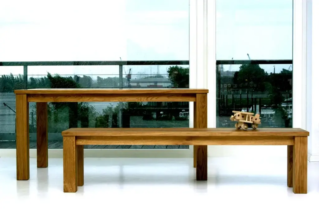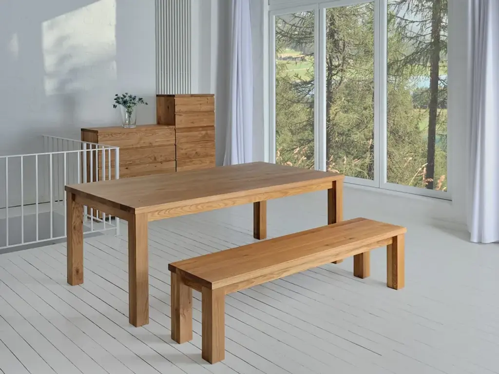 Table in solid sustainable. The young vitamin design label manufactures furniture which breathes, lives and is simply unique. The pure concept and the clear, distinct forms will immediately catch your eye. Individuality and accuracy are the cornerstones of the company’s philosophy that have been combined under the slogan THINK GREEN. Consequently all the models are sustainable in every respect. This also refers to the use of wood types from where possible sustainable forestries, the ecological manufacture and the careful surface treatment with natural oils. It is not surprising that the tables, benches, chairs, dressers, wardrobes, and beds from vitamin design succeed in realizing what much solid wood furniture is striving for – to give the feeling of warmth. Cosiness with sustainability.Standard table height: 75 cm. Custom made. Available in different sizes as required.