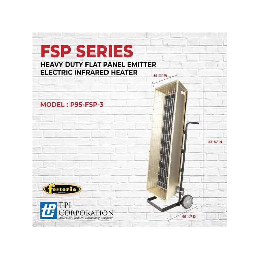 Fostoria Portable Infrared Heater, Flat Panel Emitter, w/Cart 9500W, 480V, 3PH, 11.4A, 32414-BTUs, Medium Wave EIR, w.15ft lg cord, Overall Height 53 3/4 in, Overall Length 16 1/4 in, Overall Width 19 3/4 in, Overall Depth 16 1/4 in, Phase 1, Voltage 480V AC, Wattage Output 9550 W, Beam Pattern 60 Degrees , Element Type Flat Panel Emitter, Housing Color Gold/Black, Housing Material Aluminum, Mounting Type Portable, Grille Depth 1/8 in, Grille Height 49 in, Grille Width 19 3/4 in