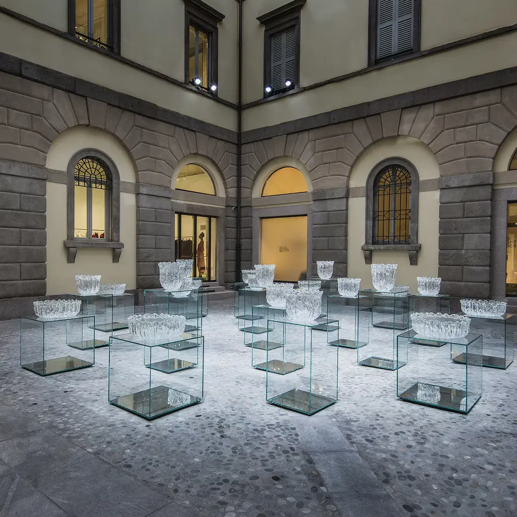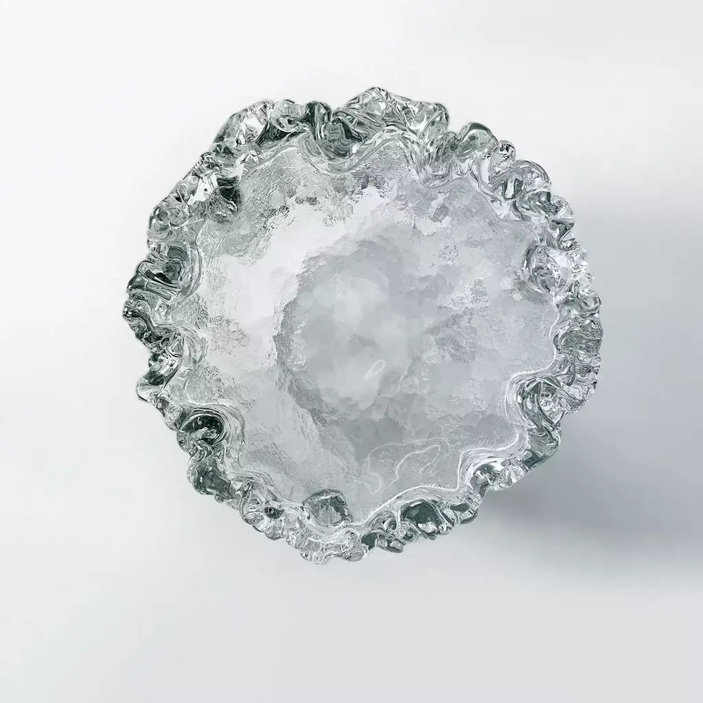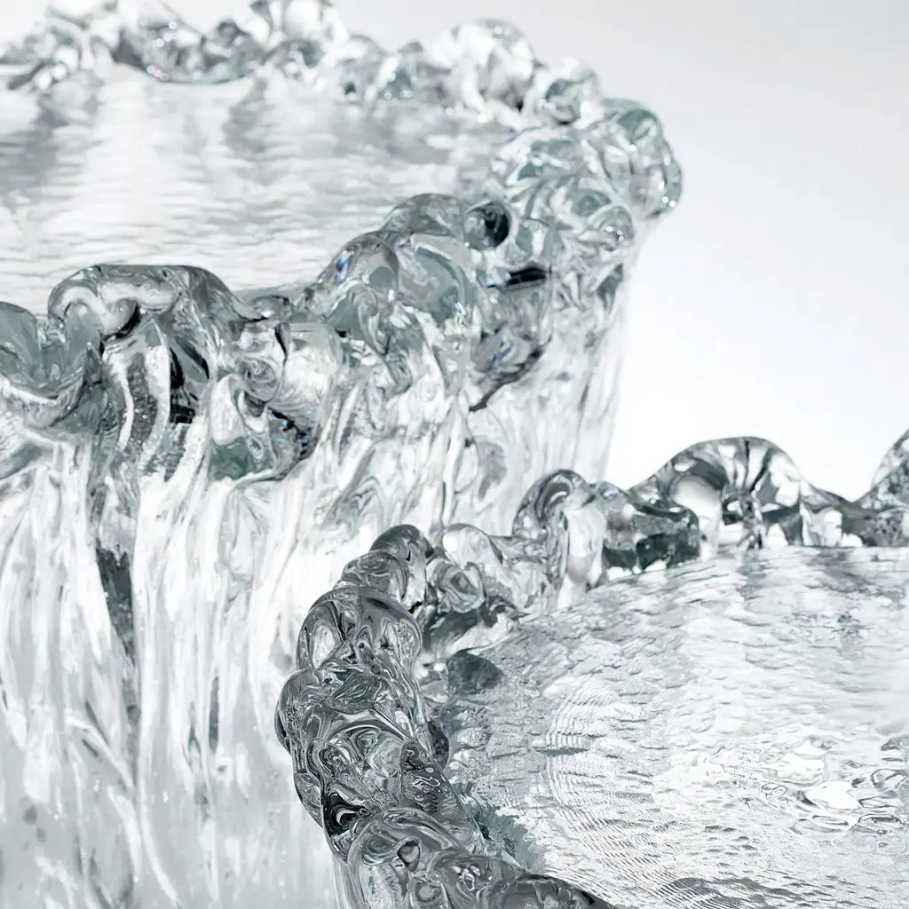 Designed to emulate an image of glistening water flowing in constant motion from a spring, this Murano glass table by Japanese designer Tokujin Yoshioka is a superb work of art. The poured glass is shaped by hand and meticulously chiseled to reproduce the irregular rivulets that define the rounded base, while the flat top is carefully placed inside reflecting glittering sparkle in the surrounding space.