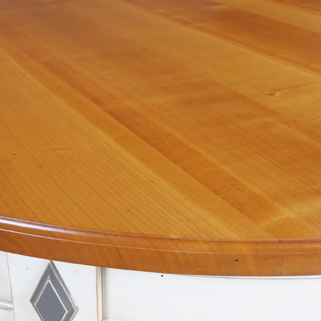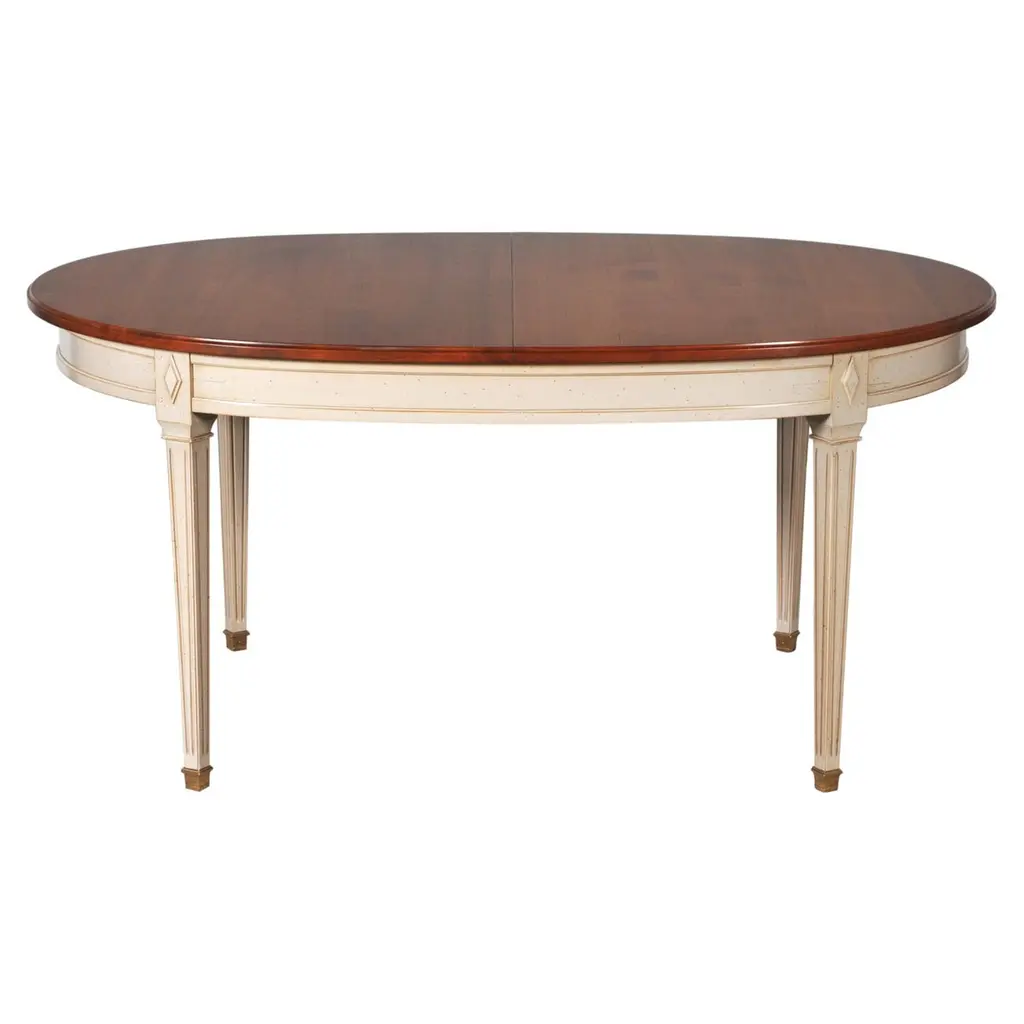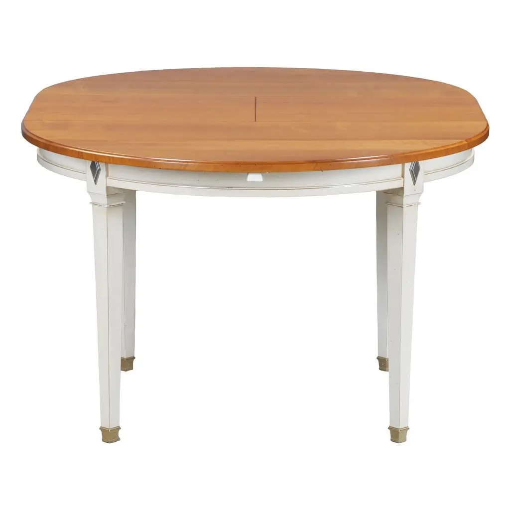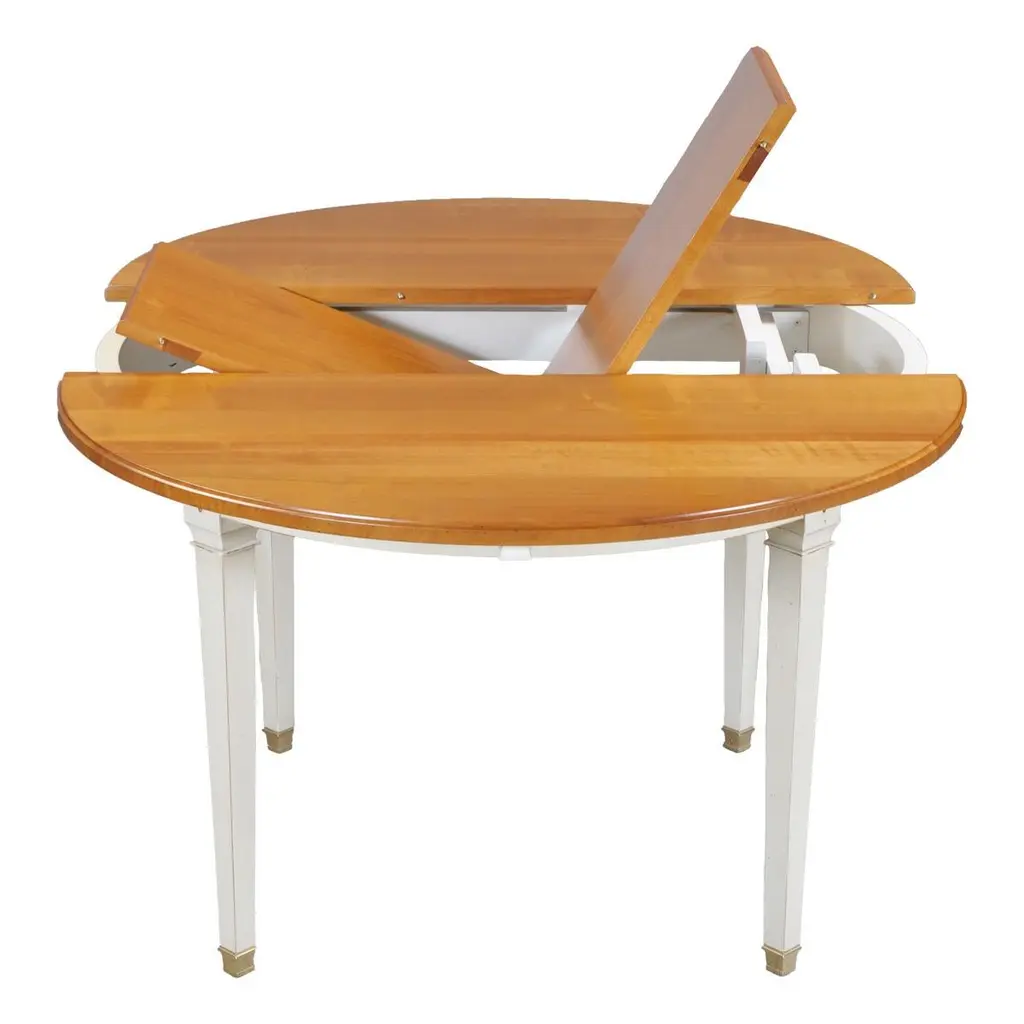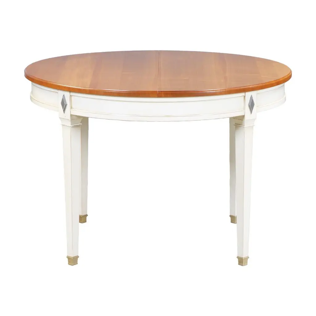 This piece belongs to our DIRECTOIRE collection, which takes up the Directoire style, very famous at the end of the 18th century in France.It is remarkable for its straight, classic and timeless lines, sometimes enhanced with grooves or diamonds on the front or feet.This table is a handcrafted reproduction modernized with 1 integrated leaf under the top. The extension is of 40 cm / 15.75" wide.The top separates itself in the middle by pulling one side apart for an easy and synchronized opening of the extensions.The height under the skirt is 64 cm / 25.2"The finish is made of a blond cherry stain for the top and the extension + 3 layers of white-cream lacquer for the skirt and the feet + a mole grey lacquer for the diamonds on the the feet with a satin varnish. GONTIERis a cabinetmaker's furniture brand established since 1920 in Mayenne, France.It now belongs to the company MON PETIT MEUBLE FRANÇAIS.The manufacture of each piece of furniture remains artisanal, 100% French and of high-end quality.The solid wood comes from sustainably managed French forests, PEFC certified.We offer a 5 year warranty on every piece of furniture.As proof of their authenticity and uniqueness, our furniture is burnt with a "G" hallmark.