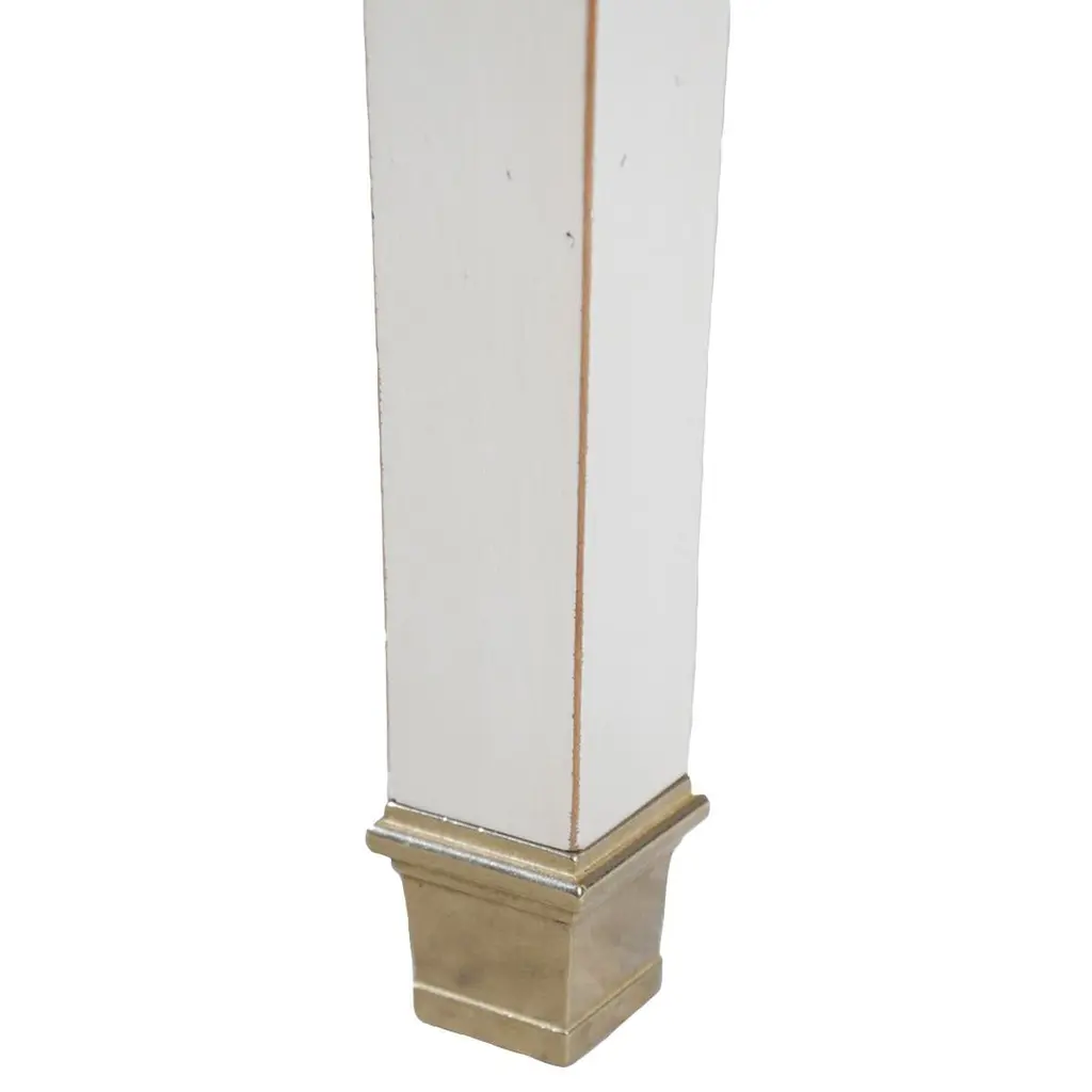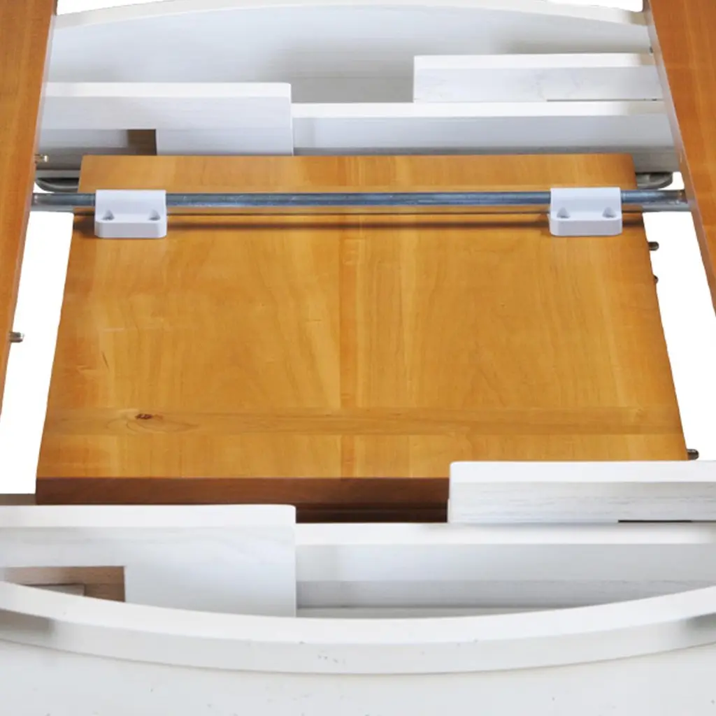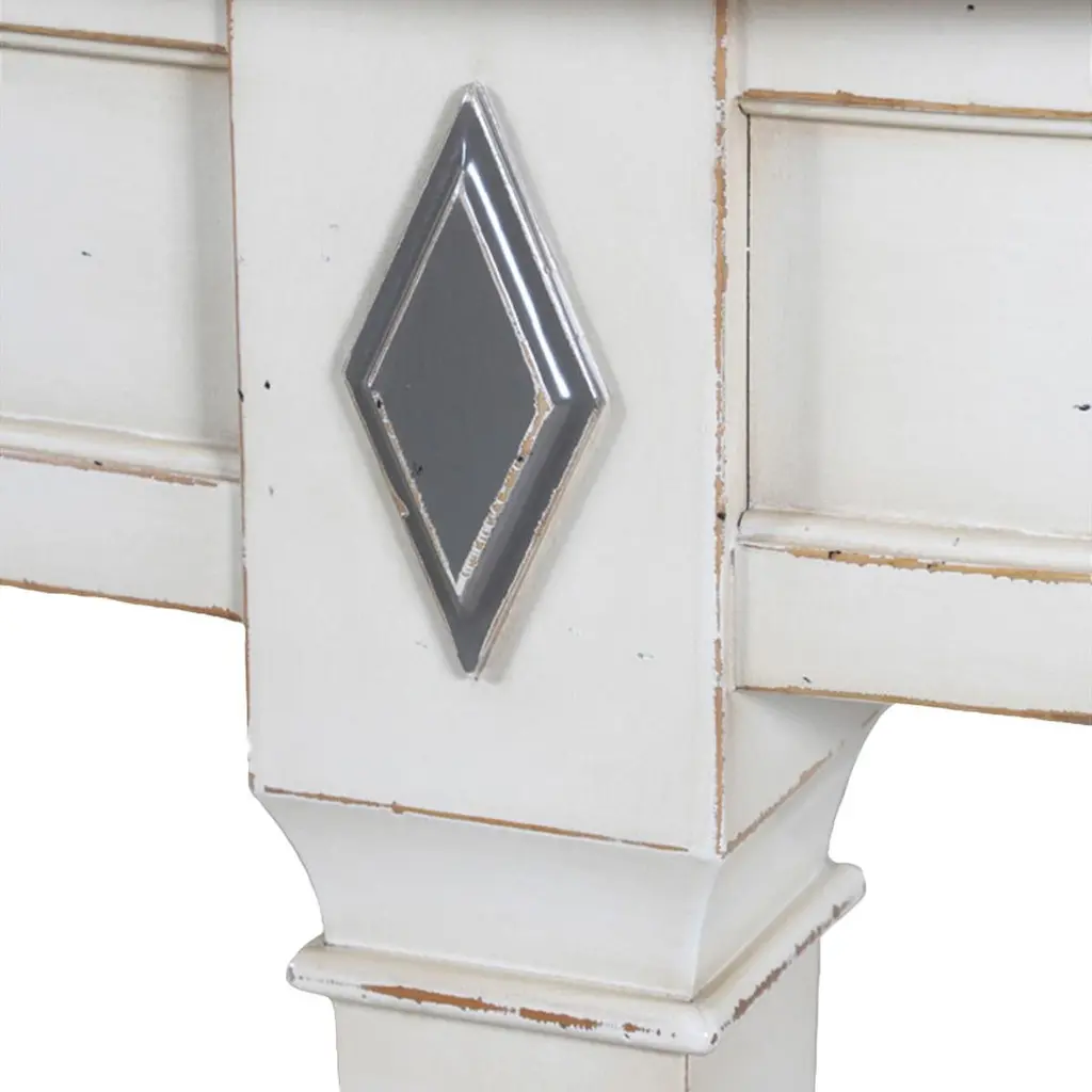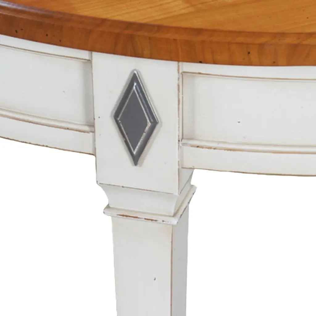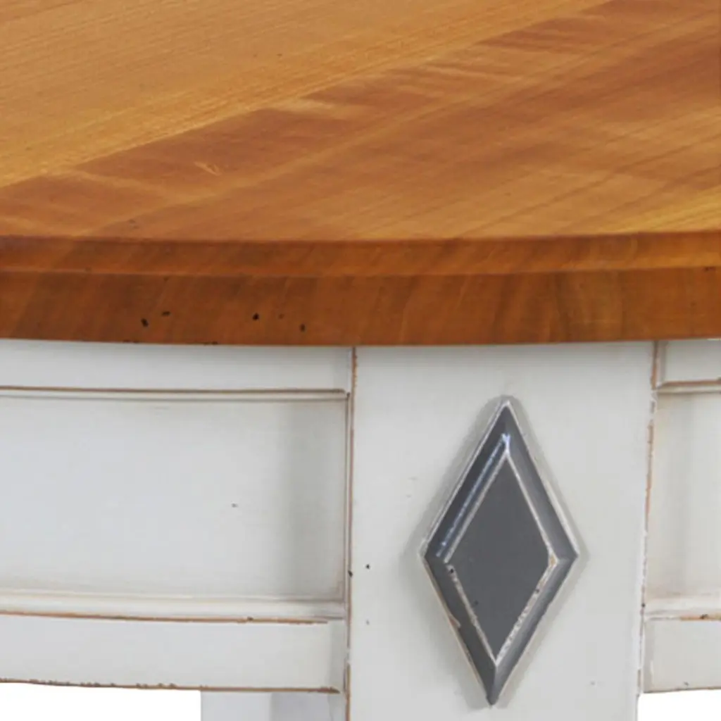 This piece belongs to our DIRECTOIRE collection, which takes up the Directoire style, very famous at the end of the 18th century in France.It is remarkable for its straight, classic and timeless lines, sometimes enhanced with grooves or diamonds on the front or feet.This table is a handcrafted reproduction modernized with 1 integrated leaf under the top. The extension is of 40 cm / 15.75" wide.The top separates itself in the middle by pulling one side apart for an easy and synchronized opening of the extensions.The height under the skirt is 64 cm / 25.2"The finish is made of a blond cherry stain for the top and the extension + 3 layers of white-cream lacquer for the skirt and the feet + a mole grey lacquer for the diamonds on the the feet with a satin varnish. GONTIERis a cabinetmaker's furniture brand established since 1920 in Mayenne, France.It now belongs to the company MON PETIT MEUBLE FRANÇAIS.The manufacture of each piece of furniture remains artisanal, 100% French and of high-end quality.The solid wood comes from sustainably managed French forests, PEFC certified.We offer a 5 year warranty on every piece of furniture.As proof of their authenticity and uniqueness, our furniture is burnt with a "G" hallmark.