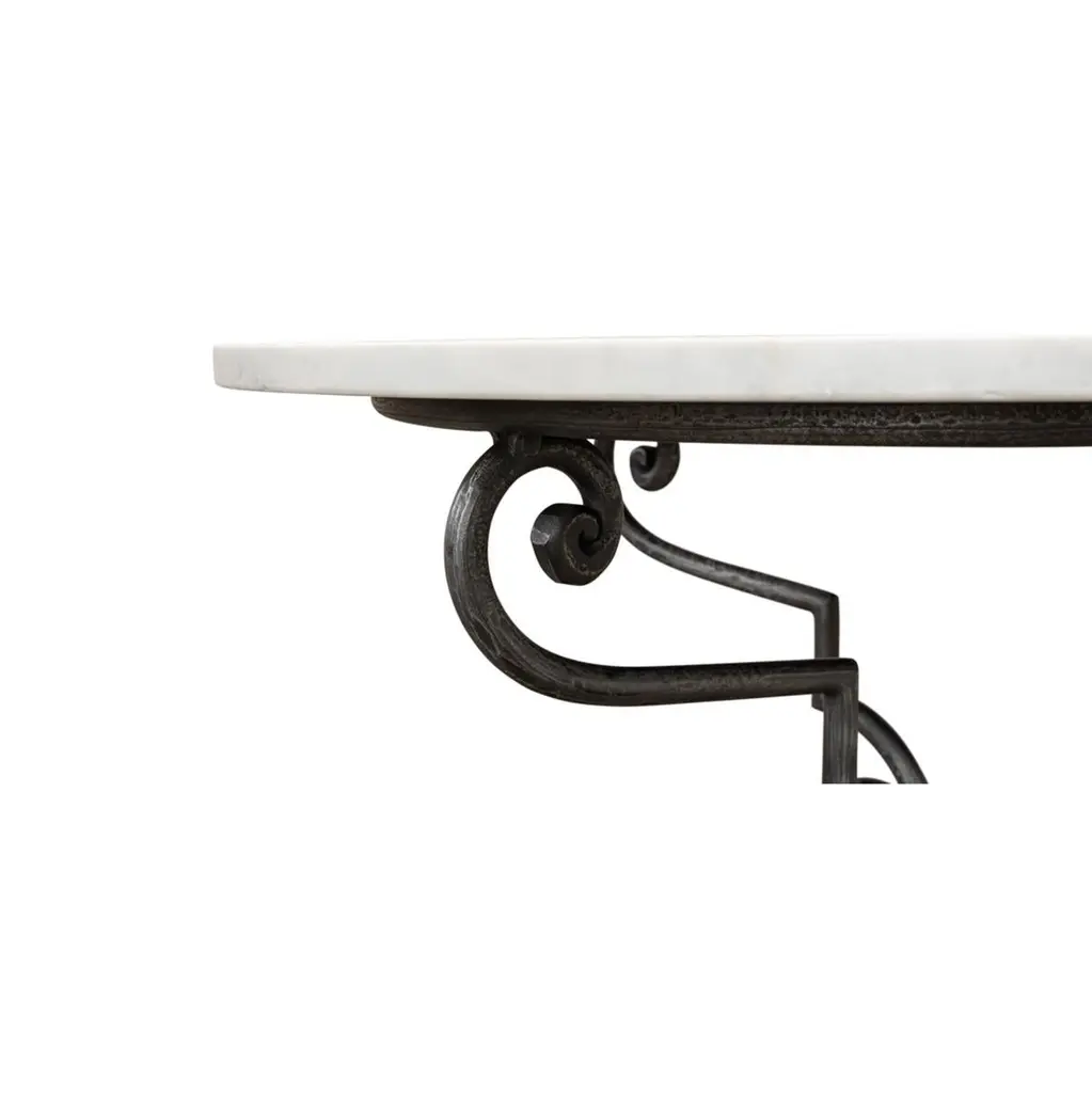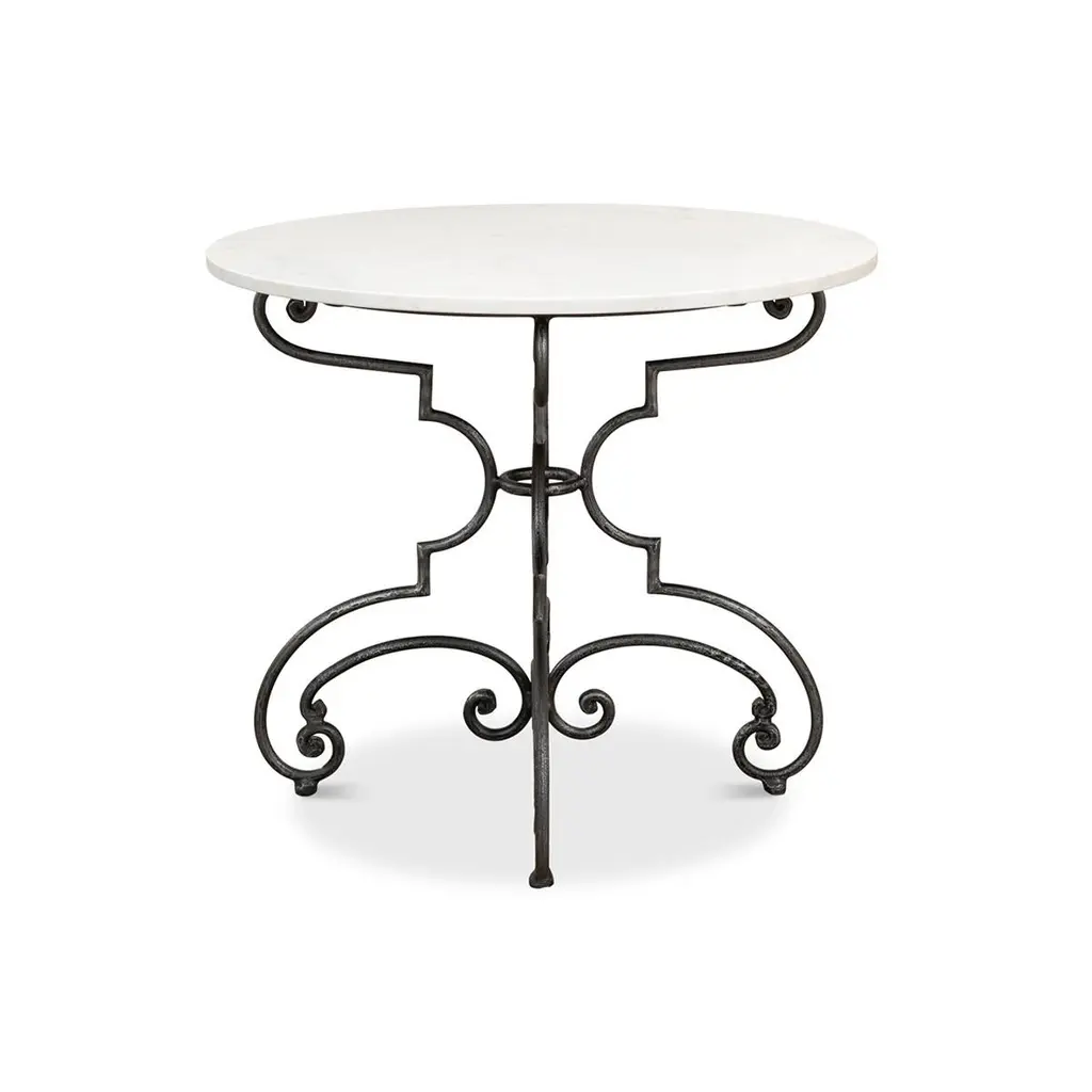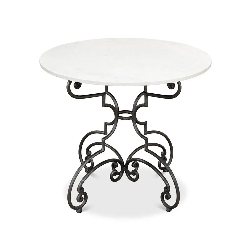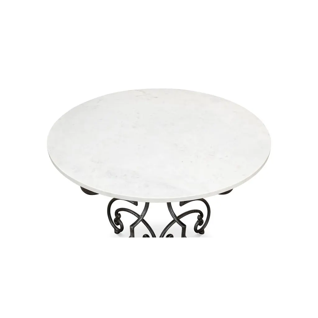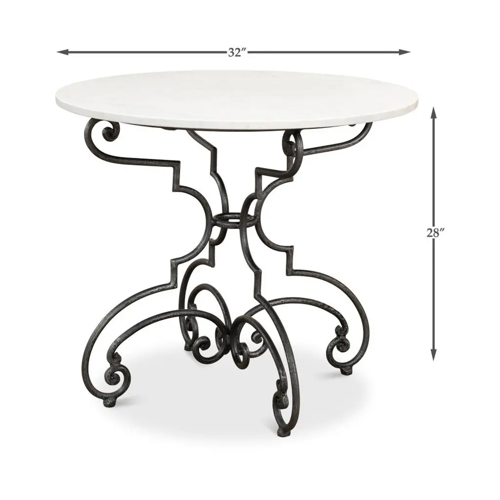 French country-style round table with a classic white marble top on a hand-forged iron base.Dimensions: 32" W x 32" D x 28" H