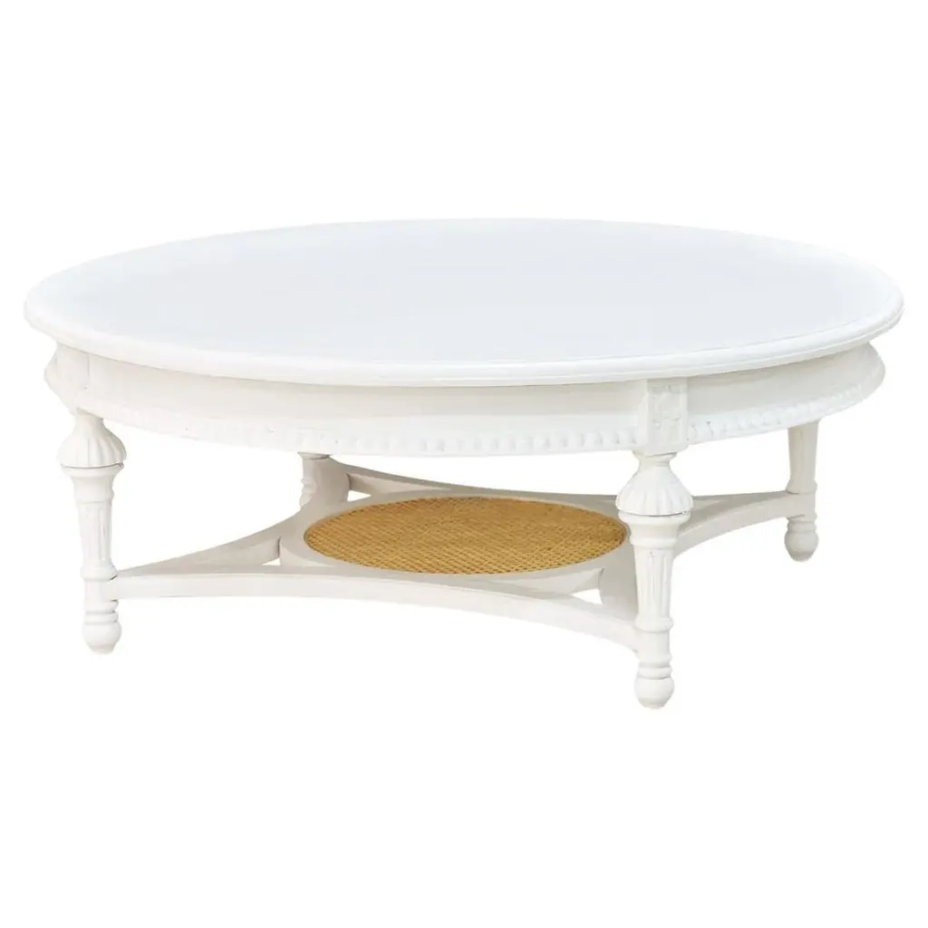 In Charleston Gray with a stylish caned lower tier. This exquisite piece combines timeless 18th-century French Provincial design with modern functionality. The lightly distressed Charleston Gray painted finish and intricate details make it a standout centerpiece that enhances any decor style.The rattan lower tier adds a unique touch, providing additional storage space for books, magazines, or decorative items. The beautifully turned legs and classic design elements bring a sense of sophistication and charm to your living room. Crafted with high-quality wood, this coffee table ensures durability and longevity, making it a cherished addition to your home.Dimensions: 47" W x 47" D x 18" HThe lead time for finish shown is 12 - 14 weeks.Custom finish options are also available. Contact us to learn more.