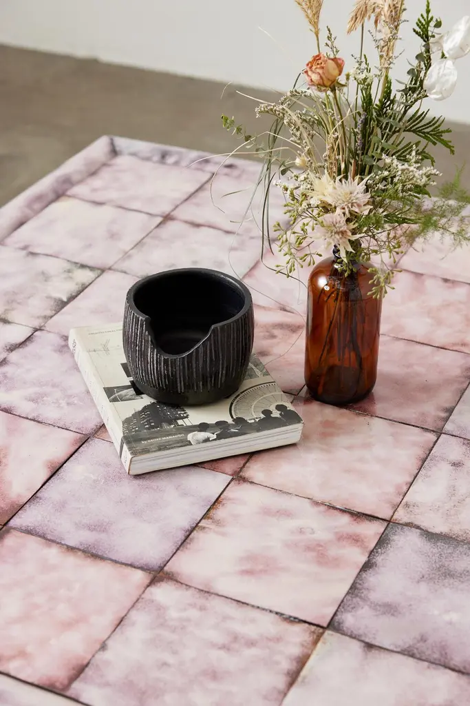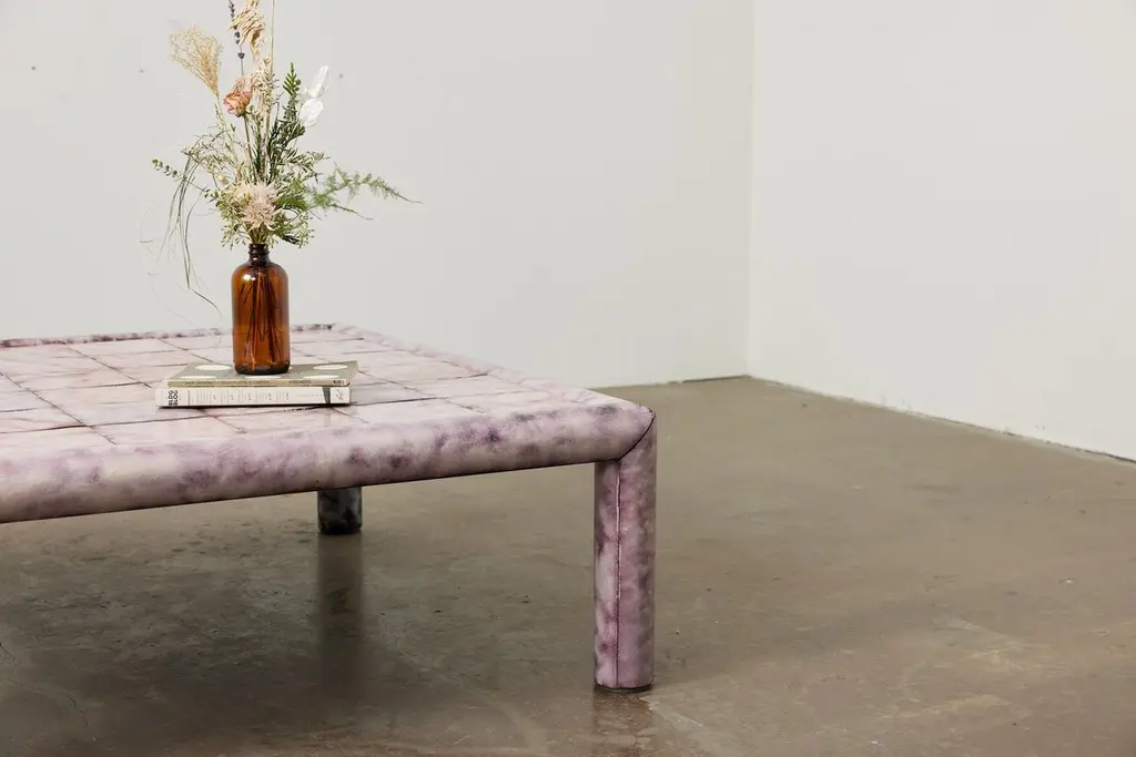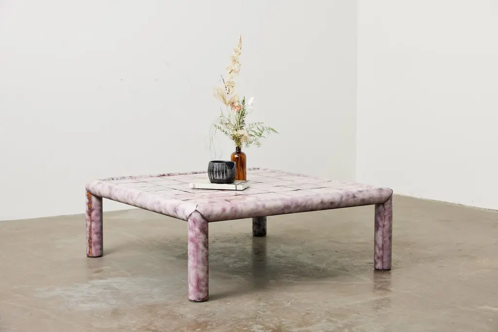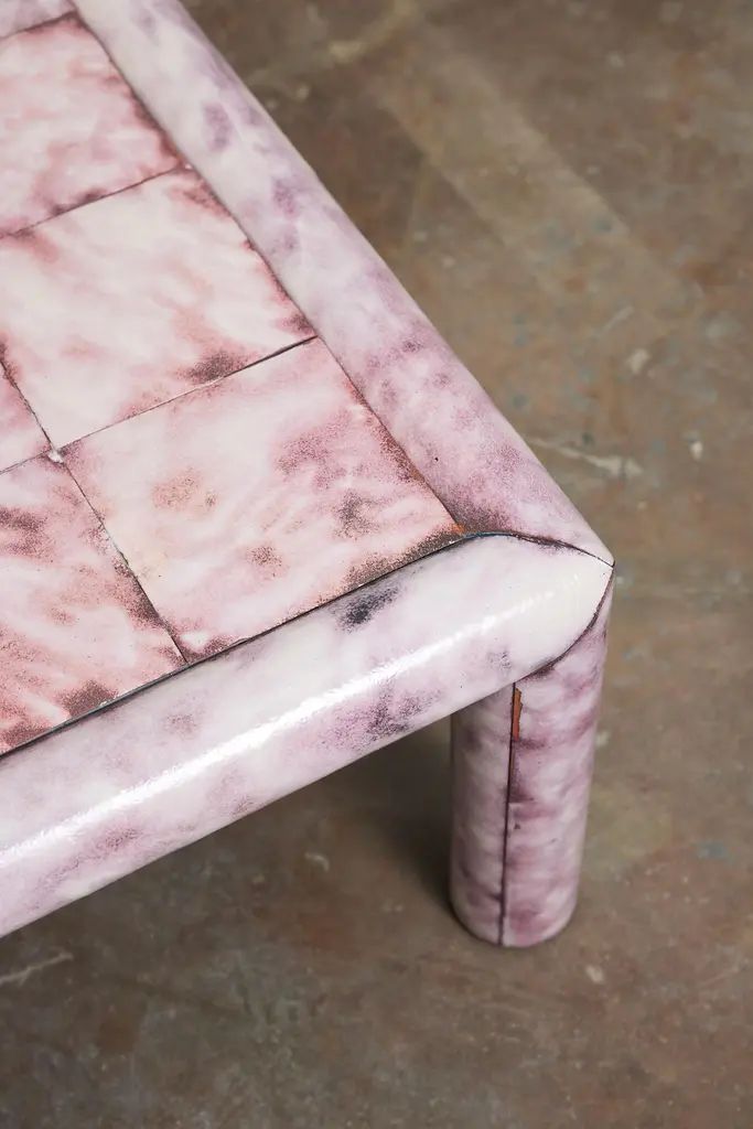 The Froe Table is hand crafted from copper with a torch fired glass enamel finish. No two shingles are created alike—as the heat fuses the glass to the metal, the hand of the artisan directs the torch to vary the oxidization and reaction from the flame to reflect in the final coloration as it cools. The glass and copper meld into one finish—durable and smooth, insulating the cool metal and providing a dappled surface reactive to the touch.Shown with White Translucent Enamel Finish.Overall dimensions: 41"D x 41"L x 14.5"TCustom sizing and colors available. All new format pieces are handmade in Vancouver, Canada.