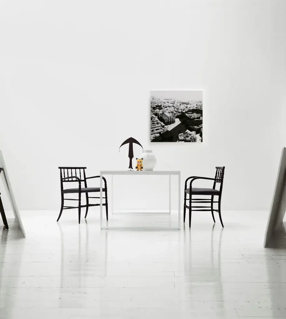 An ode to clean lines, the Fronzoni ’64 table embellishes settings with its absolute rigour and essential elegance.Designed by A. G. Fronzoni, this square or rectangular table has a base made of square tubular metal and the wood top can be matte lacquered in white or anthracite.Austere and perfectly functional, the Fronzoni ’64 tables are the perfect expression of the designer’s vision, whereby geometry dominates function.Top: medium-density wooden conglomerate panelTop finish - matt lacquered: 01 white, 48 anthraciteBase: square metal tubeBase finish - matt varnished: 01 white, 48 anthraciteFeet: black plastic