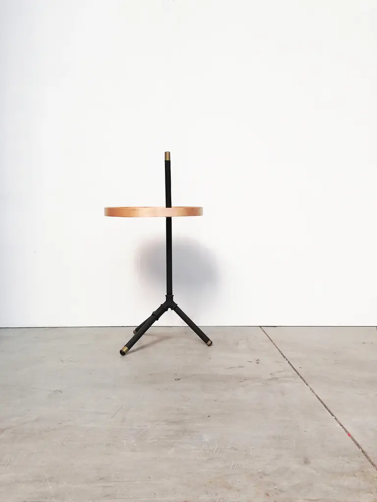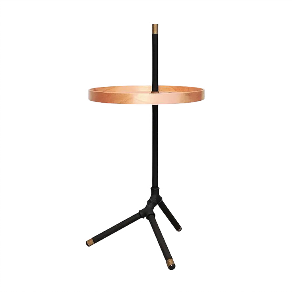 This table features a structure made of painted iron pipes and fittings, a wooden top, and brass terminals.