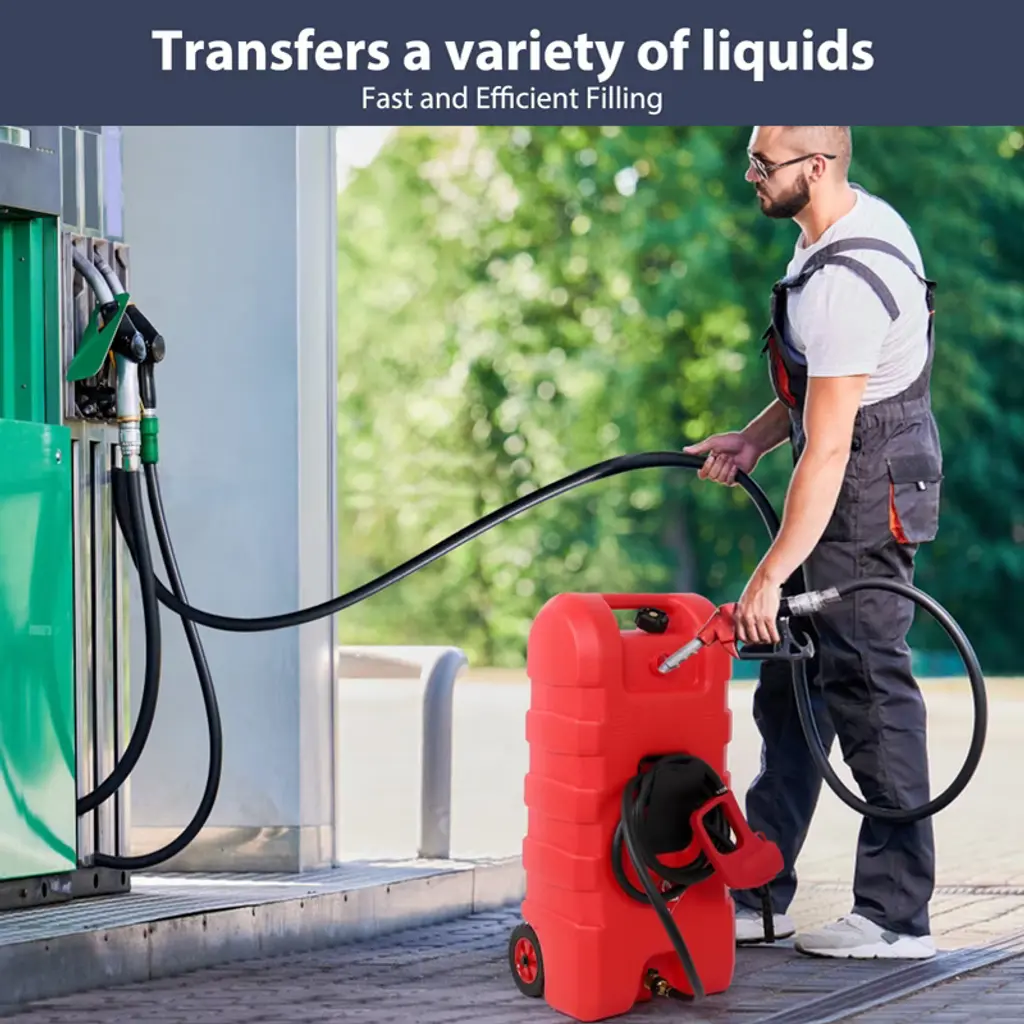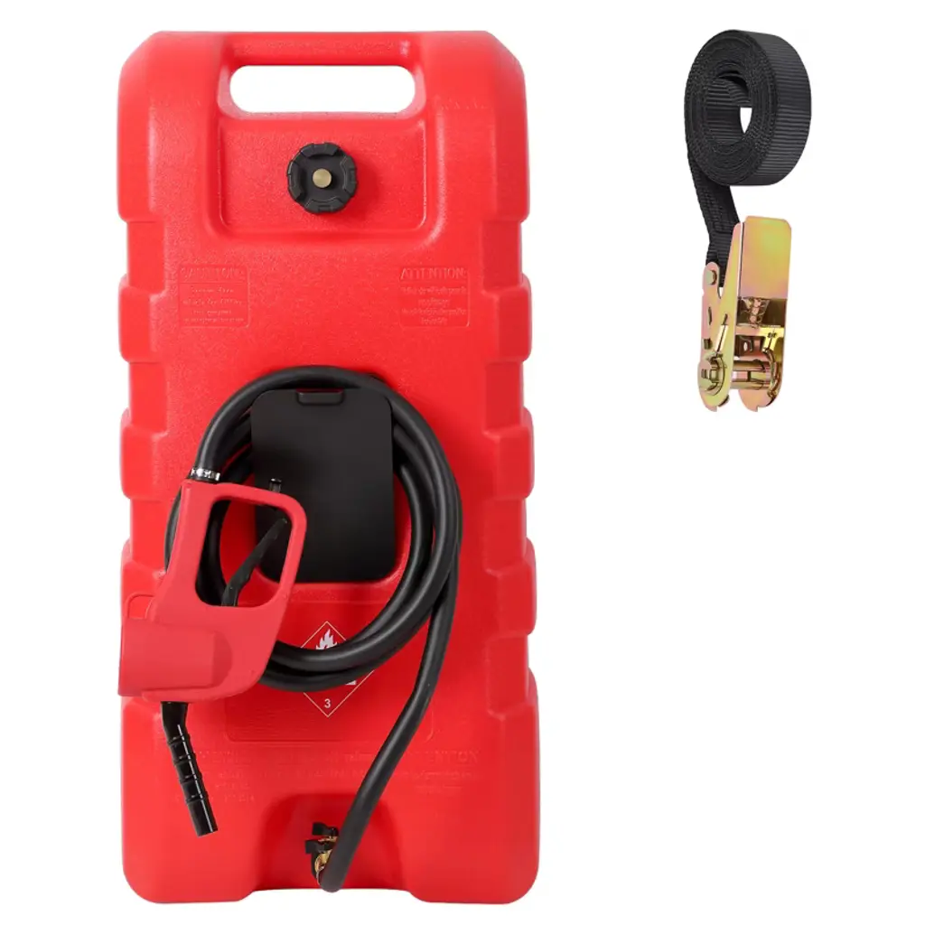 Product Description15 Gal Easily Portable Gas Fuel ContainerThe portable fuel tank with this liquid fuel can for fast, clean and reliable delivery of gasoline, diesel fuel, kerosene, light oil, you can fuel your cars, motorcycles, boats, lawn mowers, snow blowers, generators, automobiles anytime and anywhere!Feature:Sturdy & Durable MaterialThe oil container is made from impact.resistant polyethylene, which is durable corrosion-resistant, and UV-proof. The bright red appearance doesn't fade easily, ensuring high quality performance for long service life.Convenient Reinforced StrapThe belt design includes an aluminum quick-connect buckle, which allows you marine gas tank be securely fastened for carrying and transportation.Fuel Spill-Proof ValvesThe fuel tank has 2 brass shut-off valve son the top and the hose,this allows for easy disconnection and prevents fuel leakage.Fuel Nozzle & Extended HoseManual nozzle is made of high-density polyethylene plastic and 10 ft. flexible anti static dispensing hose is made of automotive grade rubber, ensure a long service life.SpecificationsProduct Name: 15 Gal Easily Portable Gas Fuel ContainerProduct Dimensions: 15 x 10 x 35 inchesItem Weight: 48 poundsPacking List:1 x Fuel Container