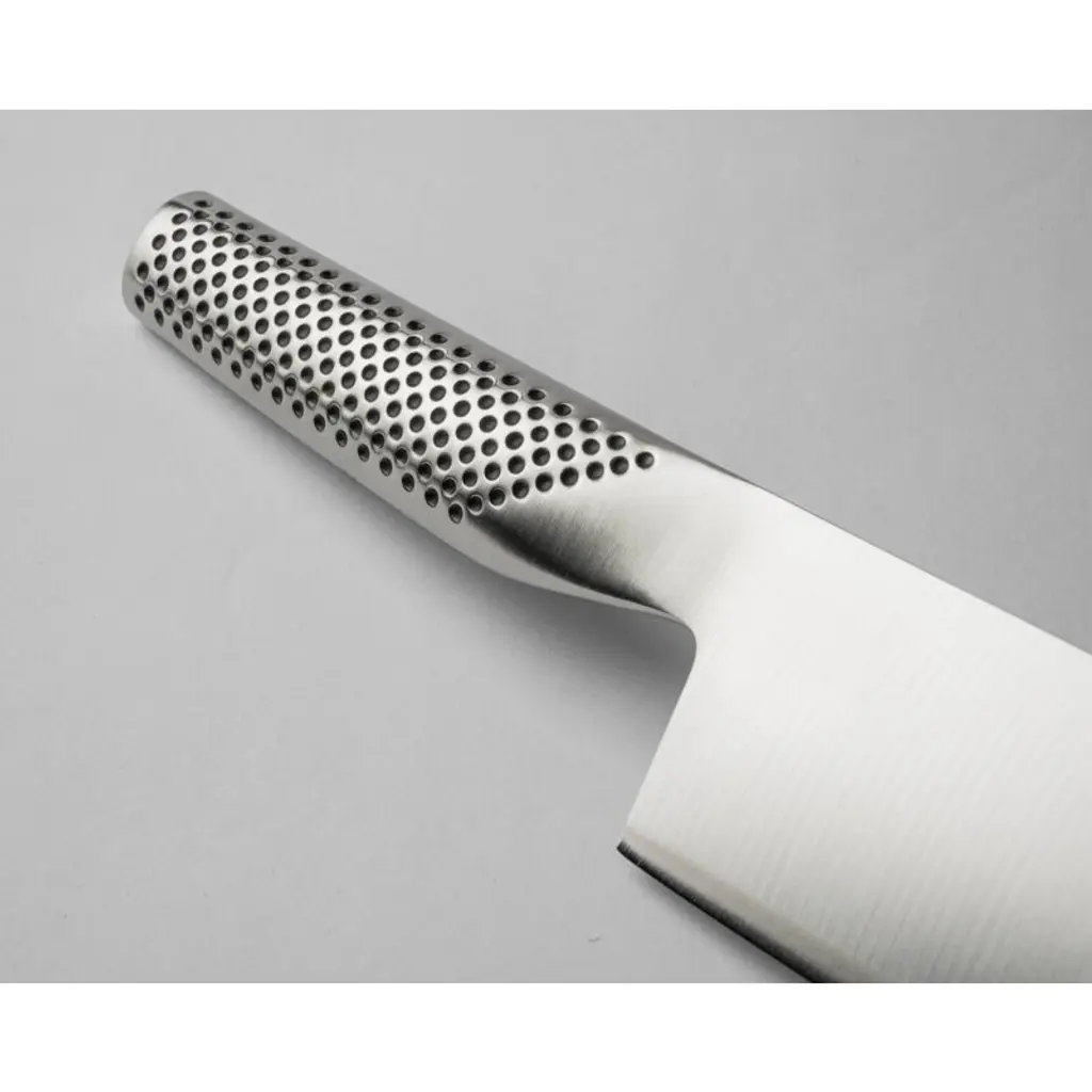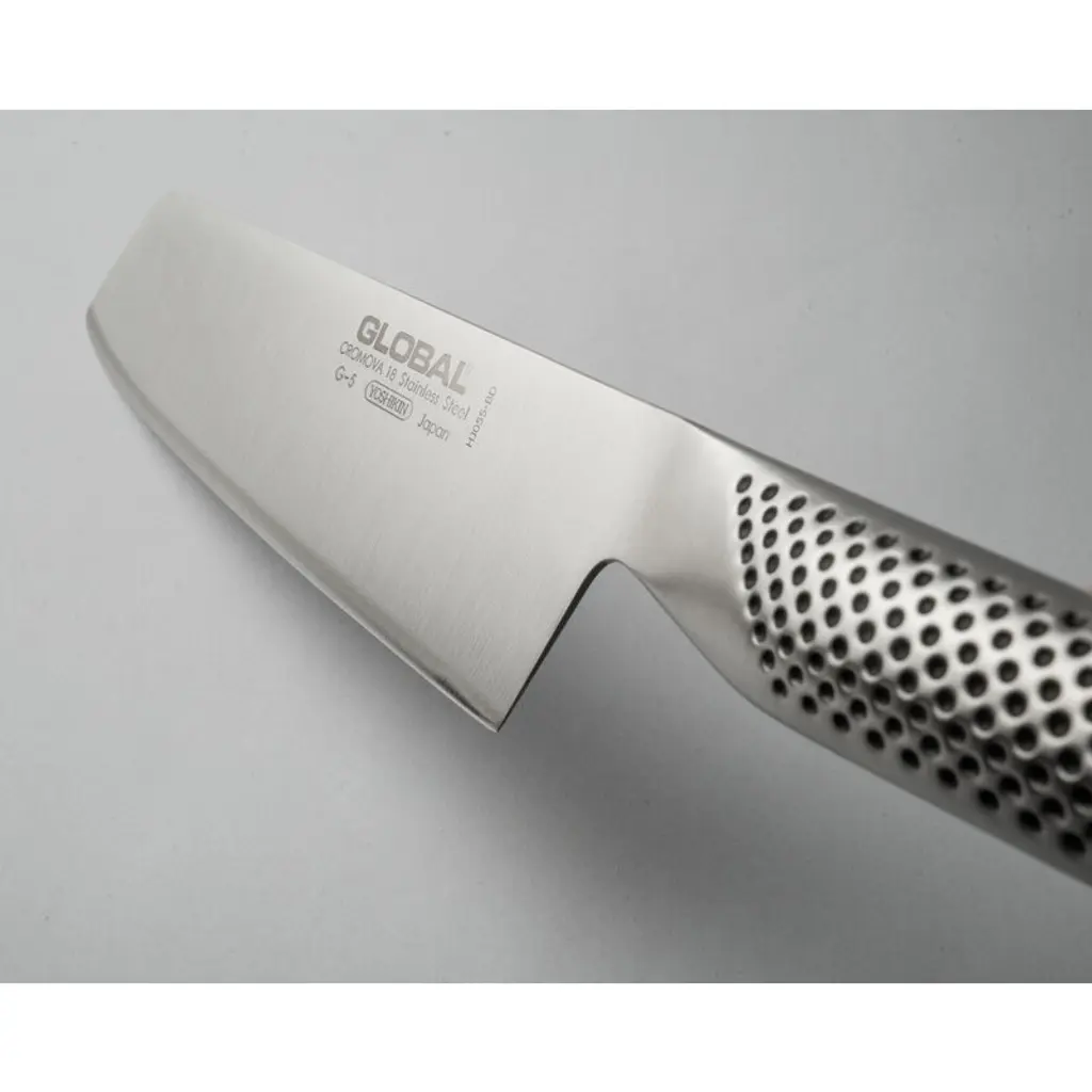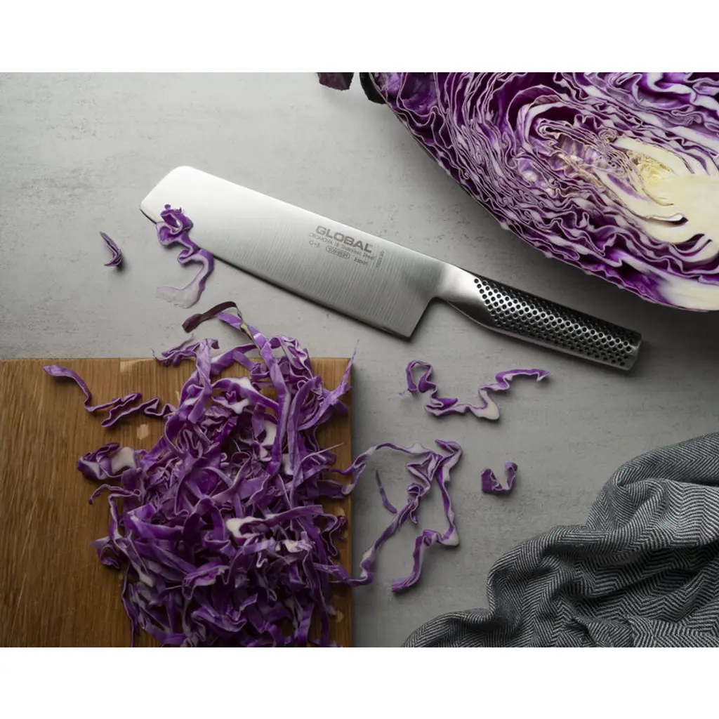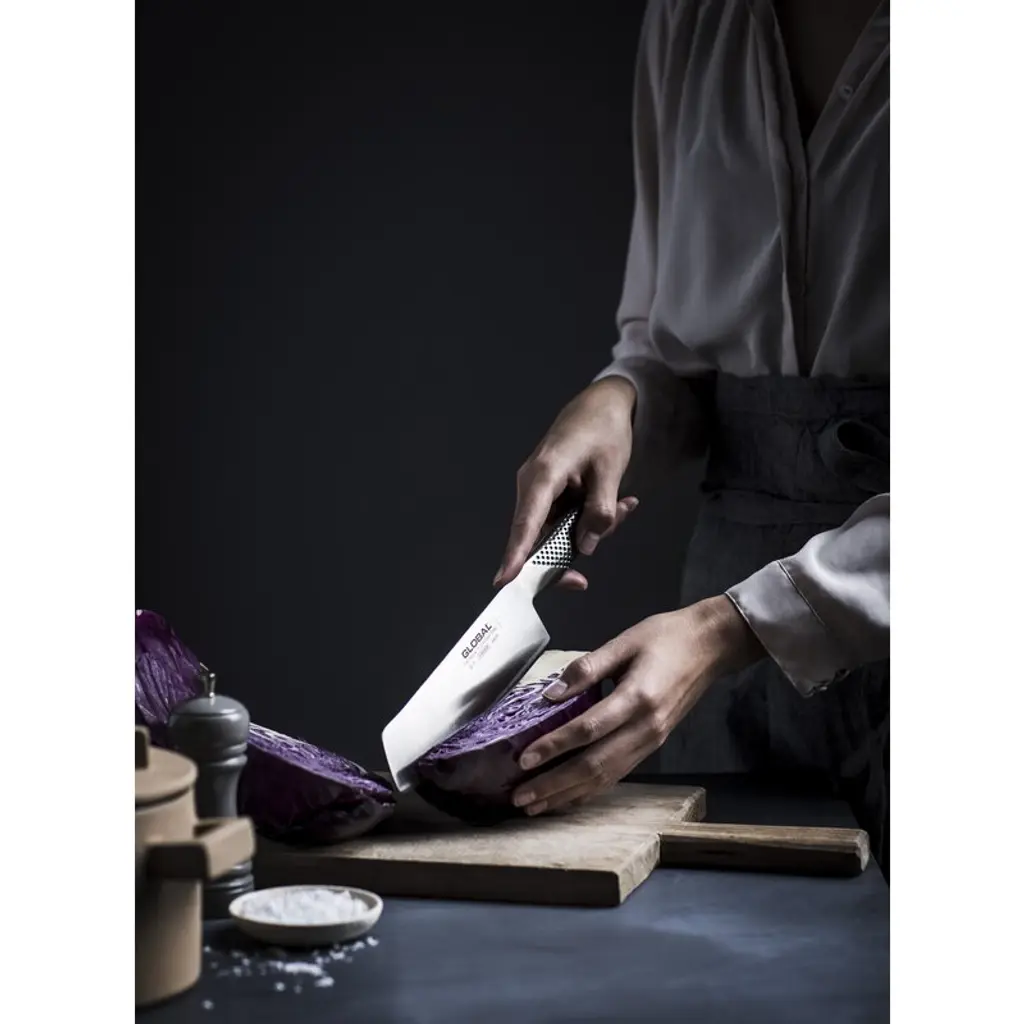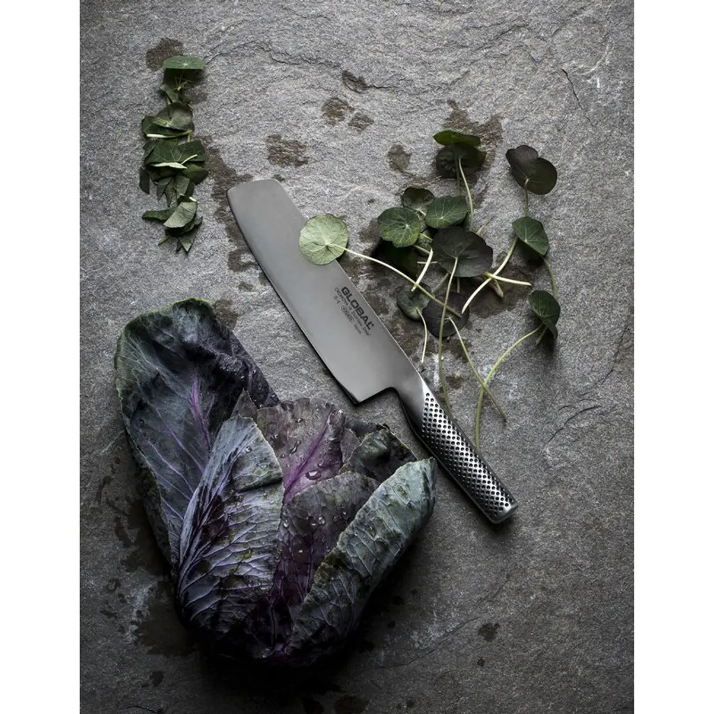 The Global G-5 vegetable knife is a sturdy kitchen essential designed for smooth and efficient slicing and chopping of vegetables. Inspired by traditional Japanese usuba knives, the 7.09 in (18 cm) blade is shaped for an up-and-down cutting motion, allowing the entire length of the blade to contact the cutting board in a single stroke – no pushing or pulling needed. Crafted from all-stainless steel, the knife features a one-piece seamless construction that makes it exceptionally hygienic and easy to clean. The signature dotted handle is filled with sand to ensure a perfectly balanced grip. Designed by Komin Yamada, the knife performs brilliantly in both home kitchens and professional settings. Global knives are hand-made in Japan, following the age-old traditions of Japanese swordsmiths. The unique, top-quality steel alloy Cromova 18 used in Global's razor-sharp blades consists of chrome, molybdenum and vanadium. The extremely tough and durable material also fights rust and corrosion.