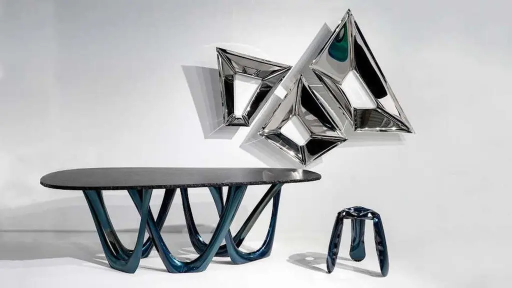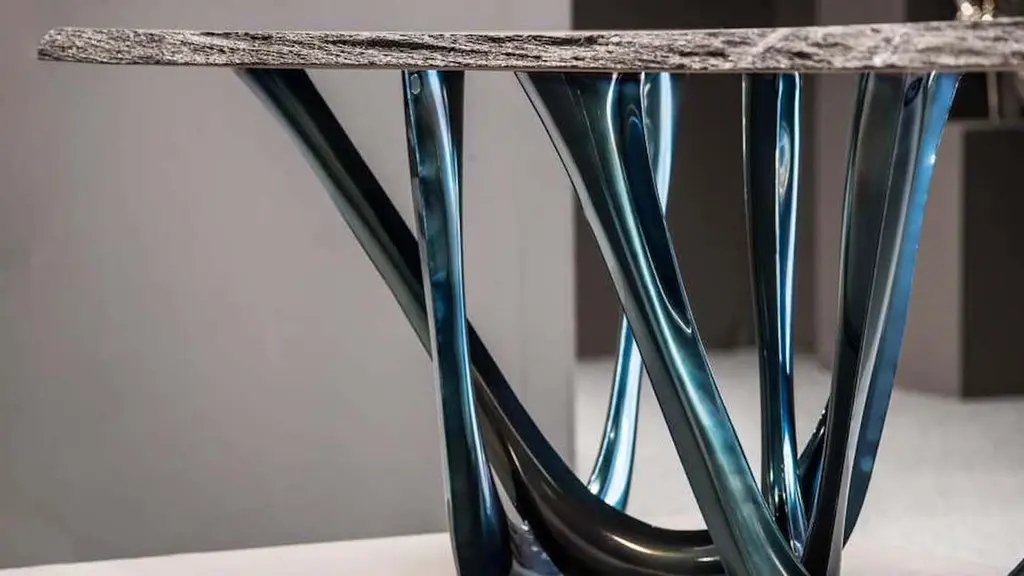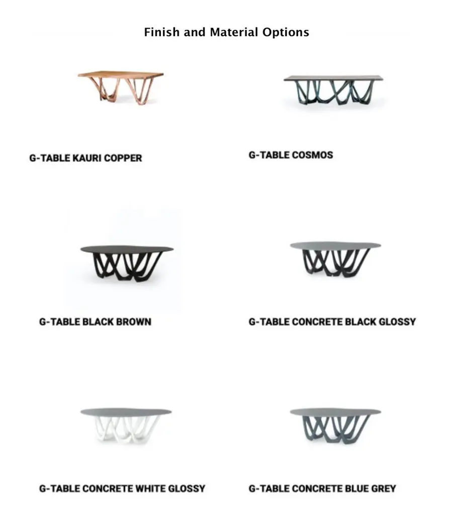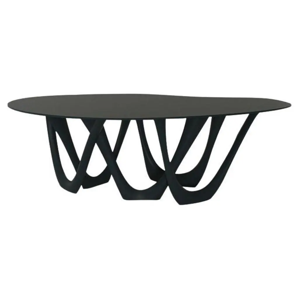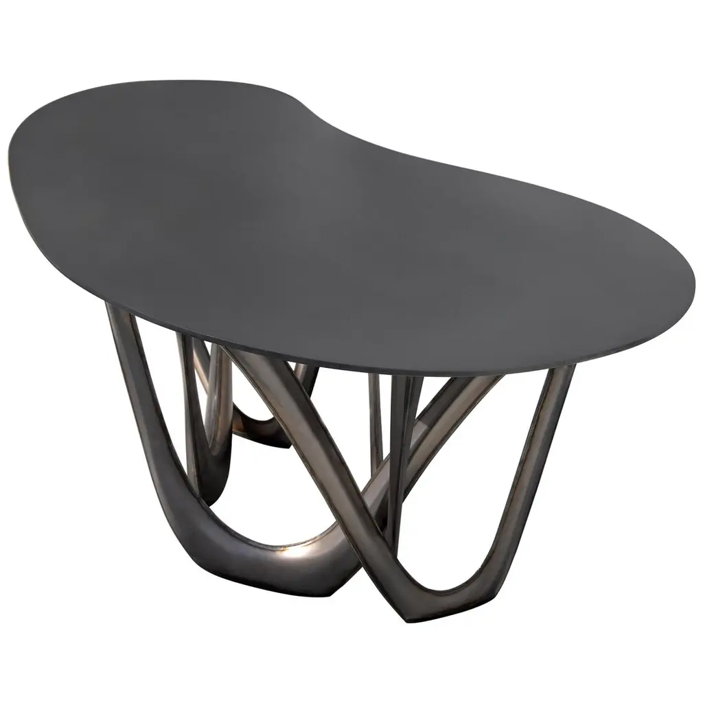 Zieta uses parametric design software to generate G-Table form. Modifying a few variables lets us create a miniature model as well as a huge pavilion. Delicate structure of table legs may become stocky and dominating. All those factors cause G-Table to be not only an effect of the process, but also a process itself. G-Table’s base consists of parabolic forms. Made with FiDU technology, it reminds of vines or tree roots. Nature symbolizes a constant changeability and harmony that comes out of it. Diverse structure of G-Table refers to both natural forms and processes.Bionic:Zieta has created a new way of generating bionic objects. With parametric and generative design we are able to create endless generations of new products and constructions. As a result, we are able to create smooth, elegant and gentle forms which at the same time remain stabile, durable and functional. We use generated forms as table constructions supporting custom table tops.Customization:Zieta uses computer-controlled parametric program to generate constructions and art forms. By modifying five features we are able to generate tailored parametric arches, that are not limited in scale. They can create basis for table tops as well as huge pavilions. Zieta plays with scales and sizes in every dimension.FIDU:Thanks to the common factor which is the FiDU technology, the world of design, art and technology are combined. The free inner pressure deformation gives every object a special and unique form of revealing the true face of the metal.This table consists of granite tabletop and carbon steel tablebase in Cosmic Blue finish/ color.Design, color, finish, and size are customizable.