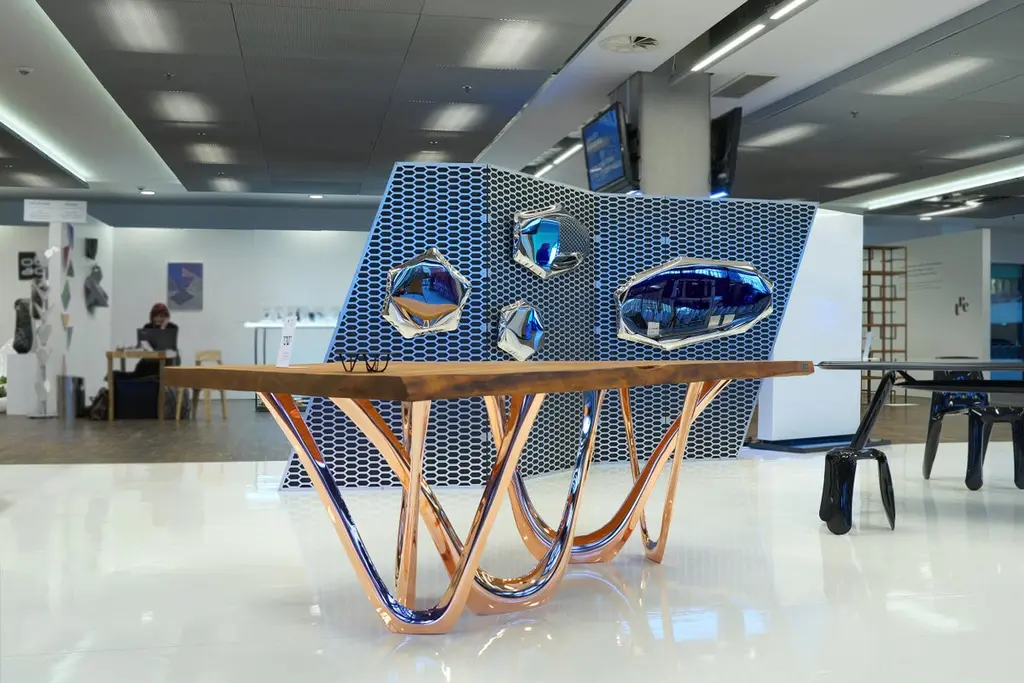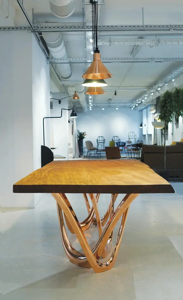 Zieta uses parametric design software to generate G-Table form. Modifying a few variables lets us create a miniature model as well as a huge pavilion. Delicate structure of table legs may become stocky and dominating. All those factors cause G-Table to be not only an effect of the process, but also a process itself. G-Table’s base consists of parabolic forms. Made with FiDU technology, it reminds of vines or tree roots. Nature symbolizes a constant changeability and harmony that comes out of it. Diverse structure of G-Table refers to both natural forms and processes.Bionic:Zieta has created a new way of generating bionic objects. With parametric and generative design we are able to create endless generations of new products and constructions. As a result, we are able to create smooth, elegant and gentle forms which at the same time remain stabile, durable and functional. We use generated forms as table constructions supporting custom table tops.Customization:Zieta uses computer-controlled parametric program to generate constructions and art forms. By modifying five features we are able to generate tailored parametric arches, that are not limited in scale. They can create basis for table tops as well as huge pavilions. Zieta plays with scales and sizes in every dimension. Design, color, finish, and size are customizable. Please see images of table top, table base, and finish/ material options in the additional images. Customization pricing on inquiry.FIDU:Thanks to the common factor which is the FiDU technology, the world of design, art and technology are combined. The free inner pressure deformation gives every object a special and unique form of revealing the true face of the metal.This table consists of Kauri wood table top and copper-cladded steel table base.