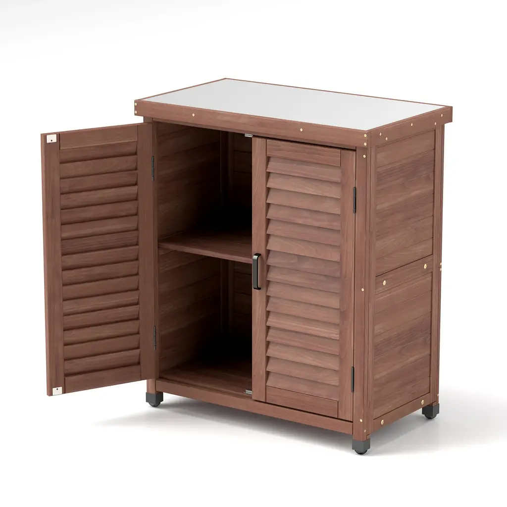 Garden Wood Workstation,potting Bench With Storage Cabinet And Metal Table Top - Brown