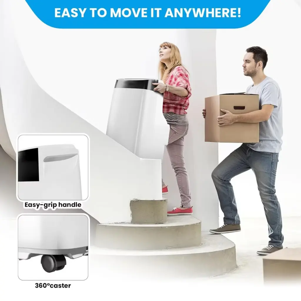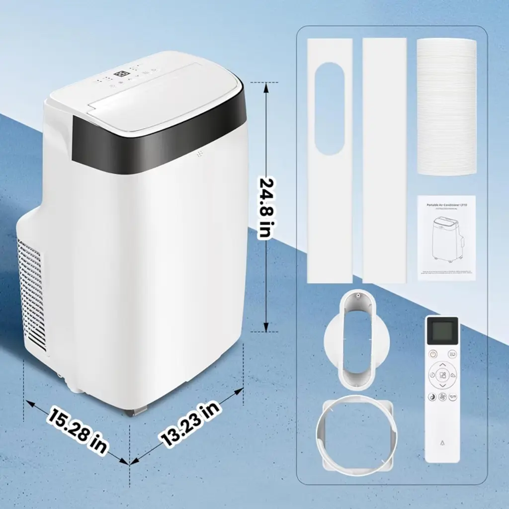The Item Type is Portable Air Conditioner, Timer Control is 24 hrs , Vent Hose Exhaust Configuration is Single Hose , Dehumidifier Capacity is 163 Pints/Day , Air Direction is 3-Way , Cooling System is Direct , Number of Cool Speeds is 3 , Cooling Method is Refrigerant , Control Style is Remote Control / Touch Panel , Area Covered is 401-450 sq ft ,Mounting Location is Floor , Operating Sound Rating is 41-50 dB ,CEER is 6.51 , Energy Efficiency Ratio (EER) is 6.1-7 , Voltage is 115 V. Features is Adjustable Humidistat / Compact / Digital Display / Durable / Indoor /Portable / Remote Control / Reusable / Washable Filter / Sleep Mode / Timer / Wheels. Package Include: 1 x Portable Air Conditioner / 1 x Remote Control / 1 x Window Kit / 1 x Exhaust Hose / 1 x Instruction Manual