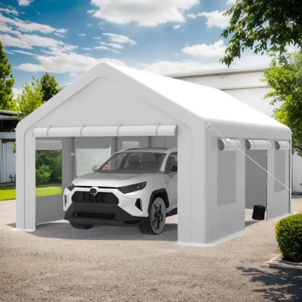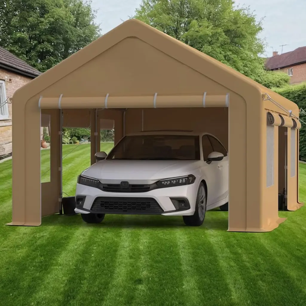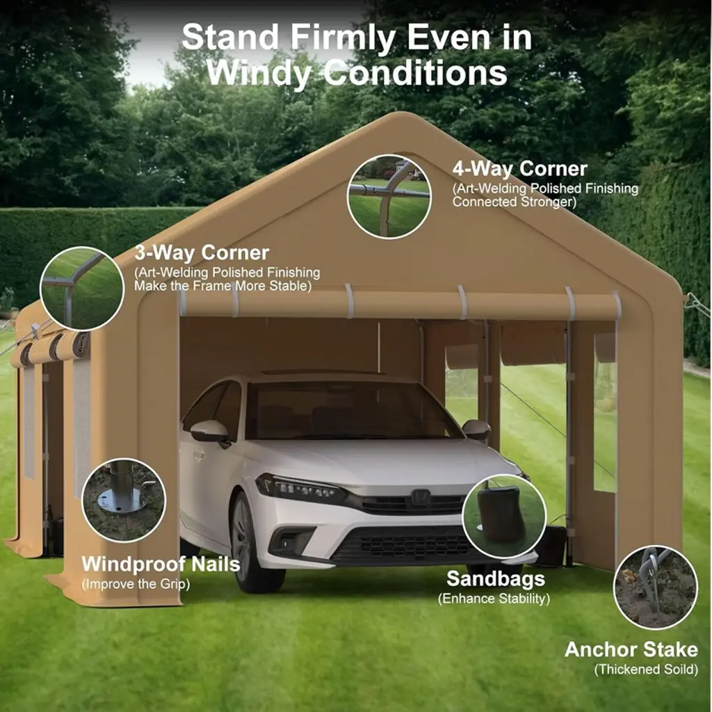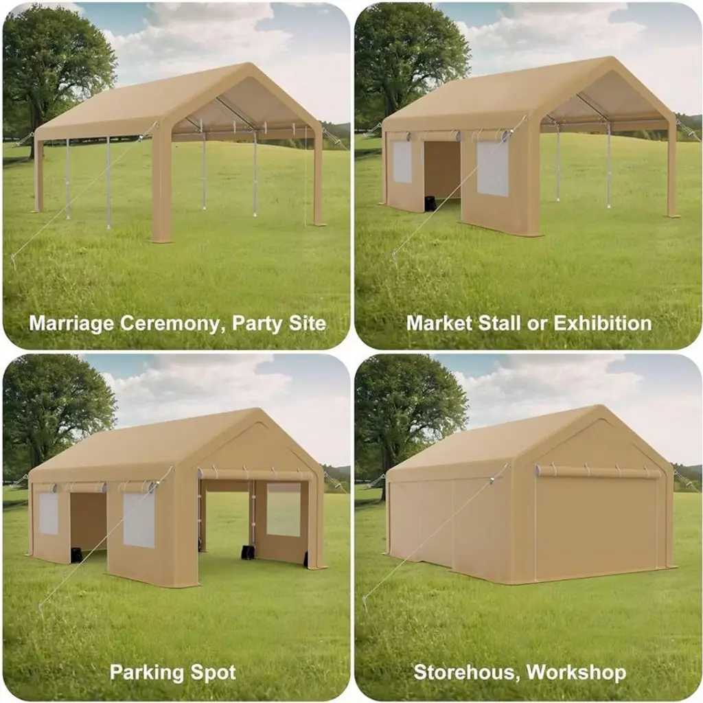 Garvee 13x20ft Carport -Portable Upgraded Garage-heavy Duty Carport With 4 Roll-up Doors & 4 Ventilated Windows,beige
