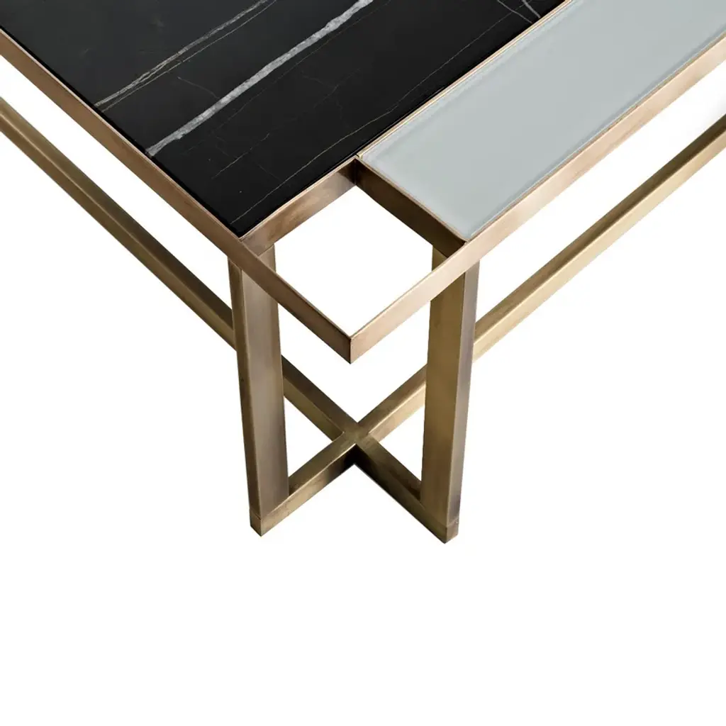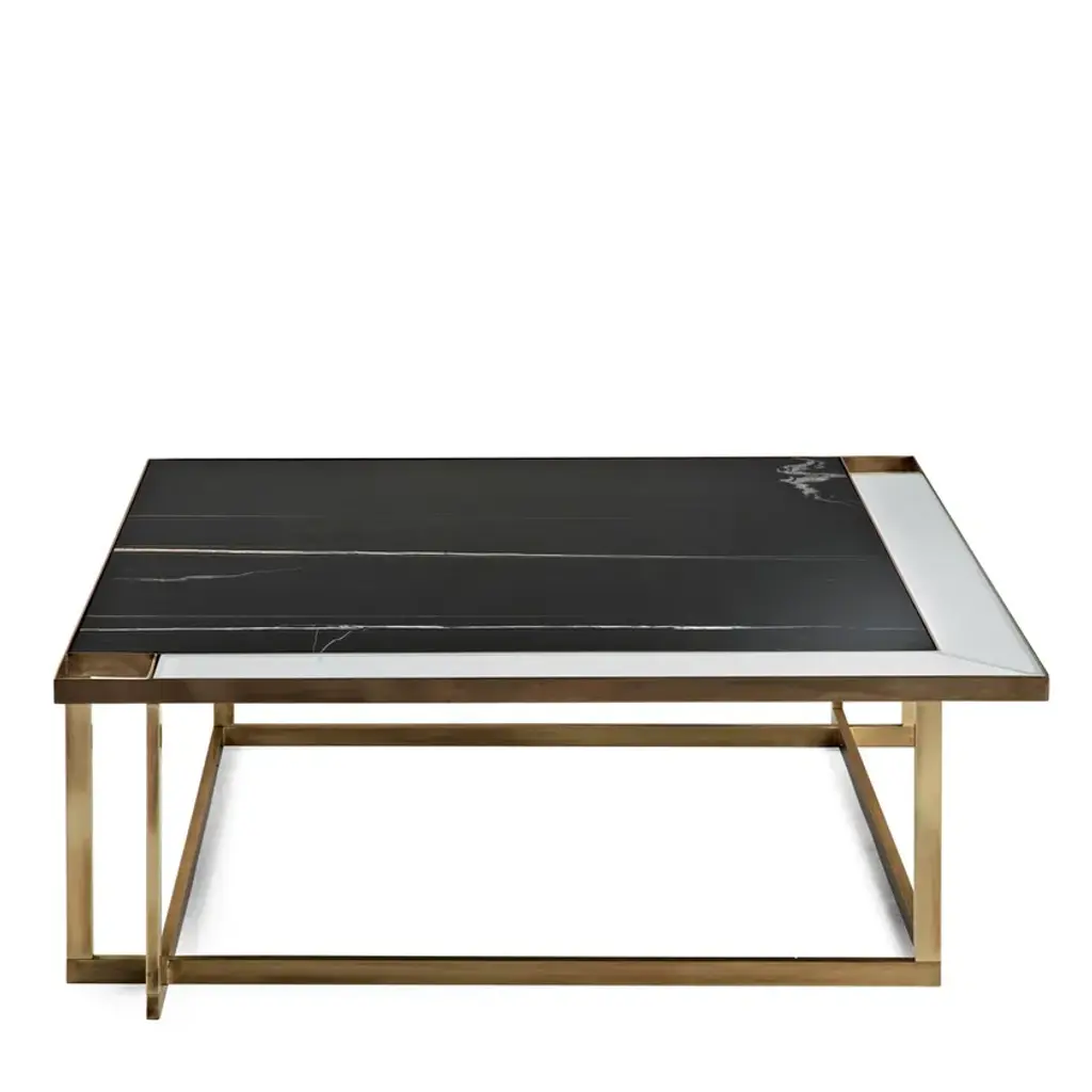 Elegant square coffee table h.40 cm with brass structure and marble/painted glass elements recessed top. Available in different combination of materialsGary is a complete collection of dining, coffee, side, consoles table and mirrors. Solid brass structures with marble and painted glass tops that fit perfectly any interiors.