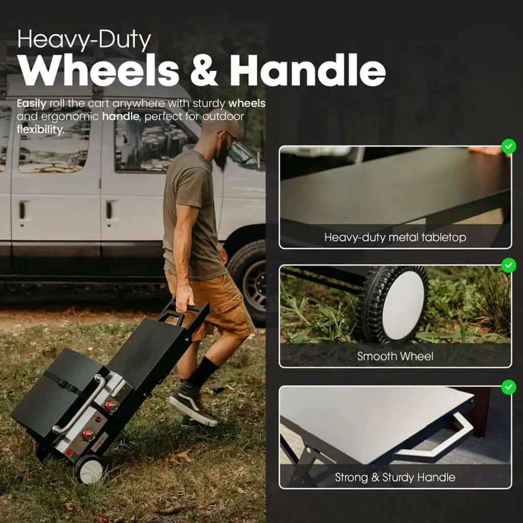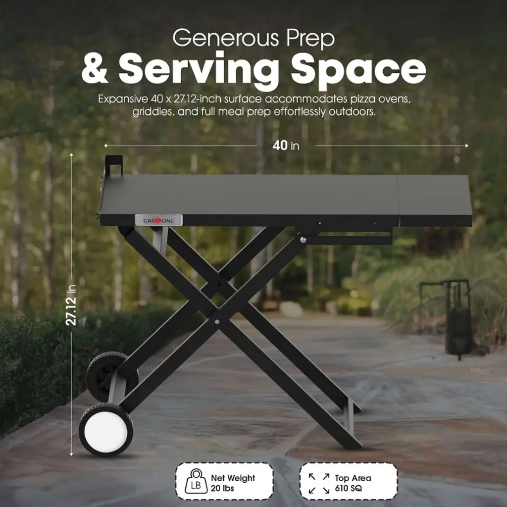 The GasOne T-100F Foldable Grill Cart elevates your outdoor cooking experience. This durable, collapsible cart is designed for convenience and performance, with a big 40 x 15.25 inch surface that can comfortably hold portable grills, griddles, and other cooking equipment., Its sturdy steel frame and sleek black finish make it ideal for outdoor usage, whether you're cooking in the backyard, camping, or hosting a tailgate party. The folding design enables for easy fold-down and compact storage when not in use. With heavy-duty wheels and a strong cross-leg base, the T-100F portable gas grill outdoor table provides both mobility and dependability on a variety of outdoor terrains. There are no tools necessary for setup, so you can set up and begin cooking in minutes. Whether you're a weekend BBQ enthusiast or a full-time RV traveler, this portable barbecue cart allows you to enjoy your favorite cuisine anywhere, at any time. Key Features At A Glance: Tabletop Dimensions: 40 x 15.25 inches Foldable design allows for simple storage Two built-in wheels for transportation No tool assembly needed Designed specifically for portable barbecues and griddles Ideal for patios, campgrounds, and festivals