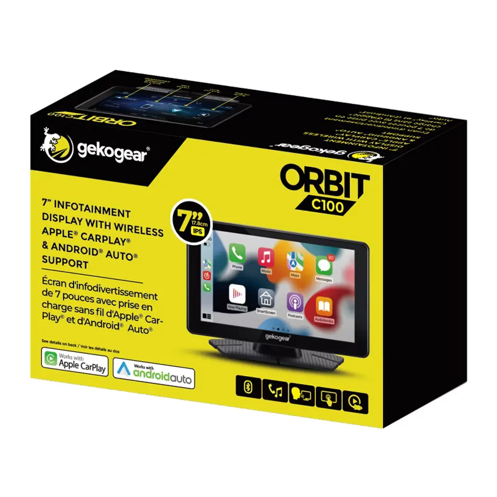 Wish you had Apple® CarPlay® or Android Auto™ on your car’s head unit? Now you can enjoy the benefits without buying an entire aftermarket replacement! Celebrate automotive connectivity with the GekoGear™ Orbit C100, a cutting-edge 7-in. display seamlessly integrated with Apple® CarPlay® and Android Auto™. This sleek and sophisticated device transforms your car into a smart hub, allowing you to effortlessly access your favorite apps, navigation, and entertainment from the vibrant 7-in. touch screen by wirelessly linking your phone. Equipped with both Wi-Fi® and Bluetooth® capabilities, the Orbit C100 ensures a seamless and wireless connection to your smartphone, providing hands-free communication with phone calls and message replays, navigation, music streaming, and access to a world of information while on the road. The 7-in. display offers crystal clear visuals, enhancing your driving experience with intuitive controls and a user-friendly interface.