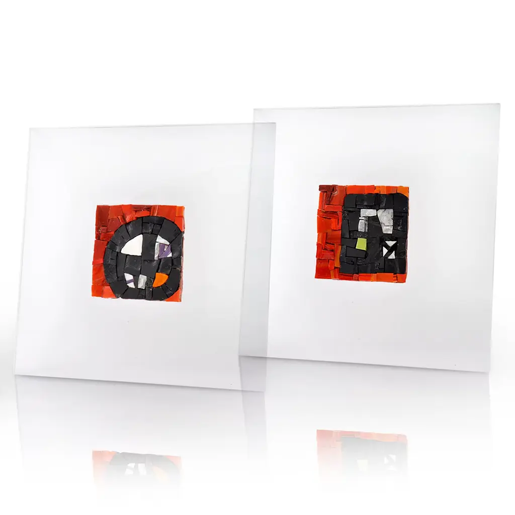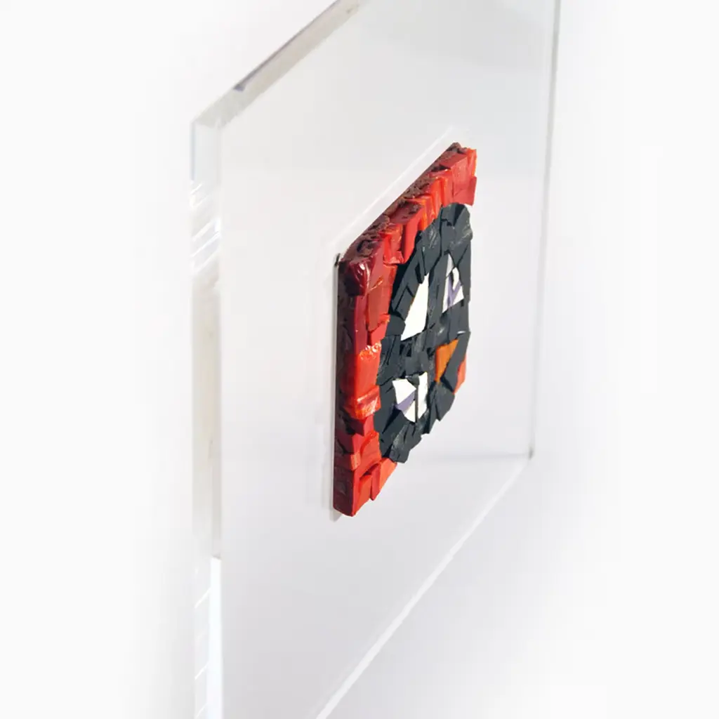The clean, transparent lines of the crystal acrylic frame of this Nino Basso mosaic tableau enclose in their centre a lively-coloured, handmade geometrical mosaic composed of Venetian enamel. Mosaics have fascinated humans for centuries, and this modern re-creation is sure to make an impression as a decorative piece in any contemporary setting.