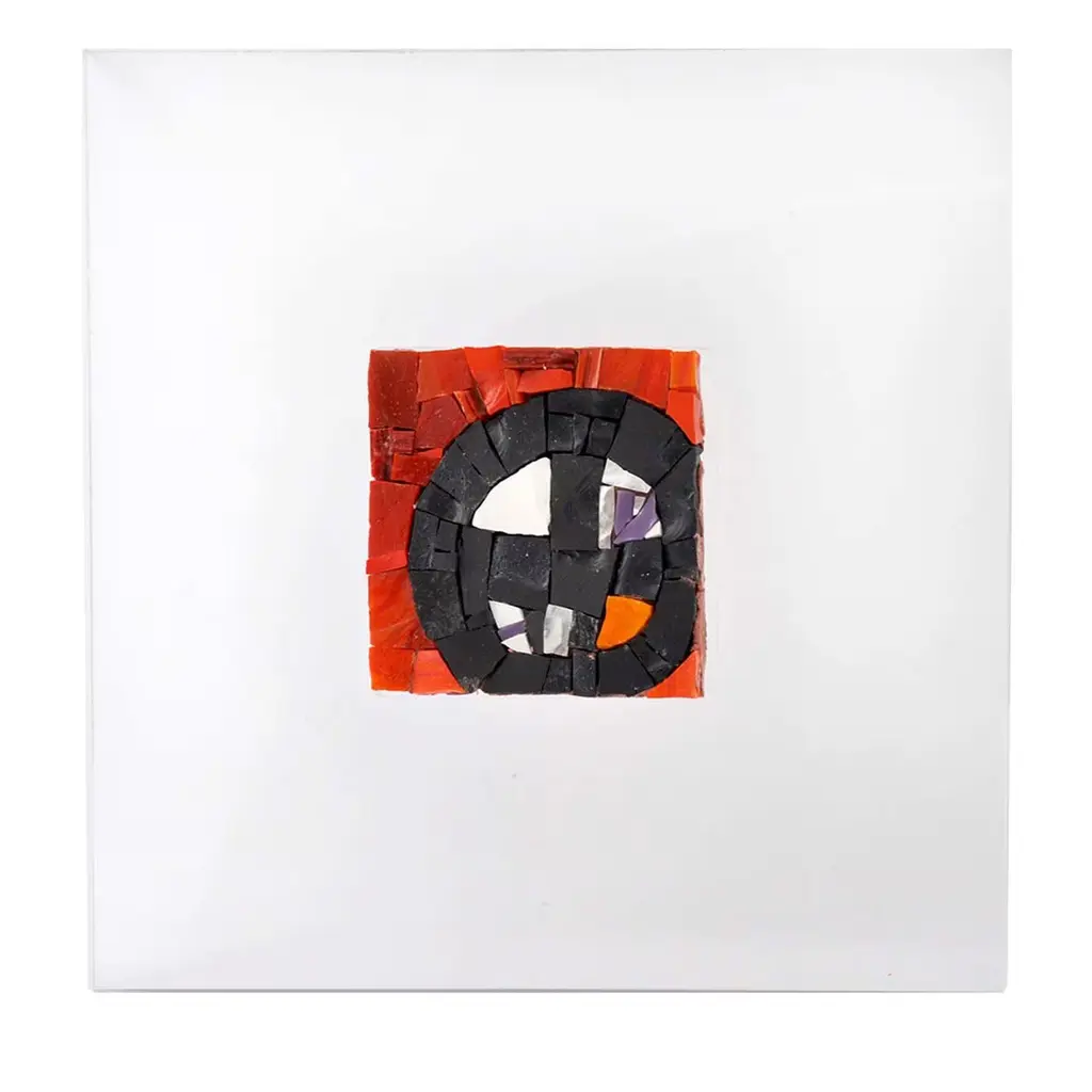 Roman floors and Byzantine mosaics make a contemporary reappearance in this Nino Basso handmade mosaic tableau. Irregularly shaped Venetian enamel mosaic tiles in red, black, and a splash of yellow are used by the artist to create a square enclosed within the clean, transparent lines of the tableau’s acrylic crystal frame