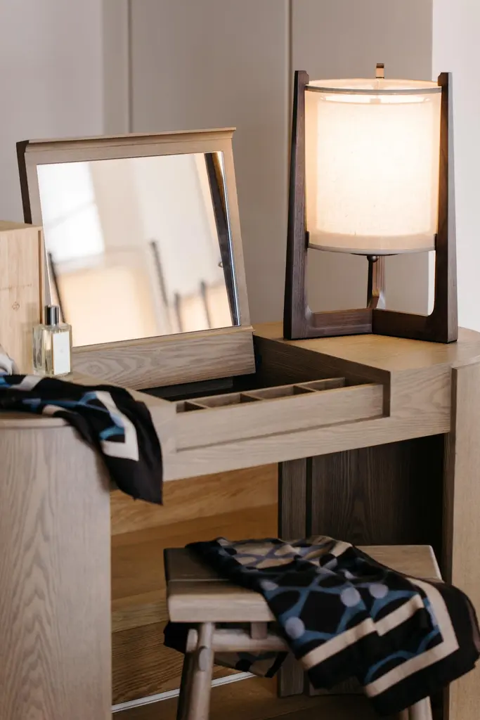 designed as a nod to bauhaus architecture, this dressing table is bold on its geometries yet intricate at the same time. crafted in solid ash wood, the top is highlighted with a flip-up mirror. the inner case is divided into compartments, permitting jewellery and cosmetics to be orderly placed.Customisable sizes upon request.