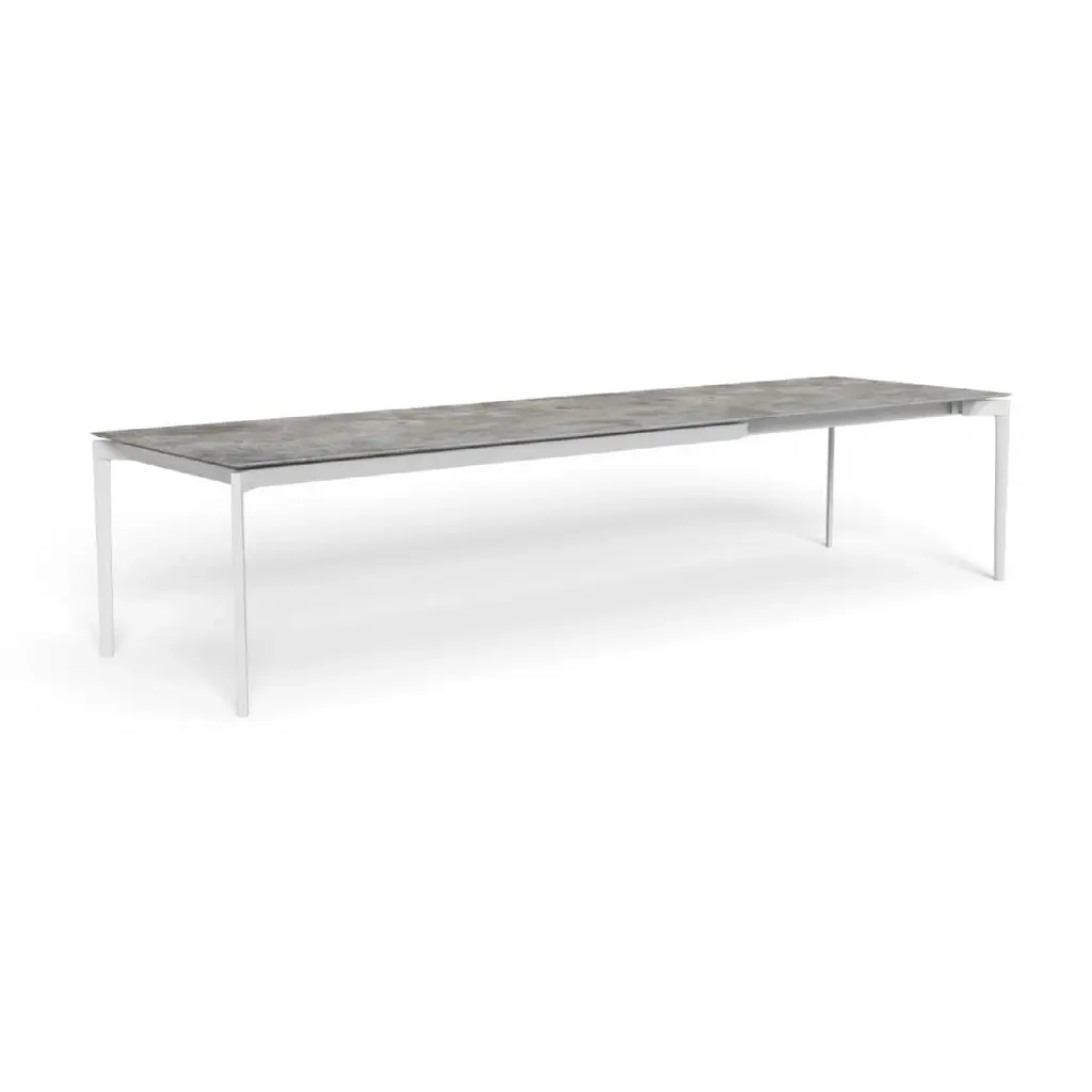 Family of tables born from the union of different materials, Inout 143/144 have a rectangular top and are available in various sizes. Formed of a structure in matt white, grey or sage painted aluminium, they have the top available in different finishes: fixed or extendible natural teak slats, fixed or extendible (with slats in teak) white Carrara marble or grey porcelain stoneware, giving life to a product with extreme versatility.Table, matt white, grey or sage lacquered aluminium frame with top in white carrara marble.Additional Information:Material: Aluminium, marbleTop finish: White carrara marbleBase finish: Grey lacquered aluminiumDimension: 240 W x 100 D x 73 H cmAvailable in other top finish options: Fixed natural teak slats top, extendable natural teak slats top, white carrara marble and leaf extention in natural teak slats, grey porcelain stonewareAvailable in other base finish options: Matt white, sageAvailable in other size option: SmallQuick Ship: Inout 143/144