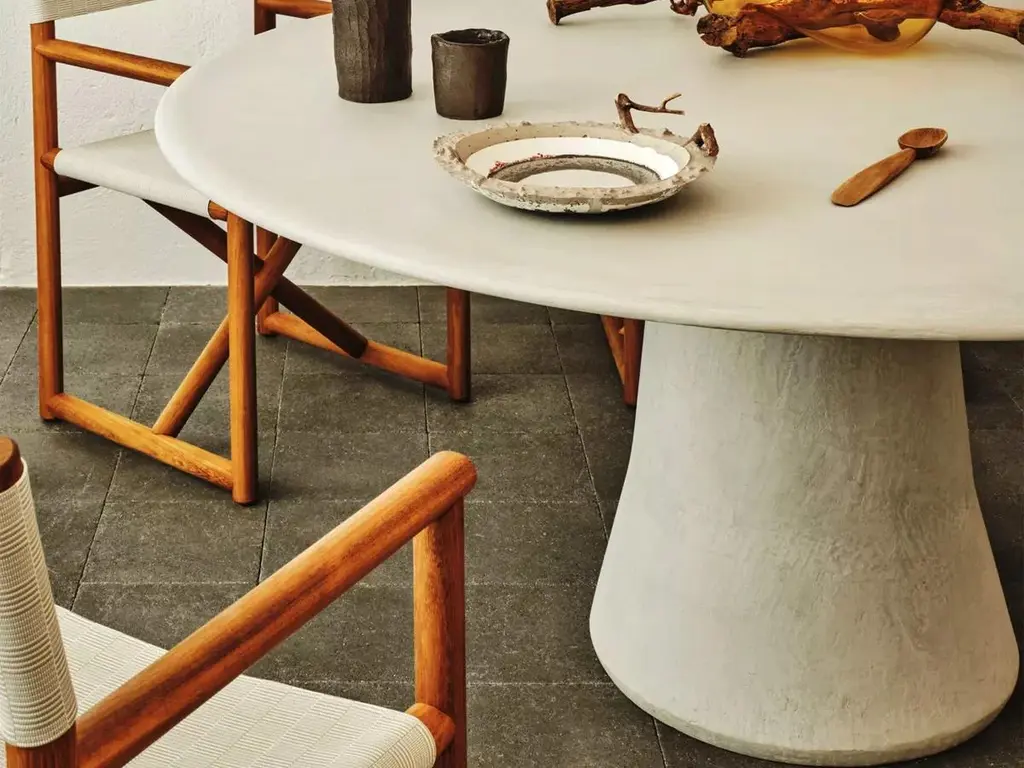 The Mae table, designed by Marco Acerbis, brings the sculptural elegance of the Noa collection indoors. Featuring a tapered conical base and a refined hand-applied lime-clay finish, it is available in oval and round versions. The MDF top, treated with a matte waterproof and stain-resistant coating, combines aesthetics and functionality, making Mae a perfect balance of design and craftsmanship.Finish Options:• Graphite• Ivory (Natural White)• Stone (Cenere Grey)• Ottonio (Teal)• Ferro (Iron)DIMENSIONS:• MAE 34 ; 200 × 120 cm × H 74 cm• MAE 33 ; 240 × 155 cm × H 74 cm
