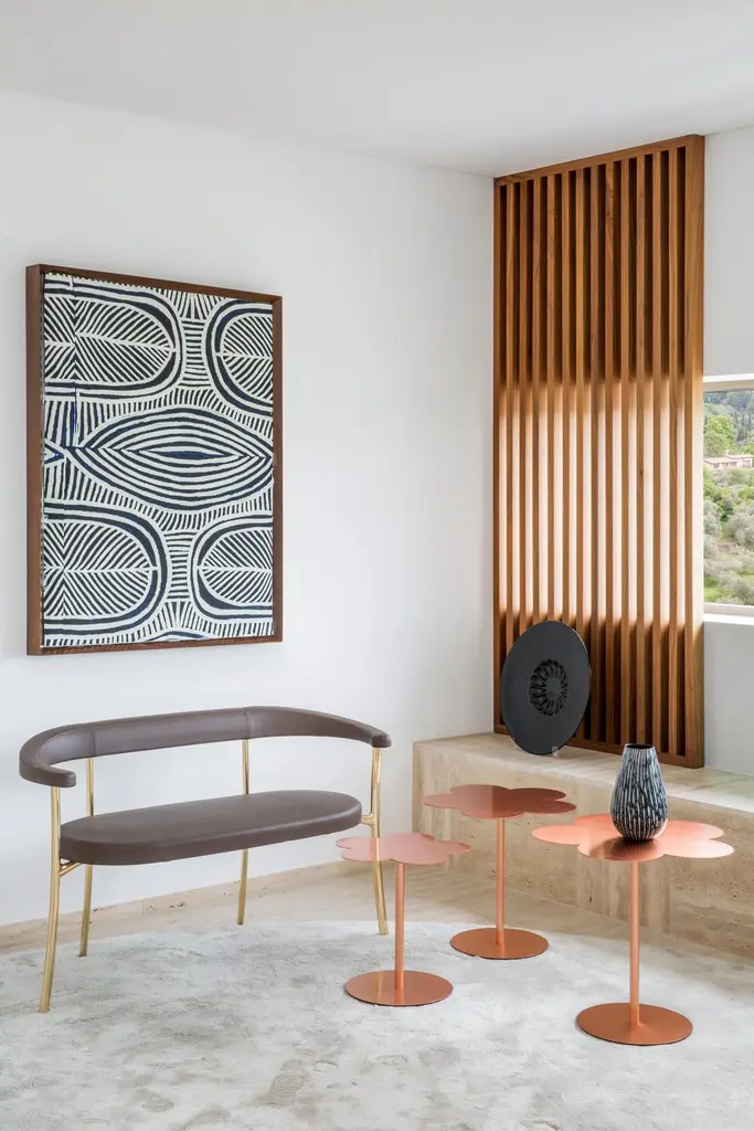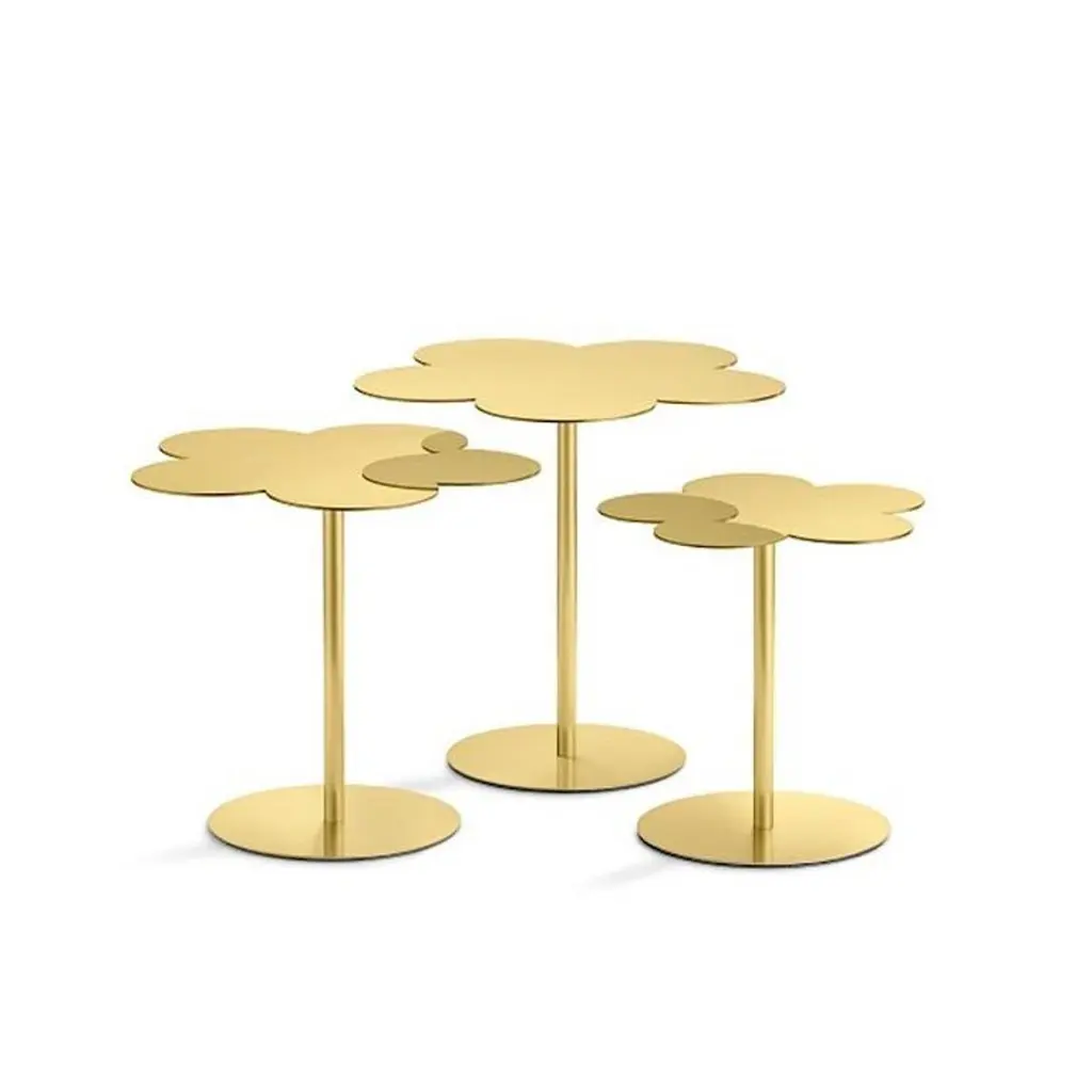 Large coffee side tableThe natural element is the focus of this project of a coffee table where the surface is shaped like a stylized flower. A triptych of distinct elements which rest on a circular foot and, given the different heights, can be pushed together and partially overlapped, instead of be used singularly.Material:Copper.