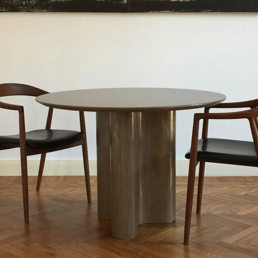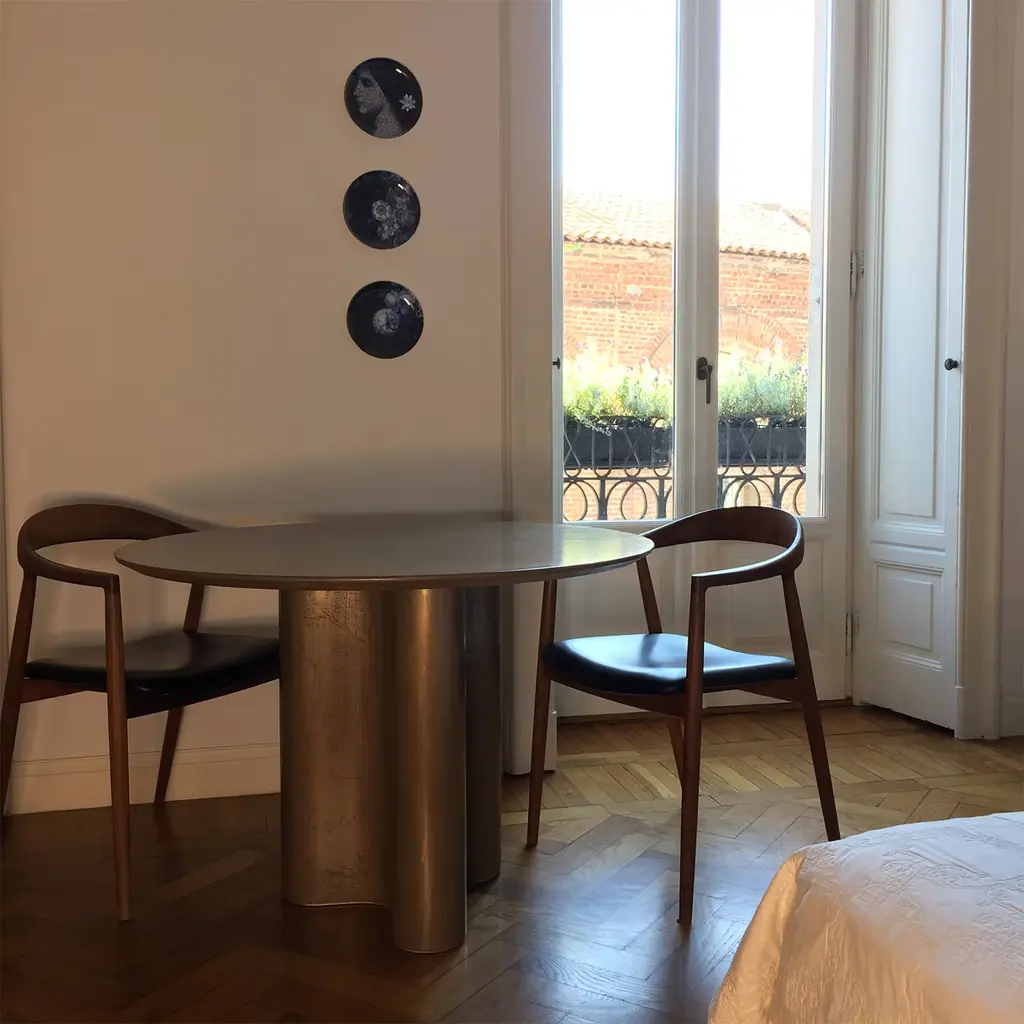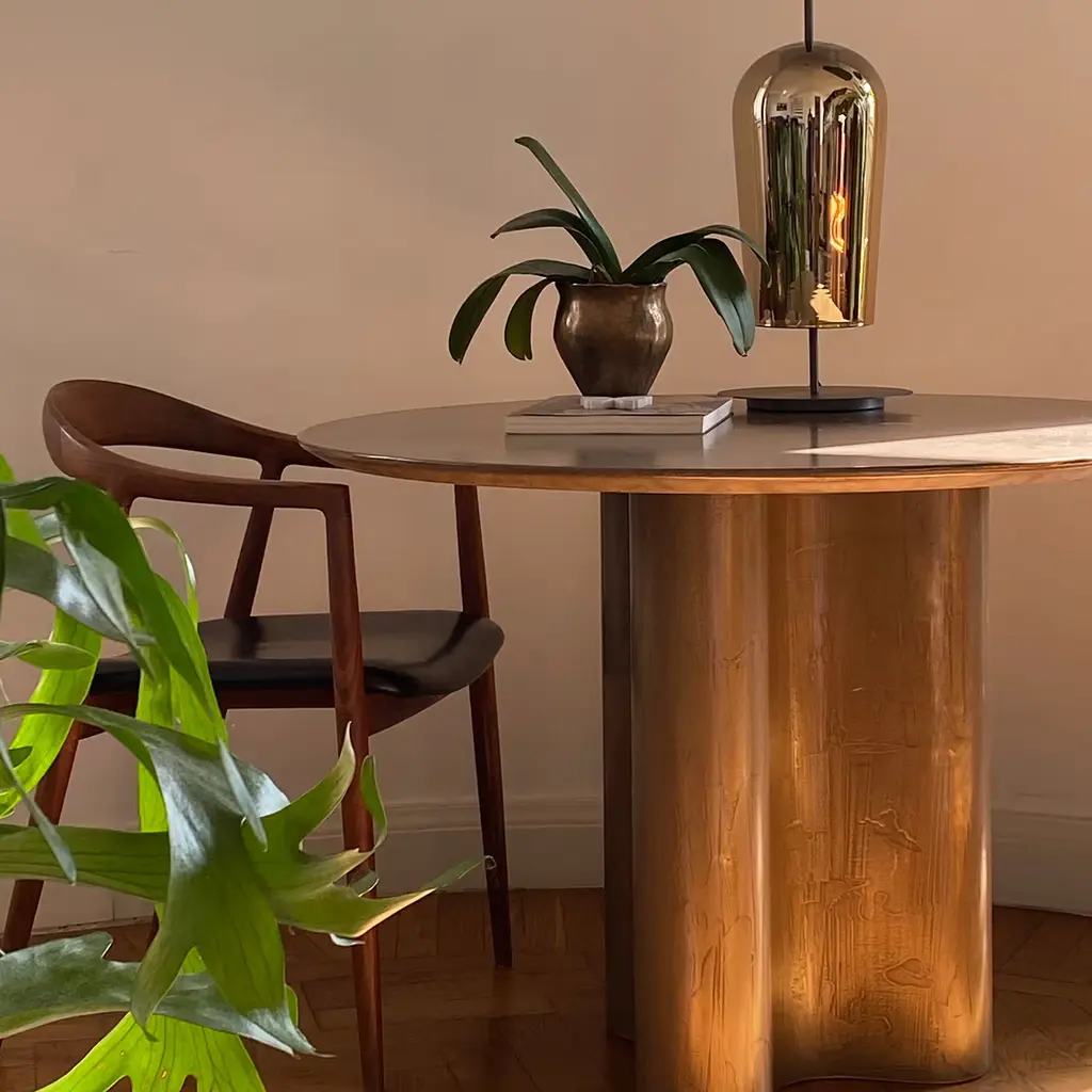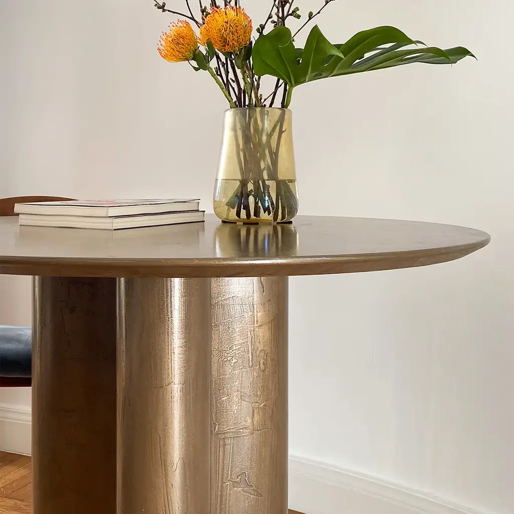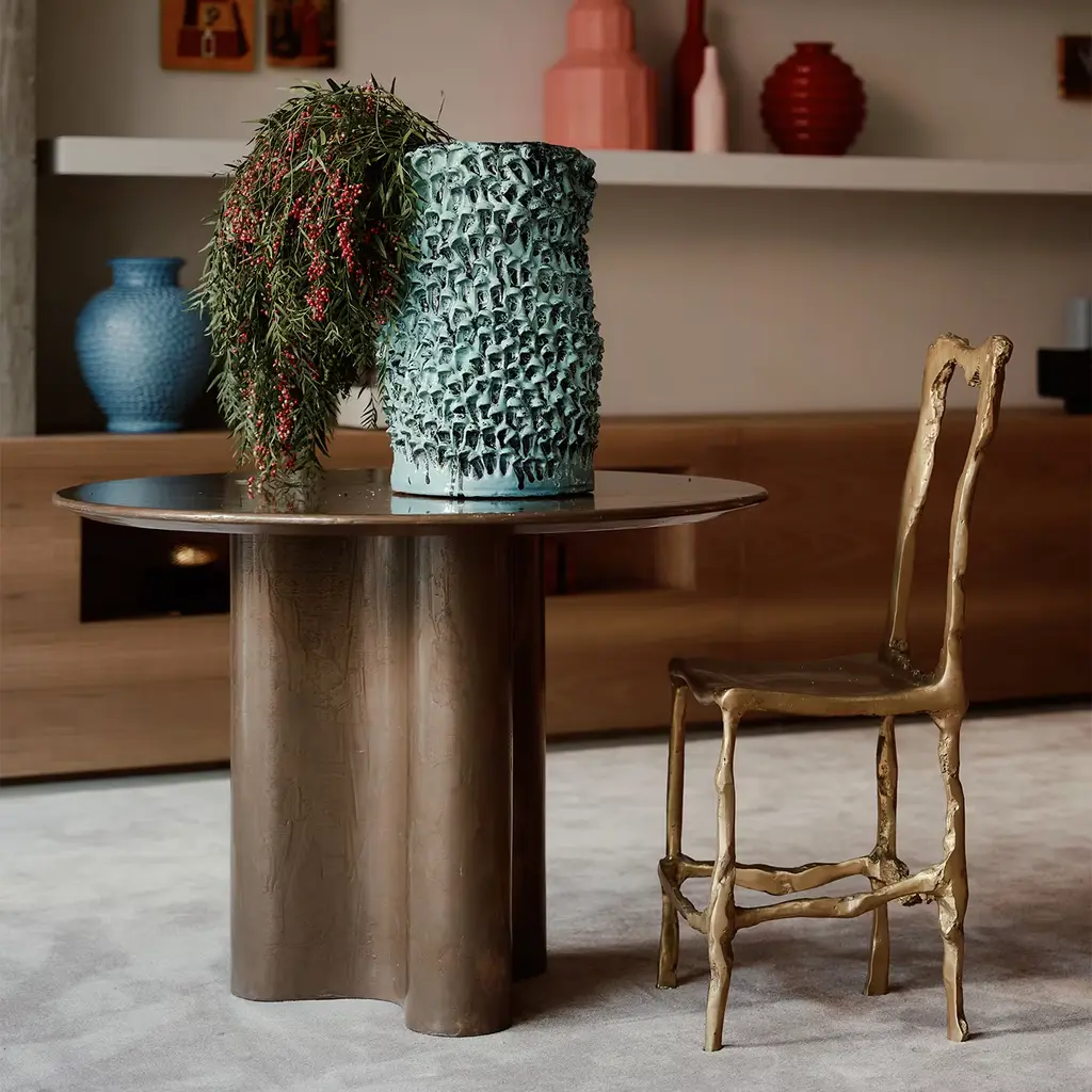 Subtle, elegant, and unique. Part of the Giorgia table Collection. Presented in a liquid bronze finish, this materic version, with its discrete golden reflections, makes every room more sophisticated. The new liquid bronze finish is very resistant and entirely handcrafted. Please ask the concierge for customizations options.