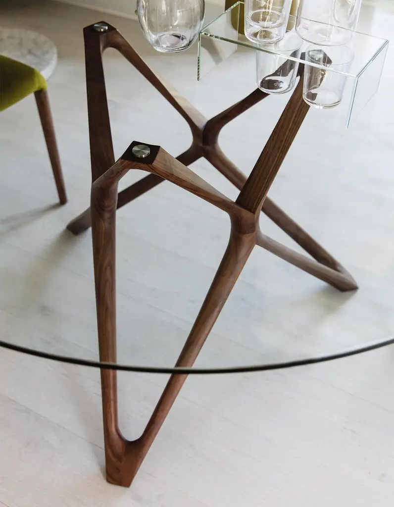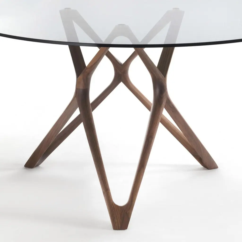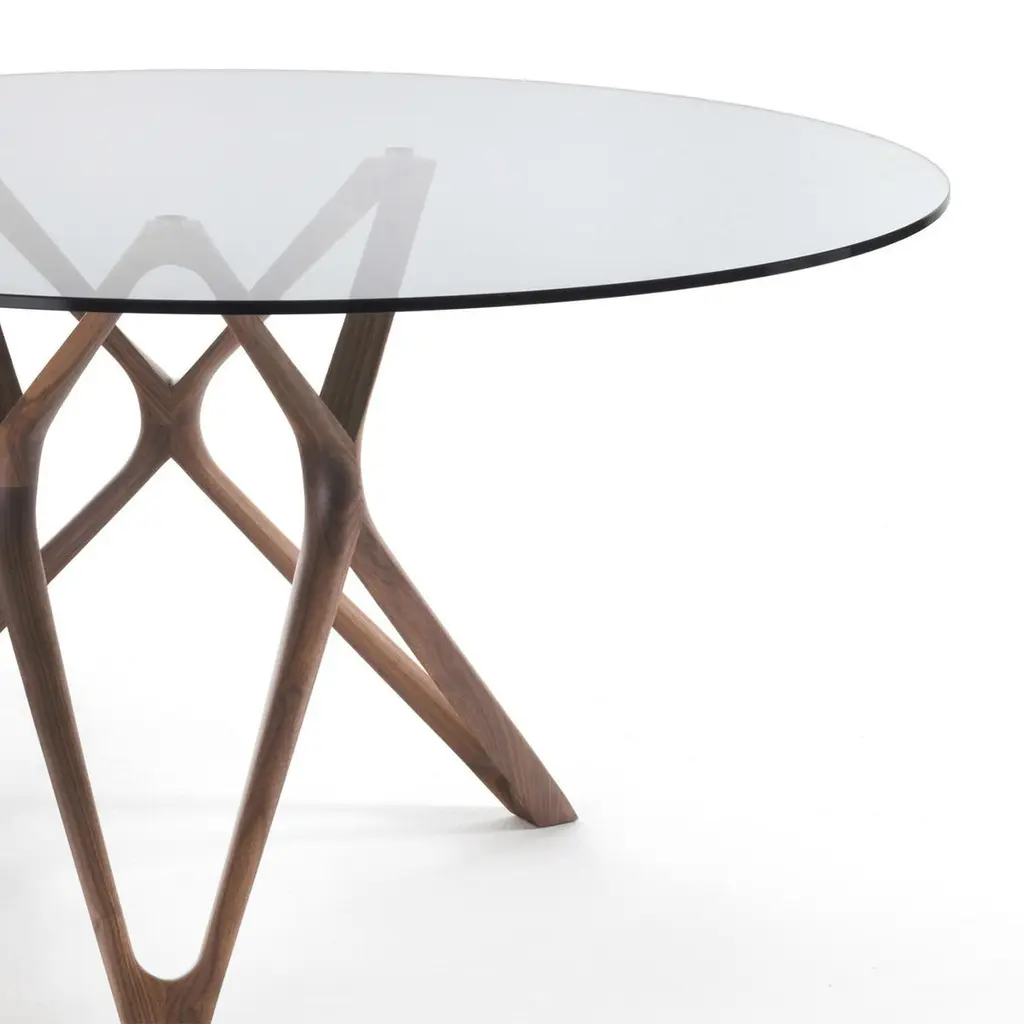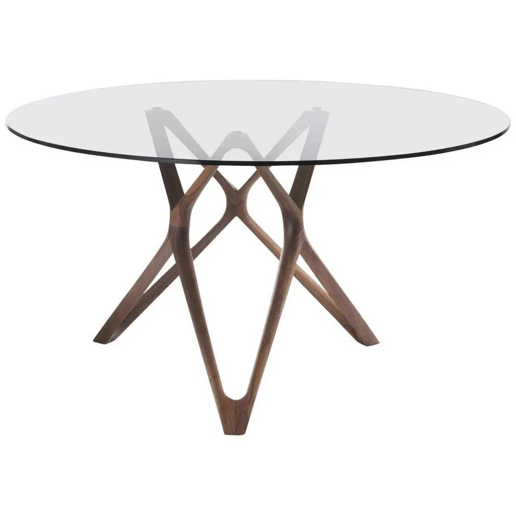 Table Giulia round with base in solid walnut wood,handcrafted wood. With tempered clear glass top(12mm thickness).Available on request in:Diameter 130cm x height 75cm, price: 7100,00€.Diameter 140cm x height 75cm, price: 7300,00€.Diameter 150cm x height 75cm, price: 7700,00€.