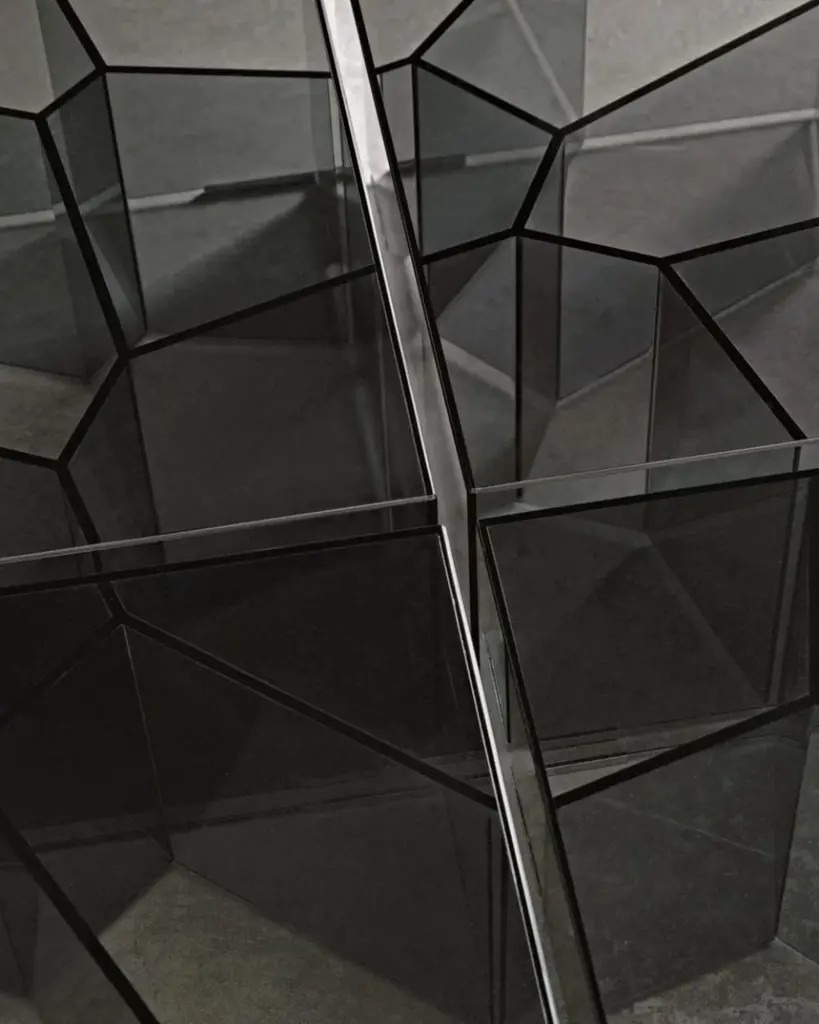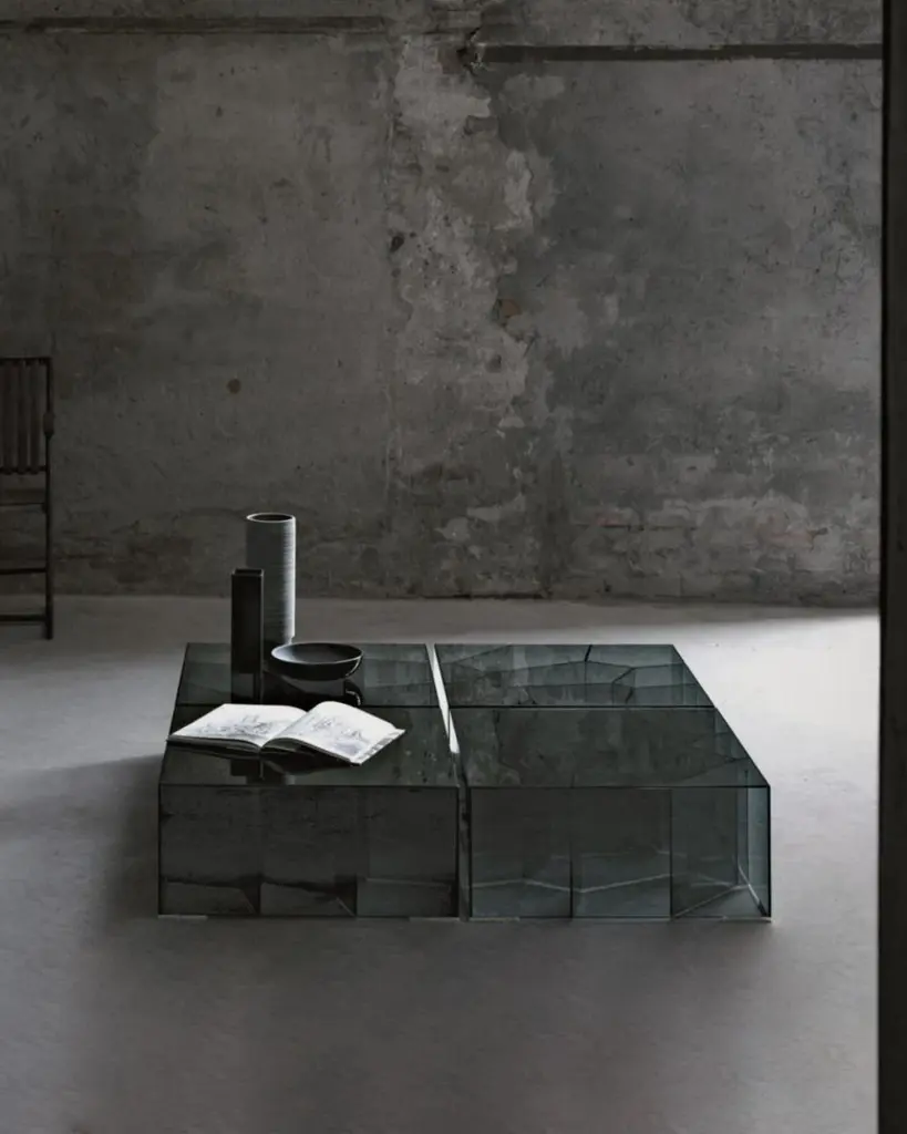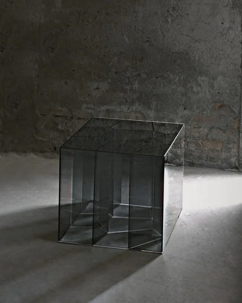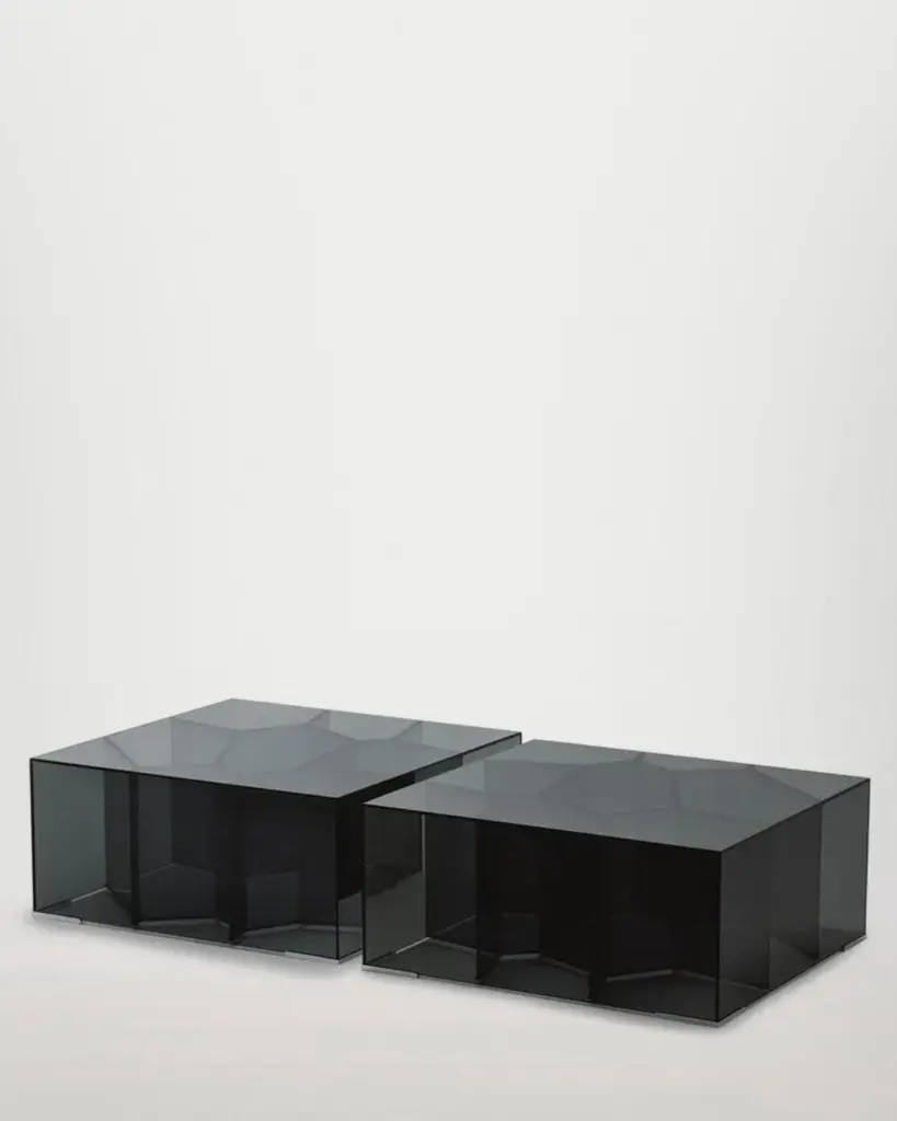 Series of parallelepiped shaped low tables in 6 mm tempered smoked glass, glued 45°, to whose inside contains a complex honeycomb structure. Four little chromiumplated feet slightly raise up the volume from the ground. Available in two different sizes.Available finishes: 501.FumèDIMENSIONS:L60 x W60 x H27 cm