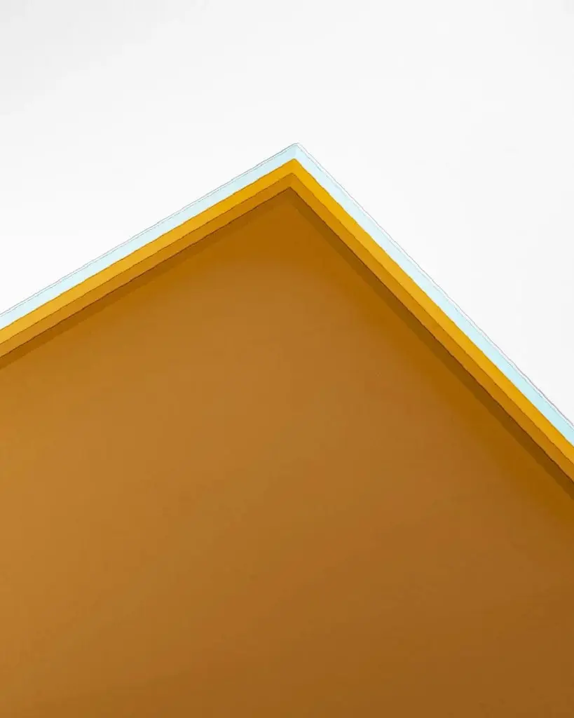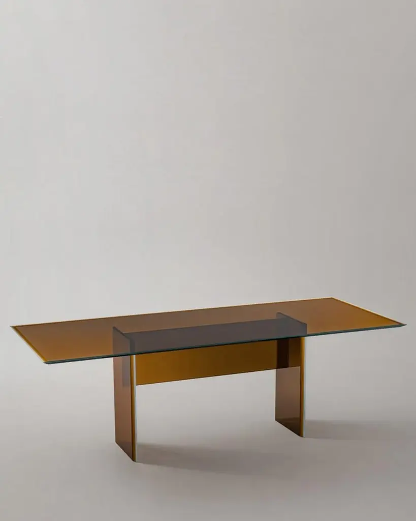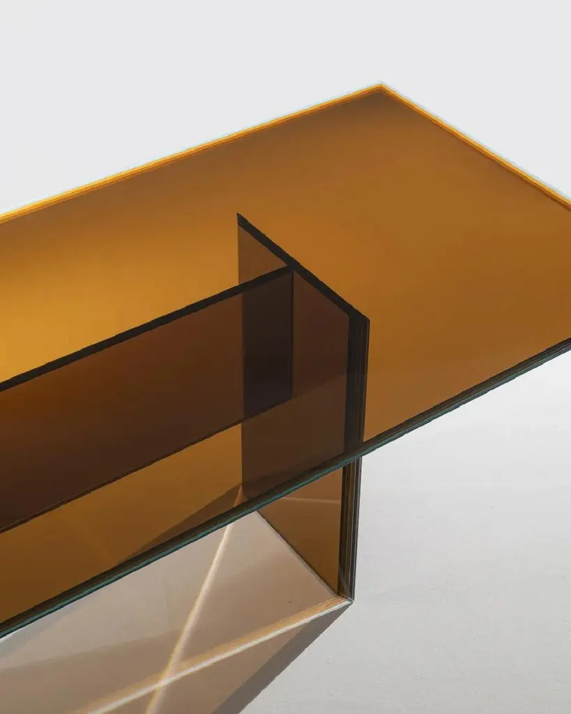 Collection Collection of high tables, low tables and console, made in multi-layered and multichromatic glass, created by laminating five slabs of 5mm extralight glass each with a different coloured film. The obtained glass sheets are in different shapes, shiny ground polished and “faceted” by means of unique bevels accentuating through the transparency of the glass the stunning multicoloured material. The different components are then welded together in total clarity, by means of a special gluing technique, so creating very precious “furniture jewels”.Available finishes: green or ocherDIMENSIONS:L220 W90 H72 cm