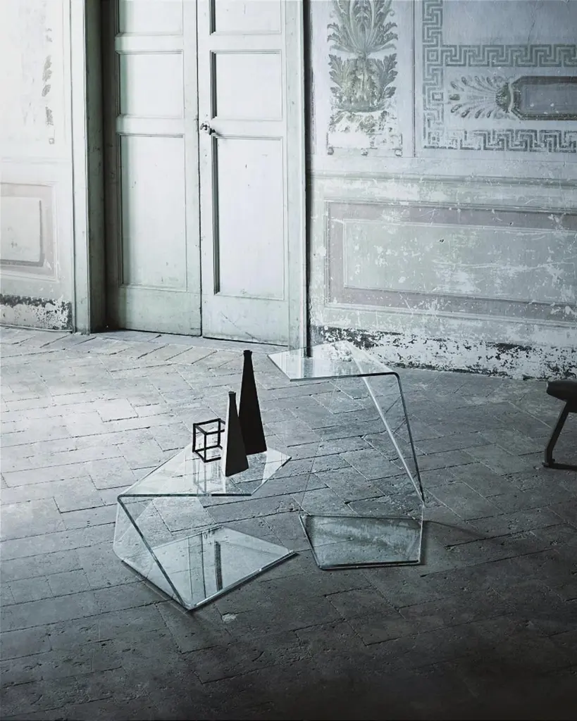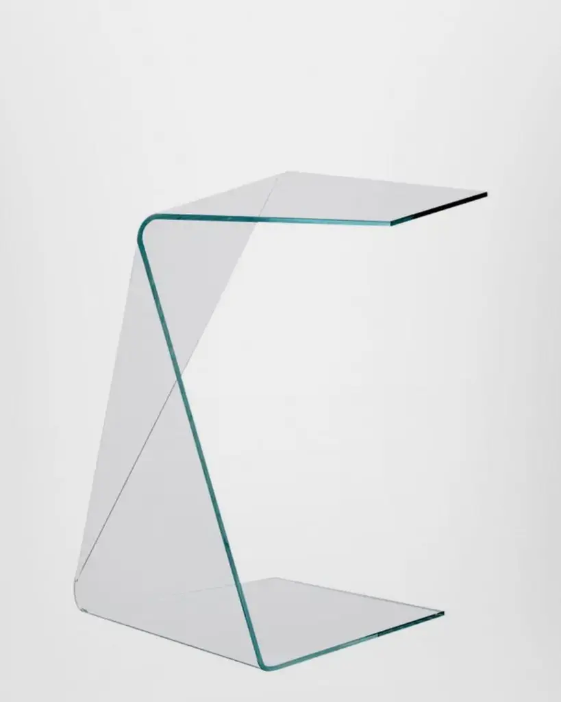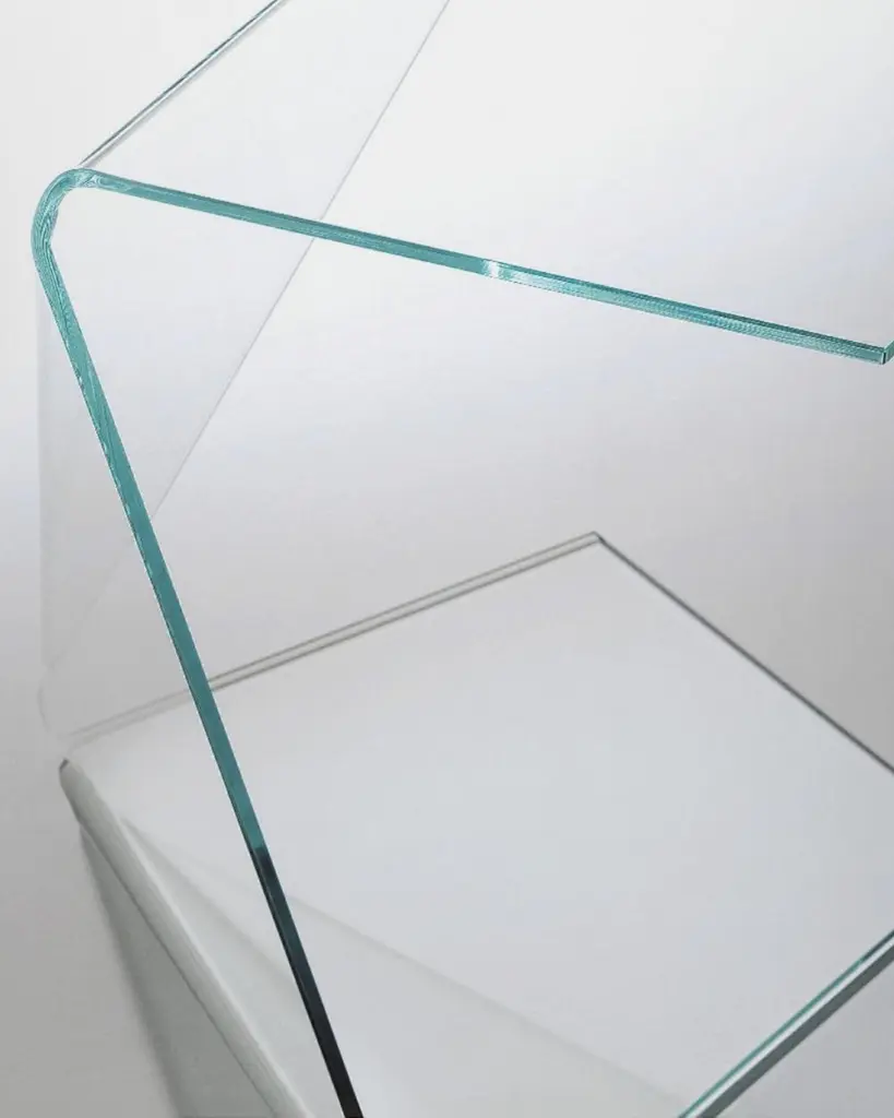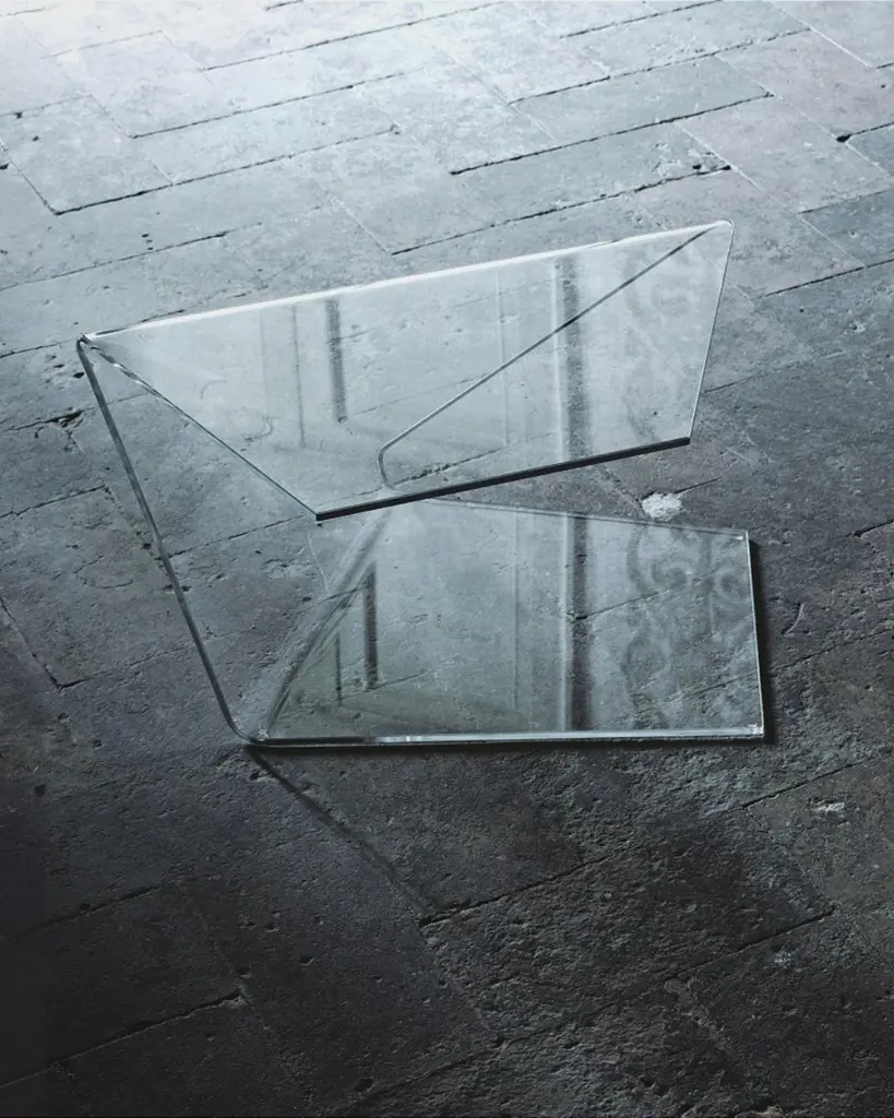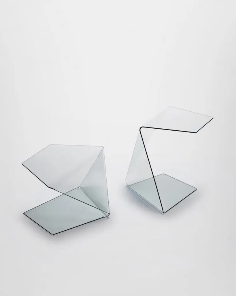 Low tables in extralight transparent glass, available in two different sizes. A complex and innovative curvature, characterized by particularly daring angles and gradients, confers great dynamism and plasticity to the low tables. This technical virtuosity gives the low table an extremely light appearance.Available finishes: 500. ExtralightDIMENSIONS:• Medium - L50 W50 H57 cm• Small - L58 W58 H33 cm