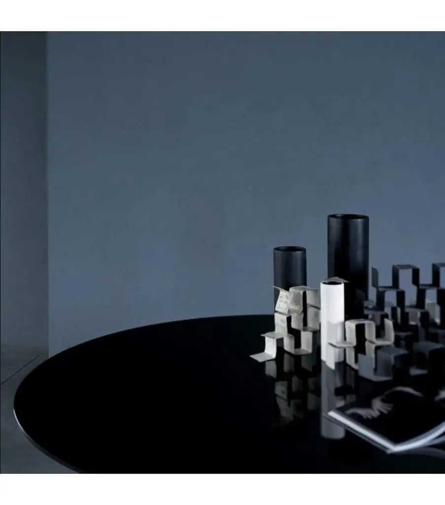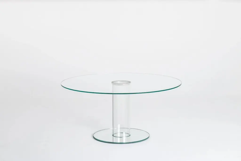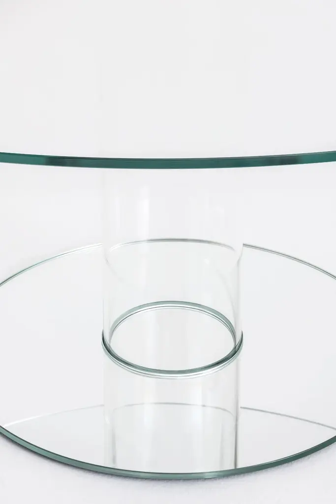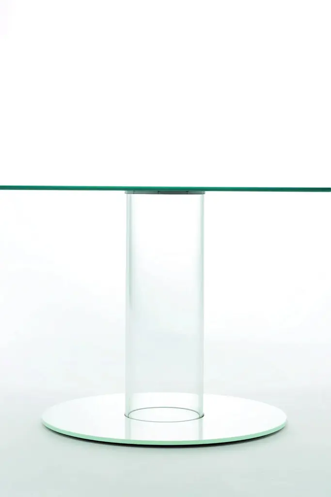 Series of round high tables. The top is tempered glass 12 mm thick is supported by a base composed of a hollow cylinder in borosilicate glass and a foot in 12 mm thick glass providing ballast. The top and the foot are available in glossy or opaque lacquered glass or with transparent extralight top and foot in extralight mirror. The top can be disassembled and fixed to the base by means of rings in stainless steel anodized aluminum. The version with extralight top and mirroring foot is also available with a mirroring cylinder with fading from bottom to top.Available custom made.Finishes:• Glossy lacquered glass• Opaque lacquered glass• Transparent extralight glass• Extralight• Mirror• Specchio TitanioDIMENSIONS: • Small: Ø140×72• Medium: Ø150×72• Large: Ø160×72• X-Large: Ø170×72• XX-Large: Ø180×72Price refers to the large version.