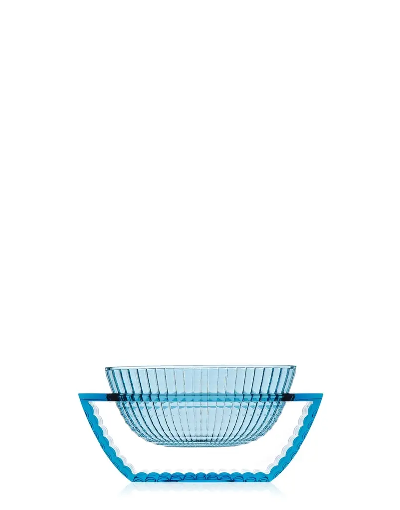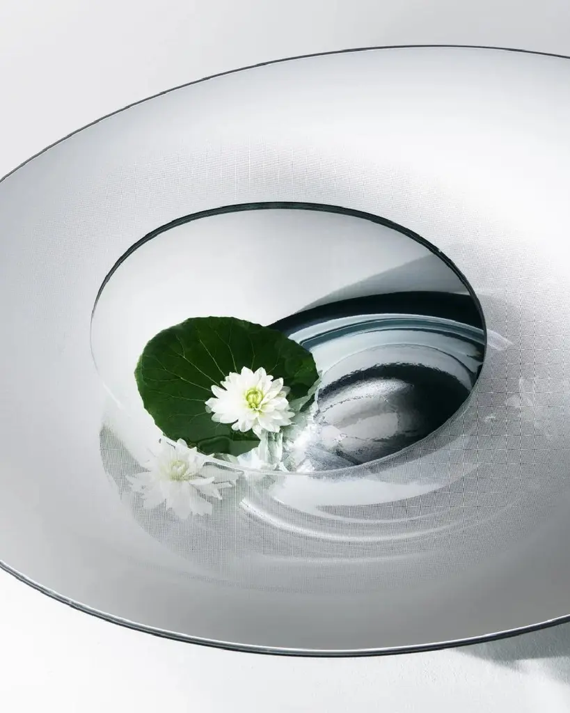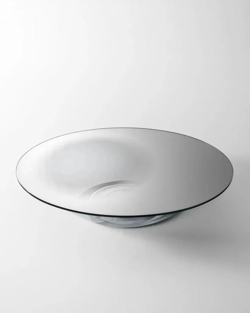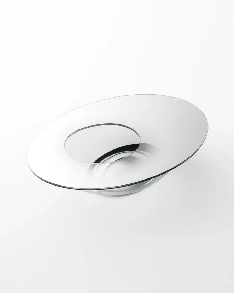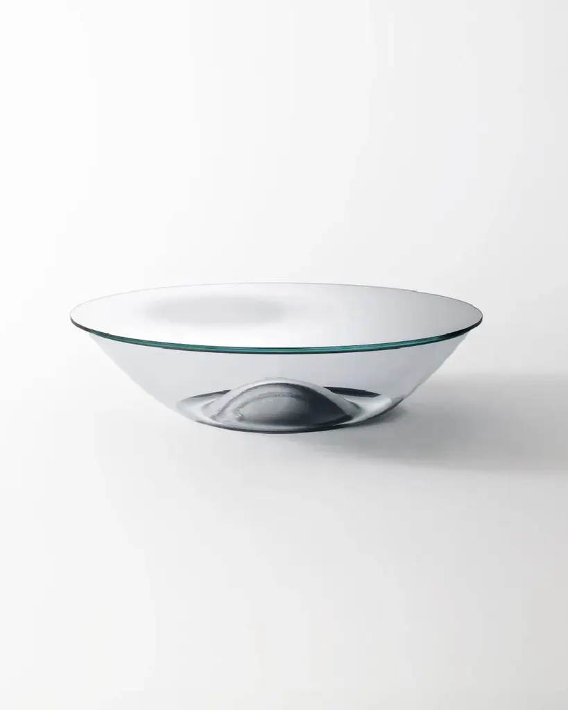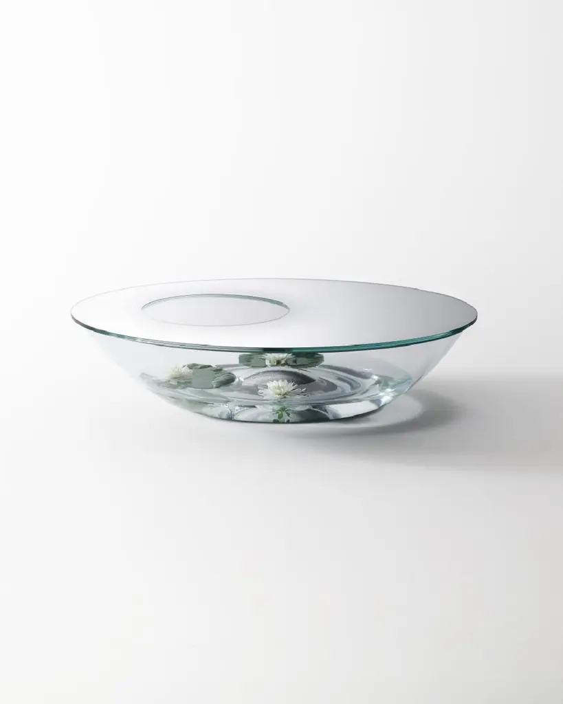 Nacre is a low table with a fluid aspect inspired by the organic form of an oyster shell. The base, made up of an oval basin in transparent extralight glass with mirrored bottom, is created by moulding a flat slab of 12 mm glass through a complex heat treatment and trimming the perimeter to shape. The top, placed on the basin, is in laminated glass 6+6 mm in extralight mirror finish which fades in a circular way, emphasizing the transparent round area. The top is also available with an opening next to the transparent area, through which you can access the inside of the basin, and use it as flower box, terrarium (planter) or storage/display unit.QUICK SHIP: NAC01 with holeDIMENSIONS:L128 W92 H37 cm
