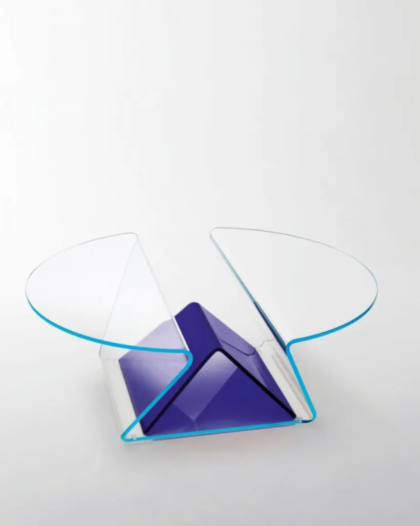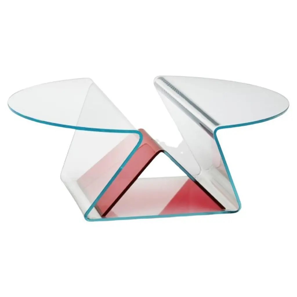 Extremely functional low table with a light aspect and soft and gentle shapes in 12 mm extralight glass, shaped and curved thanks to a complex process of glass bending, obtaining two cantilevered tops separated by a practical compartment where objects can be stored. Positioned in the centre is a functional magazine rack element made of curved glass with a reversed "V" shape, available in the transparent colours ruby red, blue, emerald green or transparent extralight.Available in different options:Finish:• Extralight • Ruby Red• Blue• Emerald greenDIMENSIONS:Ø100 H40 cm