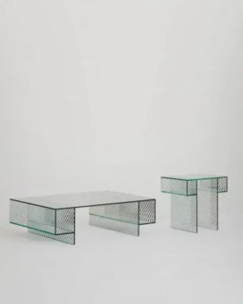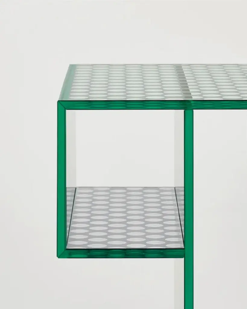 Collection of low tables, consoles and storage furniture, completely created from a special double-sided mirrored glass, with a decorative pattern made from round transparent marks, simulating a perforated metal sheet. All the glass is tempered and UV bonded. The two doors are opened and closed with a push-pull system.DIMENSIONS:• Small: L120 W85 H35 cm• Medium: L112 W112 H35 cmPrice refers to the small version.