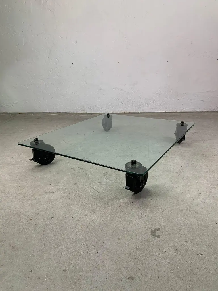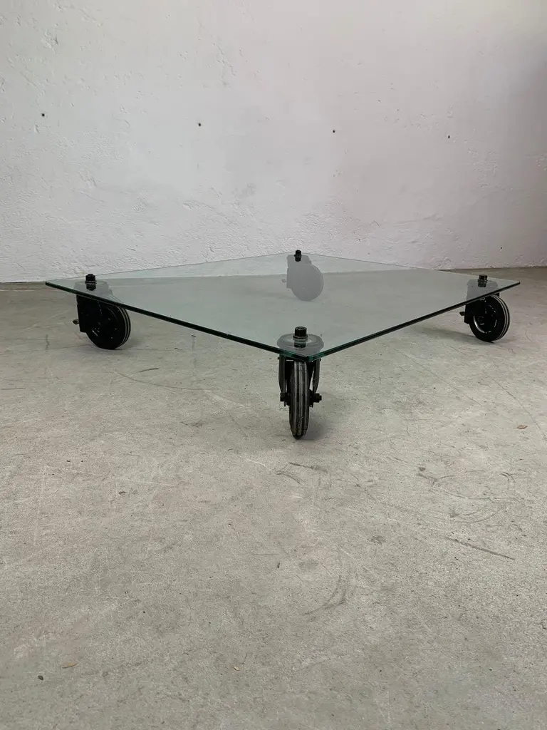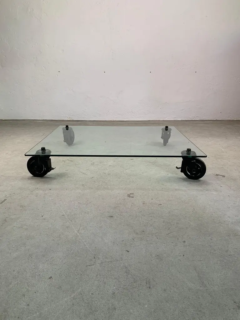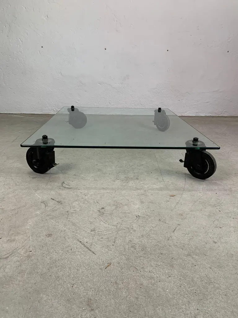 Low table by Gae Aulenti for Fontana Arte, 1970s Iconic low table with wheels, glass top and painted metal forks. Designed by Gae Aulenti for Fontana Arte.Good condition, signs of time visible in photo.Write us for further information