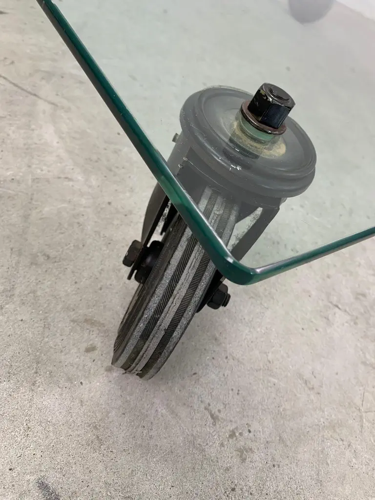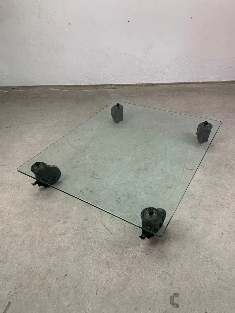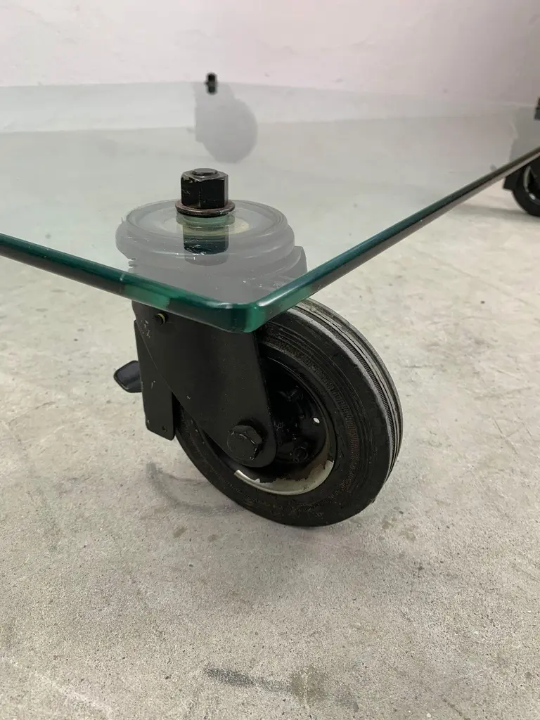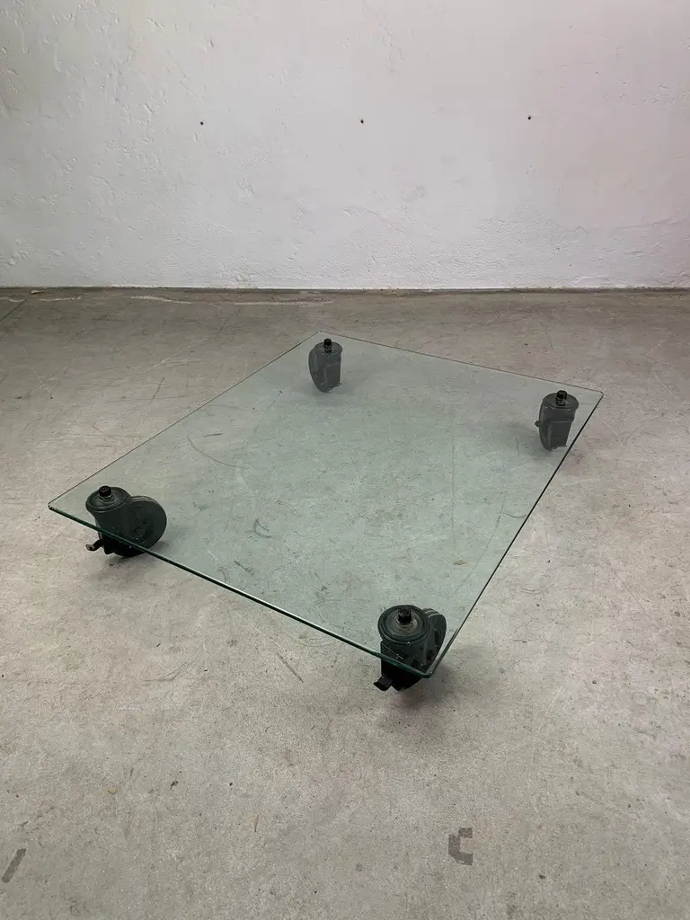 Low table by Gae Aulenti for Fontana Arte, 1970s Iconic low table with wheels, glass top and painted metal forks. Designed by Gae Aulenti for Fontana Arte.Good condition, signs of time visible in photo.Write us for further information