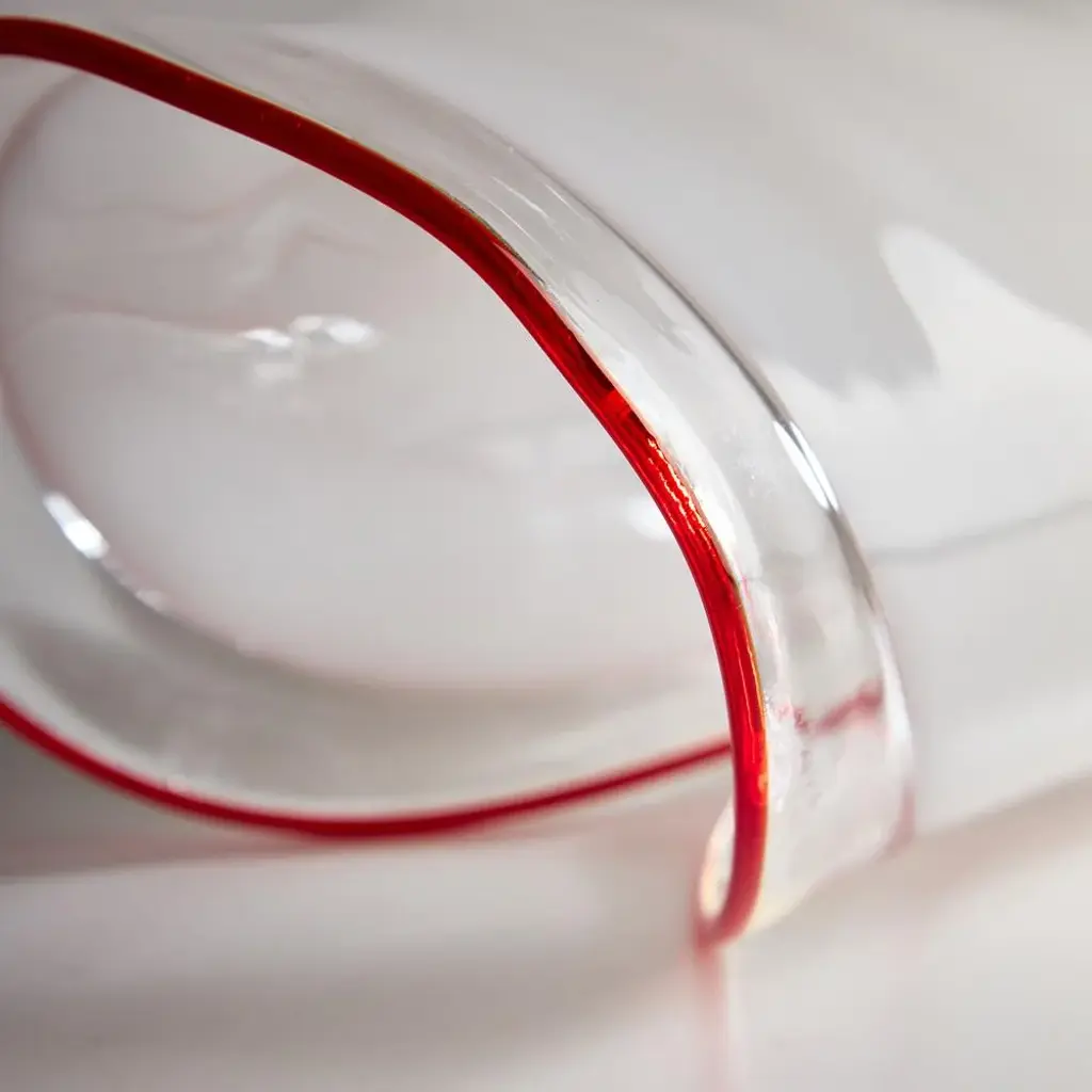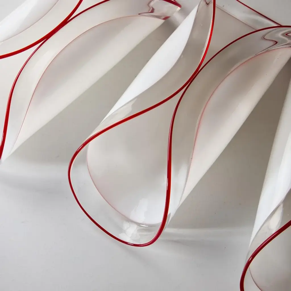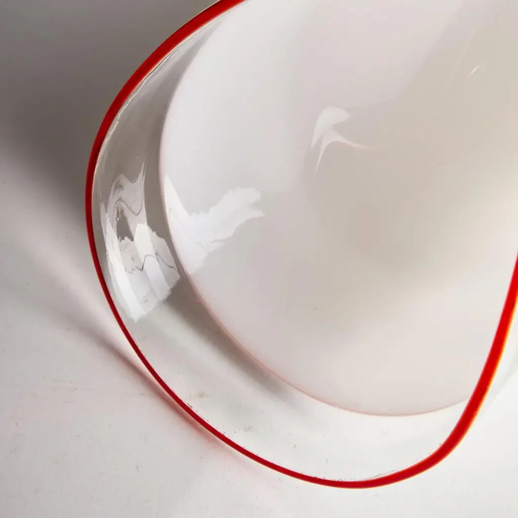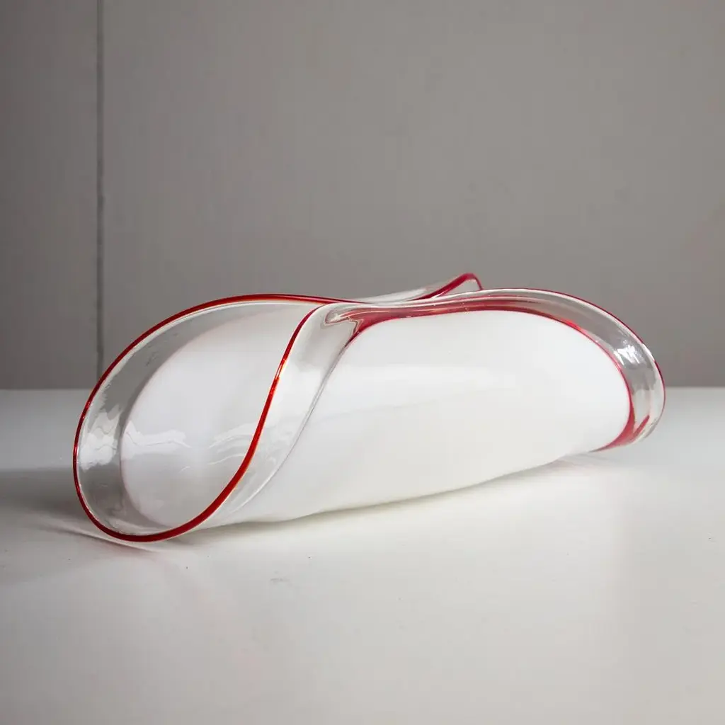 Introducing the Leucos Glass Table Decor, a stunning centerpiece that effortlessly elevates any space with its unique elegance. Each piece is meticulously handcrafted in Italy, ensuring that no two items are exactly alike. The decor features a distinctive folded design that creates a captivating visual dynamic, while the striking red stripes along the edges add a bold pop of color. Its incredibly lightweight construction makes it easy to move and rearrange, allowing for versatile styling options. with its refined aesthetic and artisanal craftsmanship, the Leucos Glass Table Decor is not just an accessory; it’s a statement piece that embodies sophistication and individuality. This piece is attributed to the mentioned designer/maker. It has no attribution mark and no official proof of authenticity, however it is well documented in design history. I take full responsibility for any authenticity issues arising from misattribution