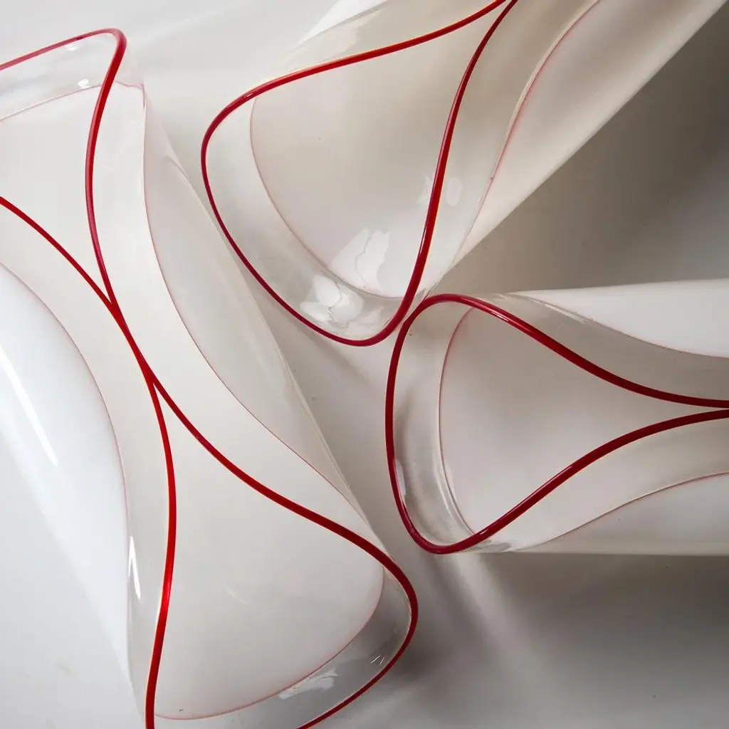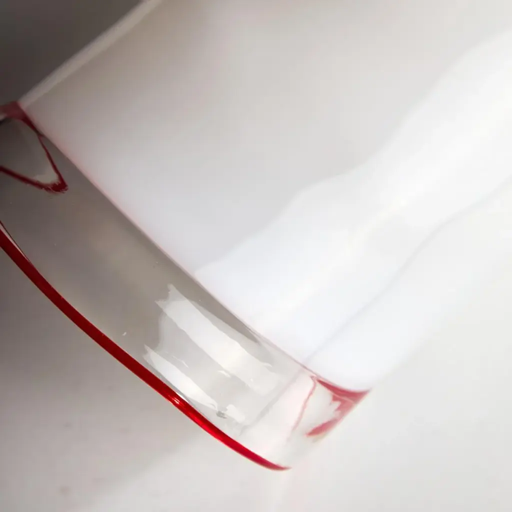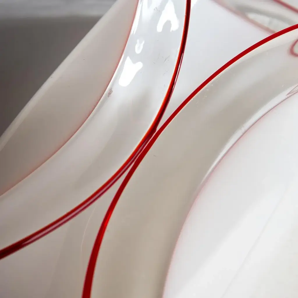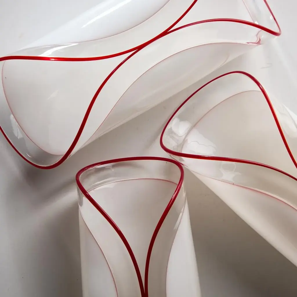 Introducing the Leucos Glass Table Decor, a stunning centerpiece that effortlessly elevates any space with its unique elegance. Each piece is meticulously handcrafted in Italy, ensuring that no two items are exactly alike. The decor features a distinctive folded design that creates a captivating visual dynamic, while the striking red stripes along the edges add a bold pop of color. Its incredibly lightweight construction makes it easy to move and rearrange, allowing for versatile styling options. with its refined aesthetic and artisanal craftsmanship, the Leucos Glass Table Decor is not just an accessory; it’s a statement piece that embodies sophistication and individuality. This piece is attributed to the mentioned designer/maker. It has no attribution mark and no official proof of authenticity, however it is well documented in design history. I take full responsibility for any authenticity issues arising from misattribution