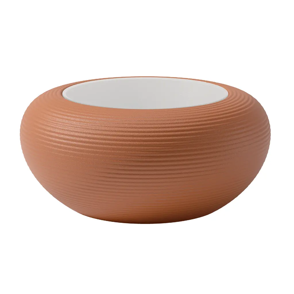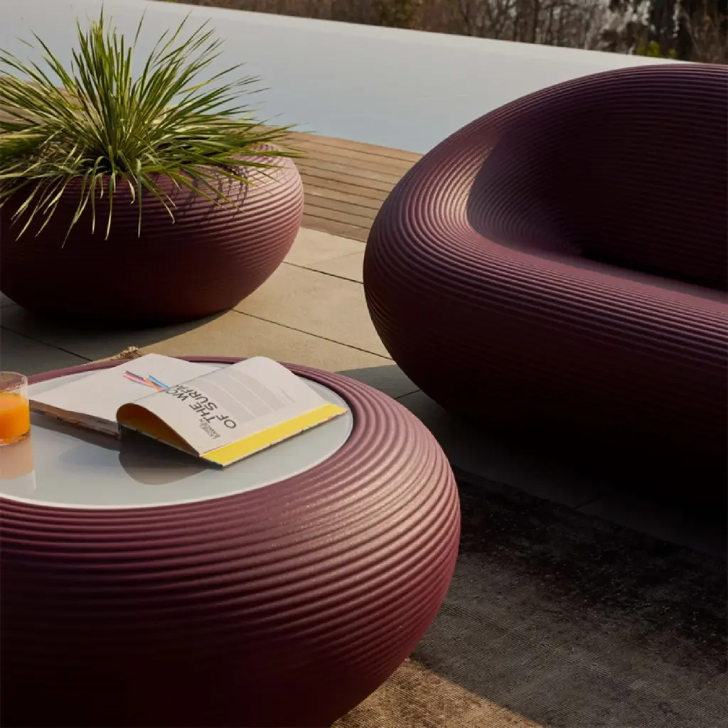 Introducing the luxurious Qeeboo Nami Low Table. Made with a round body of recyclable polyethylene, it boasts a painted glass top in six stunning color options. Choose from uniform hues or unique blends created through eco-friendly recycling processes. Elevate your space with this exclusive piece of artful design.