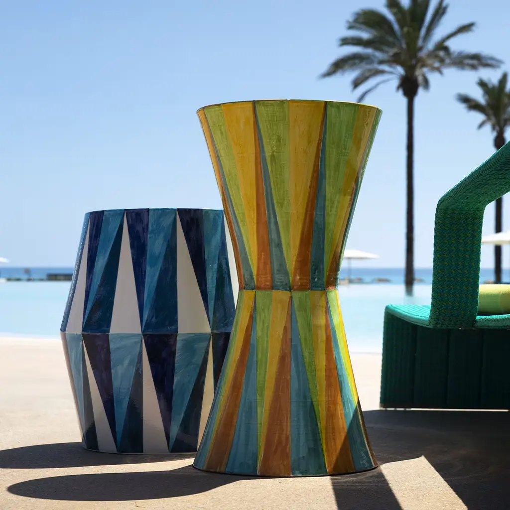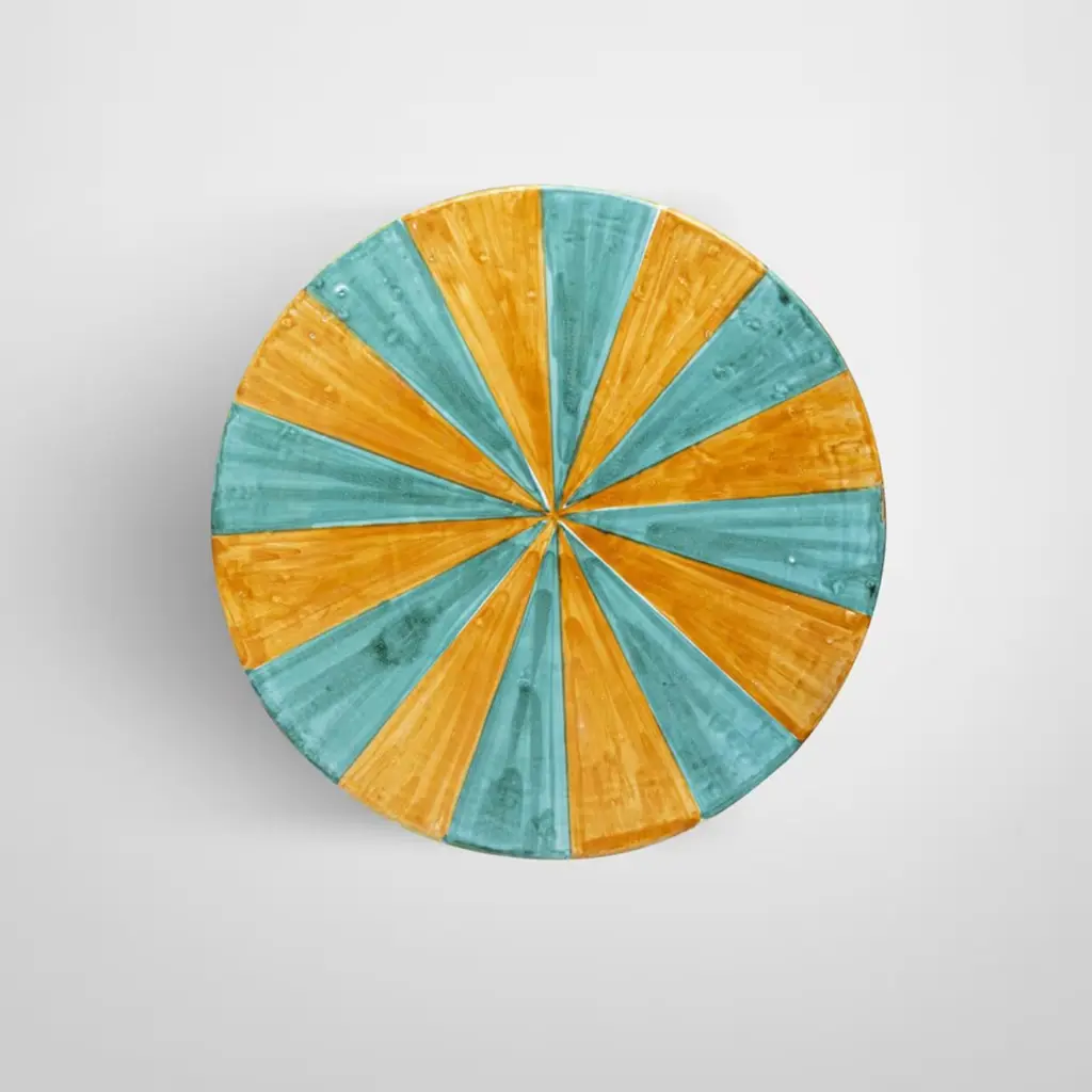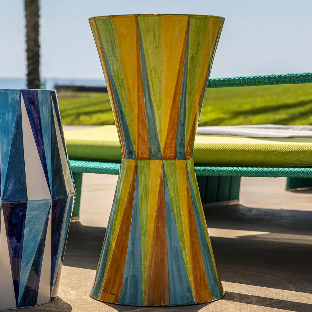 Radiating with a captivating blend of yellow, orange, and blue rhombus-shaped motifs, this glossy geometric table mesmerizes with its striking contrast and allure. Its drum-like shape evokes the musical instrument, offering a canvas for unique creativity and imaginative exploration. A true embodiment of conviviality, where precise geometric lines intertwine with traditional fantasies, composing a visual symphony that celebrates Sicily's timeless allure.