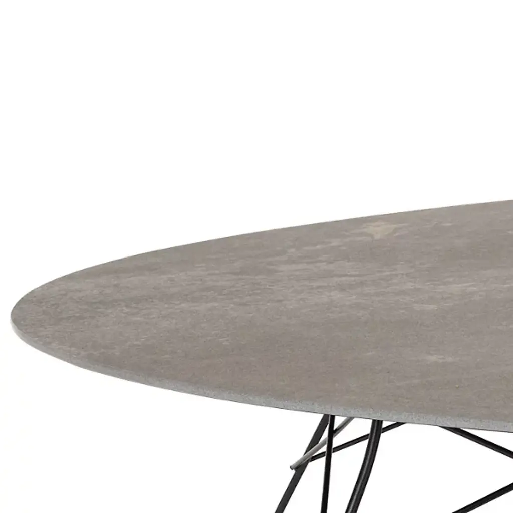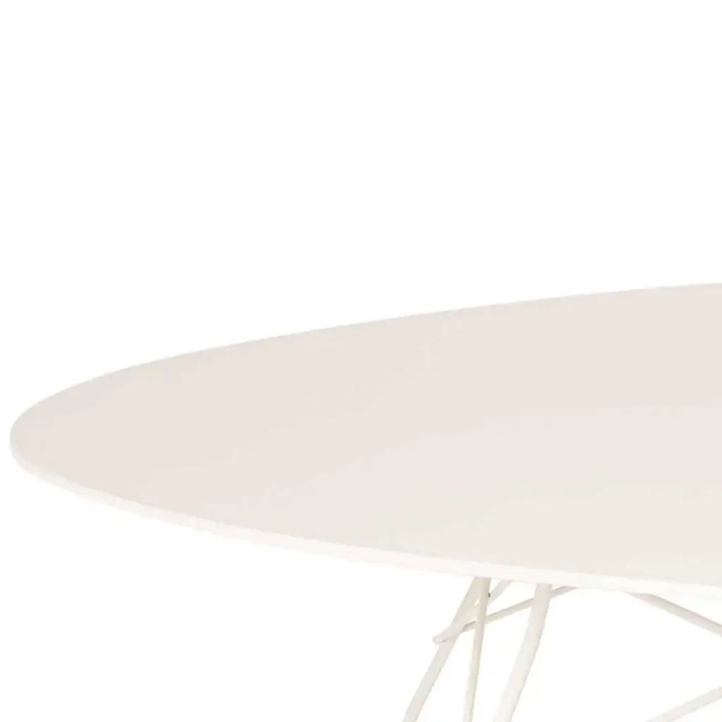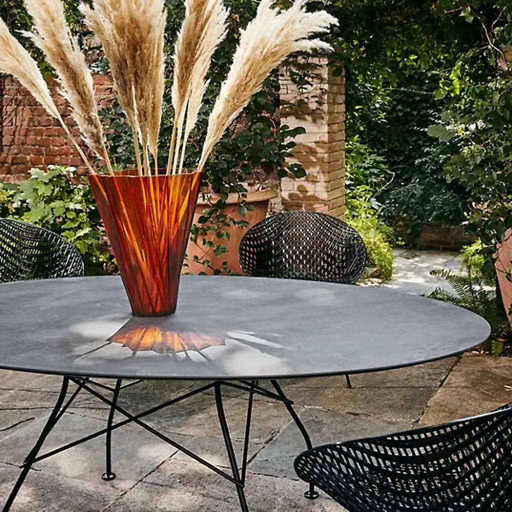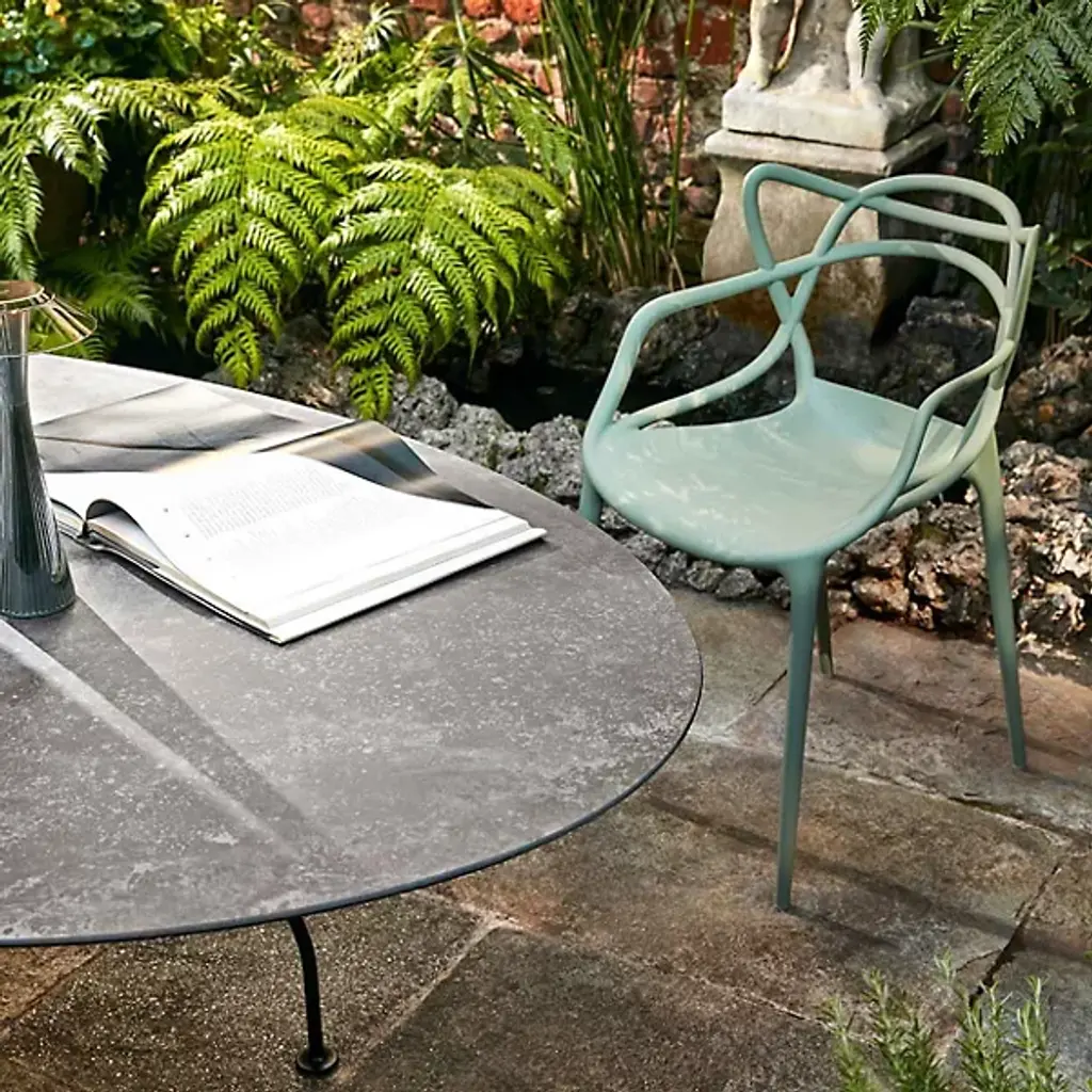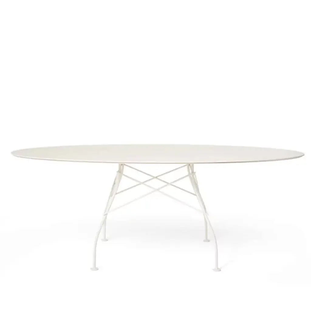 An elegant, expansive offering that forms the center of every gathering. A stylish design from the minds of Antonio Citterio and Oliver Low, the Glossy Outdoor Oval Table from Kartell rises from four slender, strong steel legs with disc bases, ascending to a slim, outward-stepping tabletop of stoneware. The legs are held in place by an array of slender crossbars that add depth and rigidity to the table’s form, while the natural variations in the stoneware add a robust attitude to outdoor spaces while leaving enough refinement for indoor use as well.