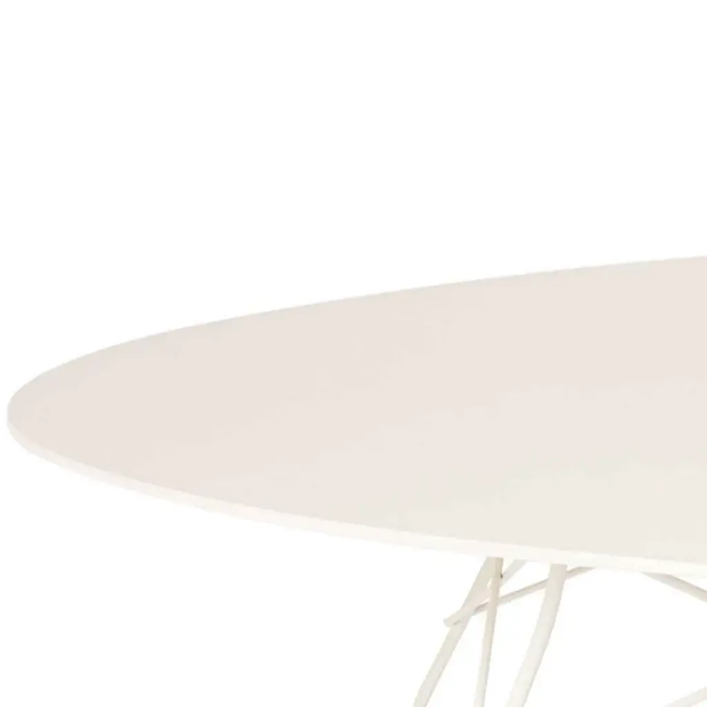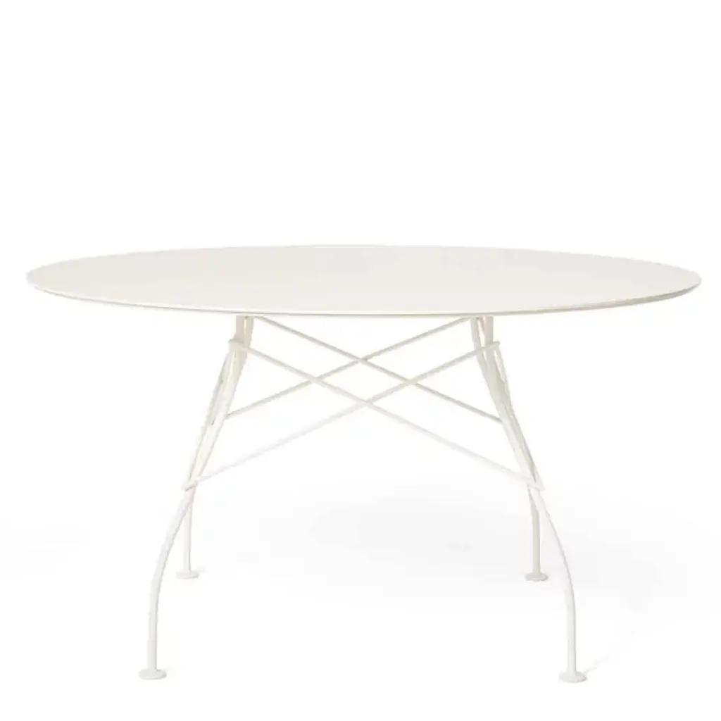 Smooth, open, and effortlessly appealing, the Glossy Outdoor Round Table from Kartell offers a refined, contemporary appeal suitable for indoor use and tough enough to resist outdoor conditions. This inspired design collaboration by Antonio Citterio and Oliver Low is secured by a slim, strong frame of painted, cross-braced steel that rises along four slender legs. An upper ring then secures a round disc top of stoneware above, with its textured surface contrasting well with the matte-painted steel.