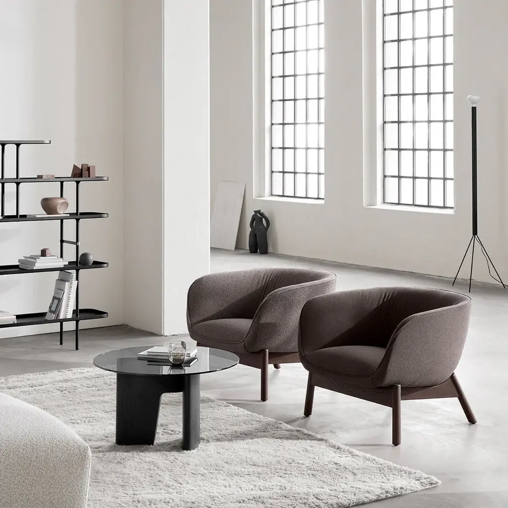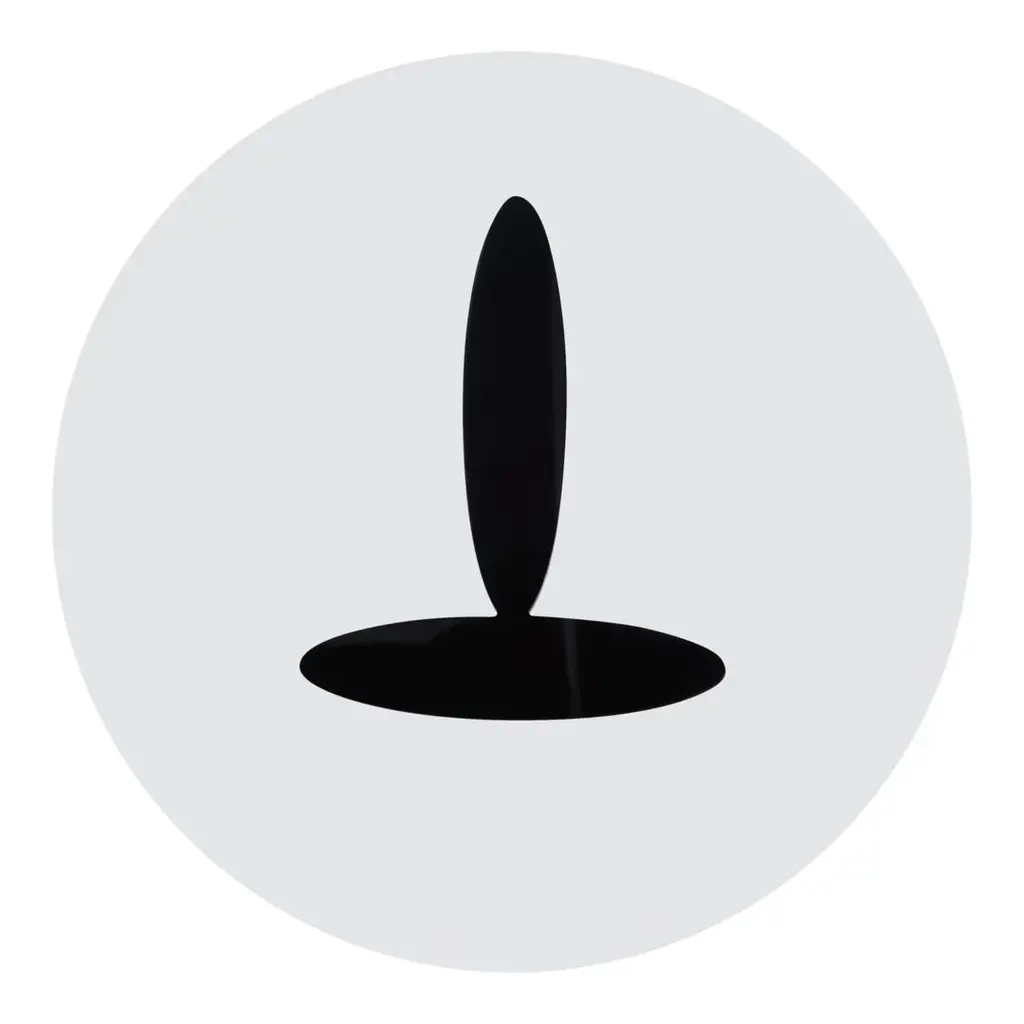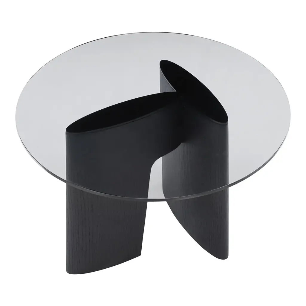 Symbolic, archaic references and a sculptural silhouette define the Glyph Occasional Table. A slightly translucent tabletop in black-tinted glass appears to be floating while revealing the characteristic cross-sectional view of the base components in black-stained oak veneer.