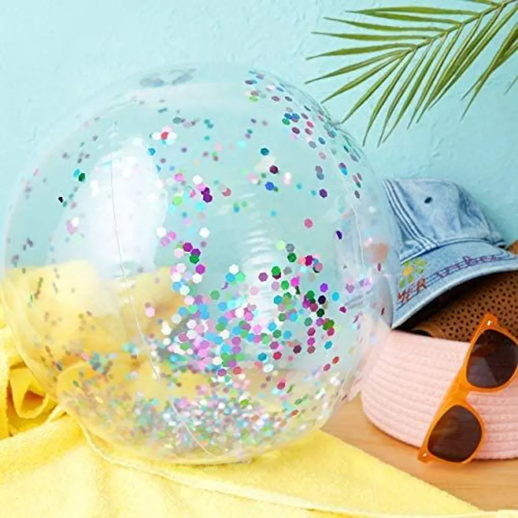 Make the most out of your summer with this set of 2 glitter beach balls! Each clear inflatable beach ball features shimmering glitter confetti inside in blue and turquoise colors. Take the small beach balls with you to the beach or use them for an upcoming pool party and summer bash. The beach balls are made of quality polyvinyl that is easy to inflate and deflate when no longer in use and small enough to store. Each glitter beach ball measures 20 inches in diameter that both kids and adults will enjoy!
