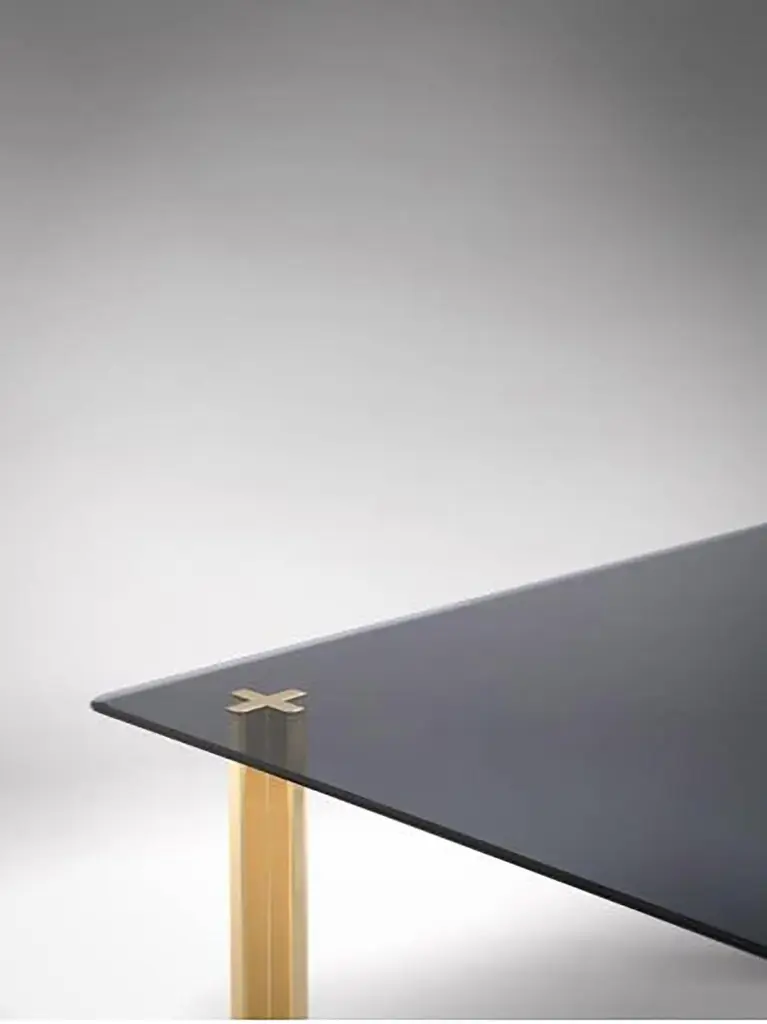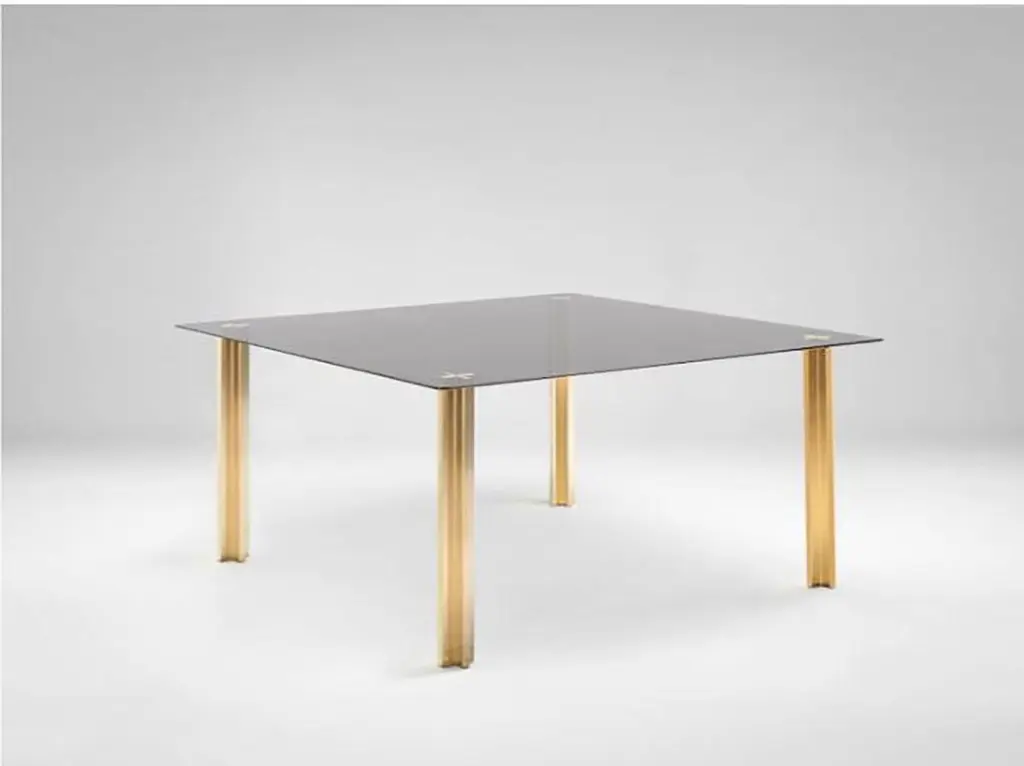 SEM Gold collection, square table with glass top: extra light transparent glass or smoke grey transparent glass (12 mm thick). Plated aluminium legs finished in 24-karat polished or fine brushed yellow gold. The Gold collection has a range of exemplary pieces that echo the past yet embrace the features of architectural modernism perceived as an intellectual, aesthetic and philosophical heritage. An expression of fine Italian craftsmanship and design that contributed to the development of Made in Italy, gold is a tribute to the country's unique heritage.