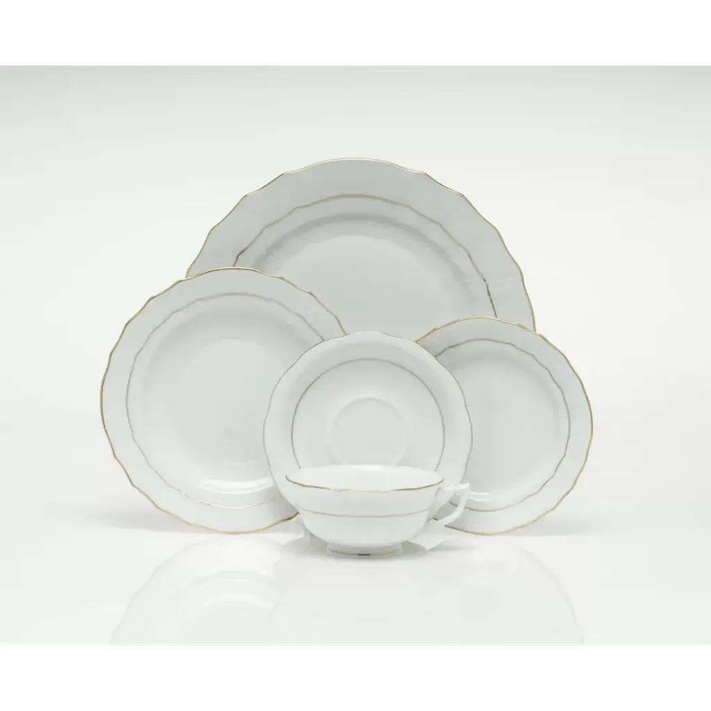 Created for Count Hadik in the early twentieth century, the classic style of Golden Edge celebrates this noble Hungarian family. Janos Hadik served as the president of Herend Porcelain from 1926 to 1933. Hand painted in Hungary. Now the biggest porcelain manufactory in Europe, Herend was founded in 1826 to produce earthenware in the small Hungarian village for which it was named. At the time, Hungary was flooded with low-cost pottery, but in 1839, Mor Fischer became the Manufactory’s new owner and he decided to focus on producing dinnerware replacement pieces for Europe’s royal families to complement their valuable porcelain patterns from Germany and the Far East. As his client base grew, Fischer commissioned his artists to begin designing dinnerware patterns of their own. Queen Victoria’s 1851 purchase of a large set for Windsor Castle was a milestone, setting the stage for aristocrats throughout Europe to clamor for Herend in their estates. In the 1850s, Herend added meticulously-crafted figurines to its creations. Herend’s trademark fishnet pattern, which is widely recognized and prized as Herend’s signature design, started in 1858 when an artist who was intrigued with a Chinese plate’s fish scale design painted it onto a rooster figurine to imitate feathers.