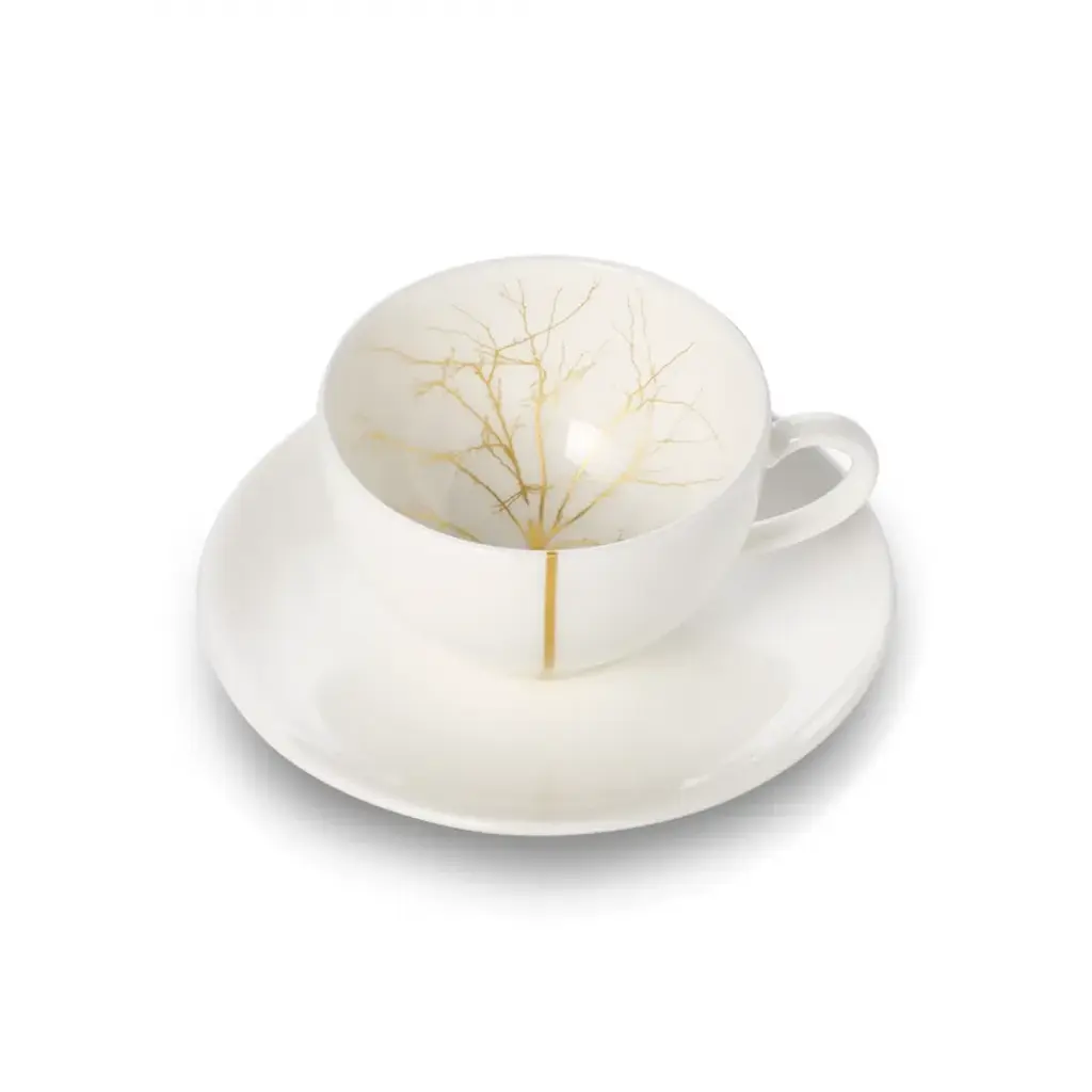 Inspired by nature, modern and individually staged. Various Golden silhouettes of trees branch out tenderly over cups and plates, seem to be natural and abstract at the same time. The trunk continues over the rims of the cups and develops to a graphic element.